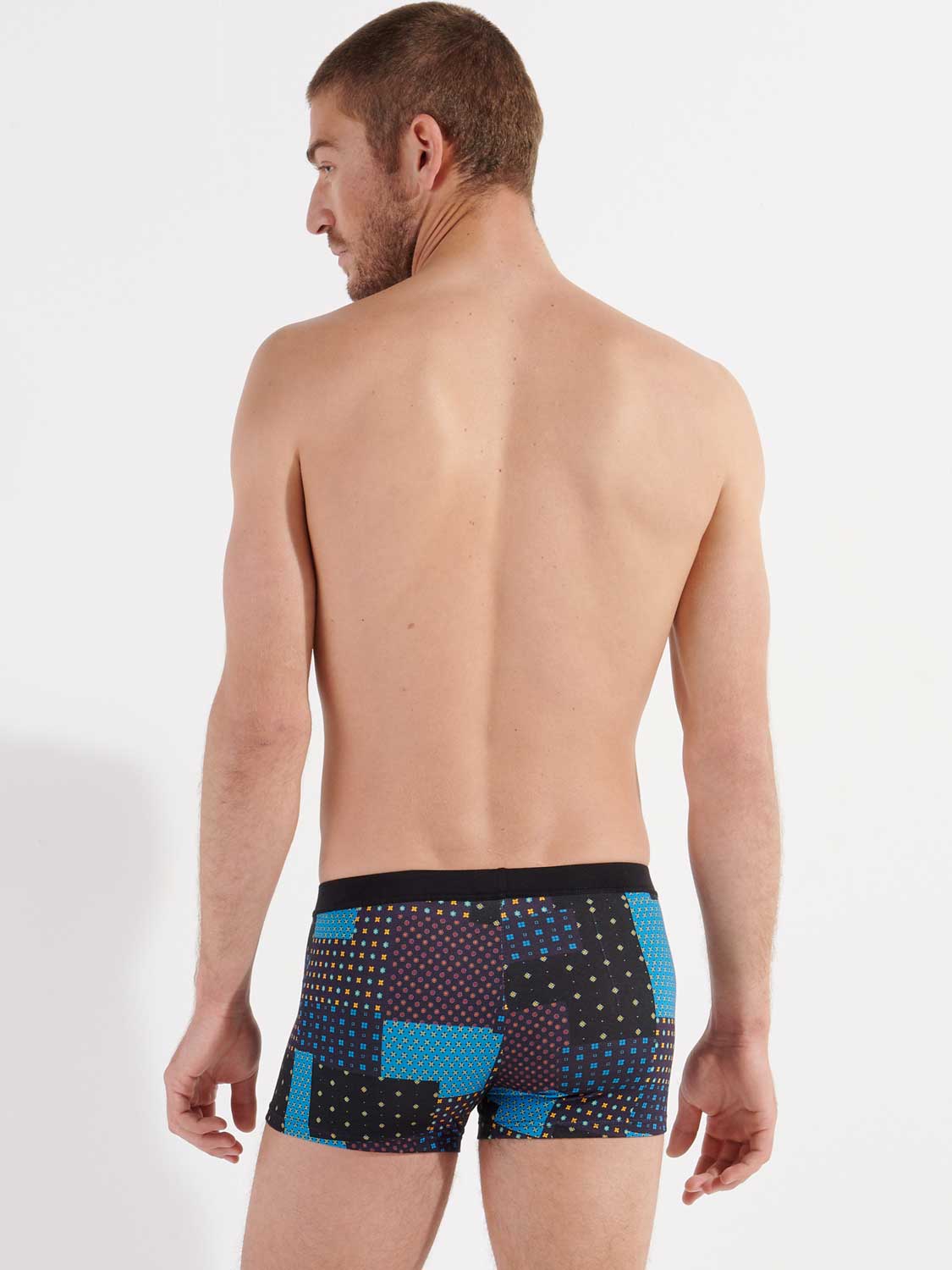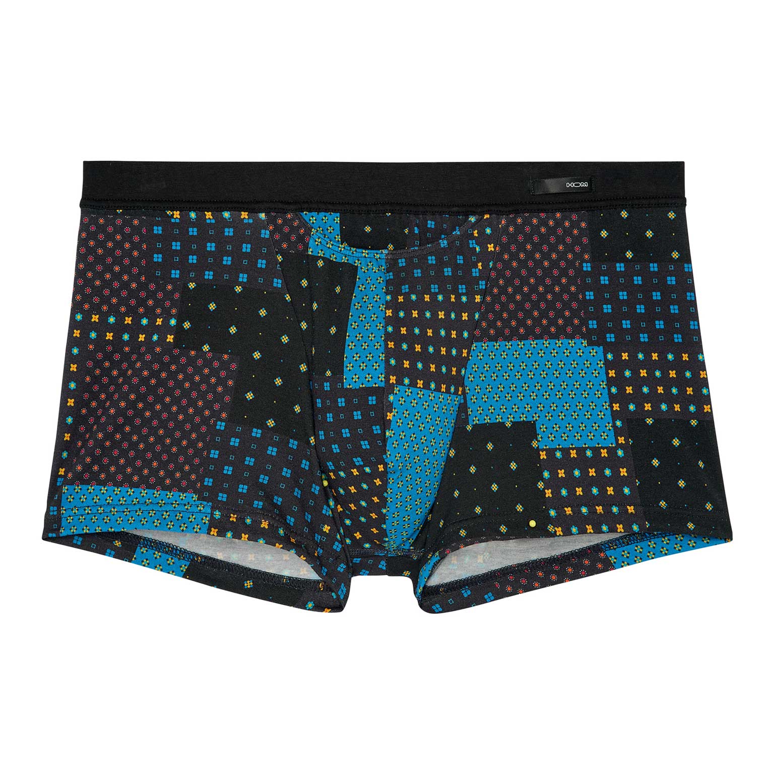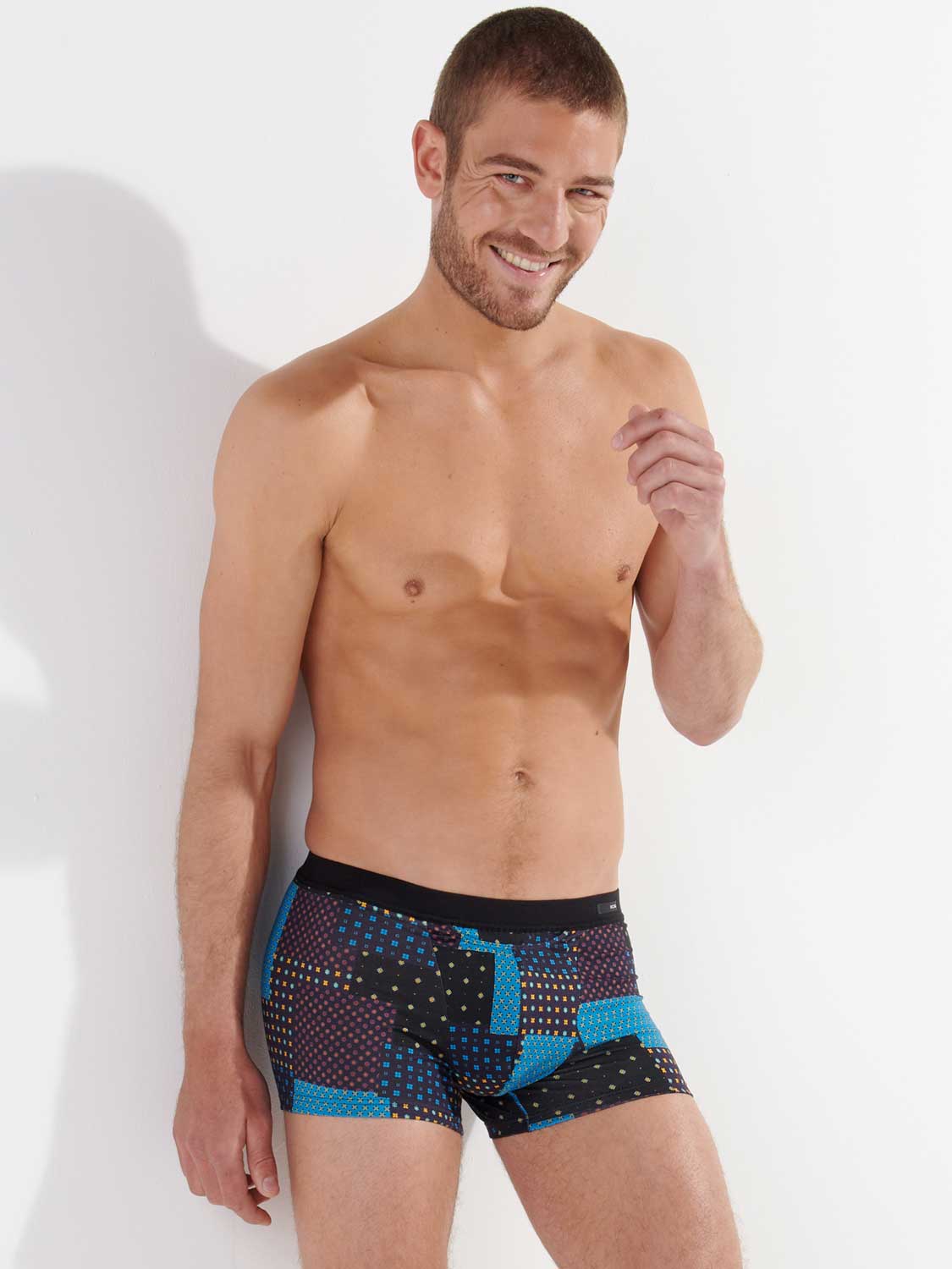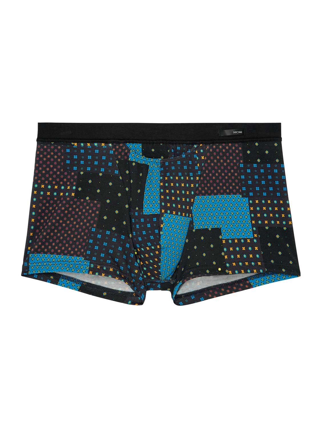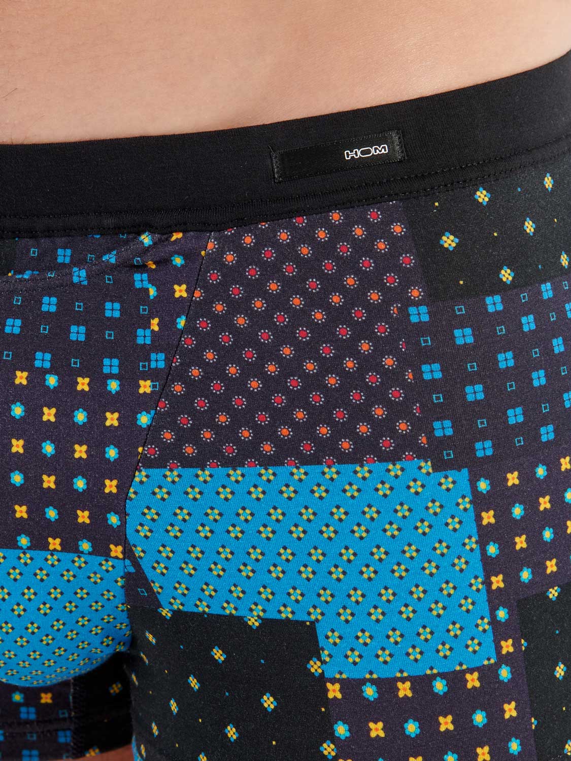 De Alton - HO1 Comfort Boxer Briefs is gemaakt van katoenmodal en uitgevoerd met de 'horizontale opening', de speciale gulp voor extra gemak, waar HOM bekend om staat. Deze heren boxer heeft een elegant en speels patchwork patroon in blauw, marineblauw en zwart met accenten van geel en oranje. De Alton is uitgevoerd met een comfort heupband, waarbij de stof over de elastische band naar binnen is geslagen voor extra comfort. Linksvoor op de comfortband is een klein label van HOM geplaatst.