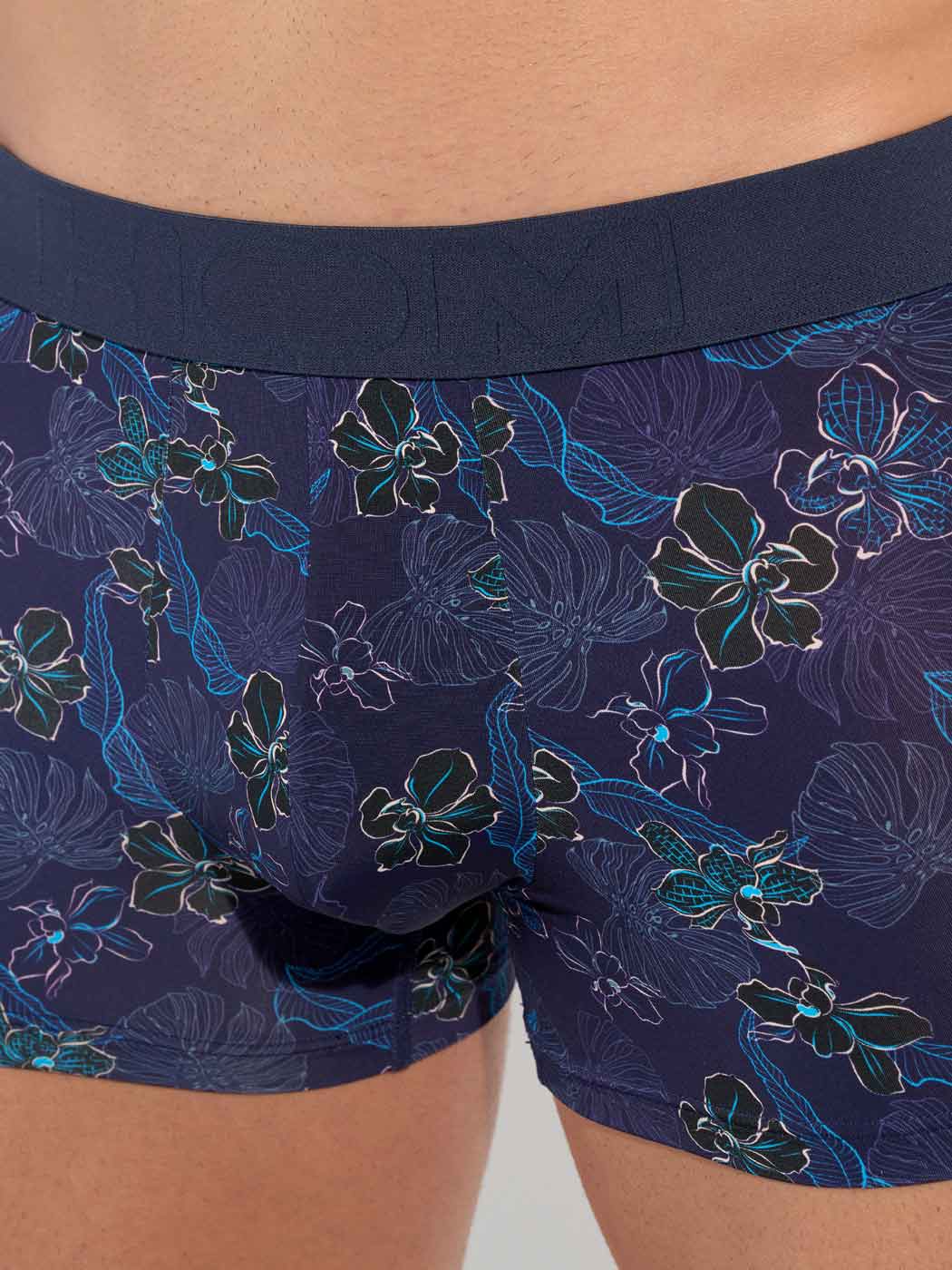 De Maldives - Boxer Briefs is gemaakt van een comfortabele microfiber. Deze heren boxer heeft een tropische print uitgevoerd in donkere kleuren, met exotische bloemen omlijnd op een donkerblauwe achtergrond. De Maldives heeft een elastische heupband gemaakt van katoen met daarop het HOM Logo in ton sur ton.