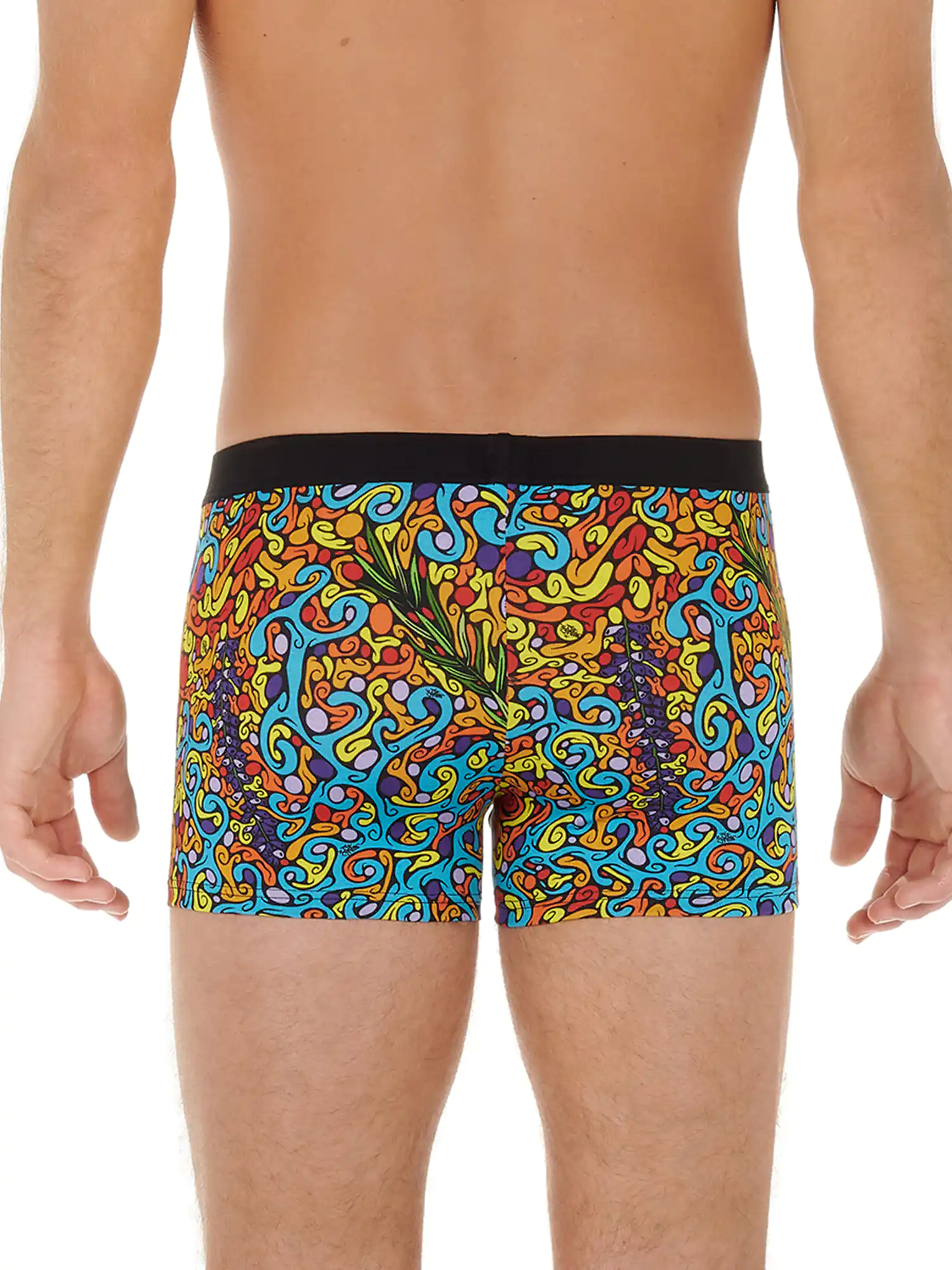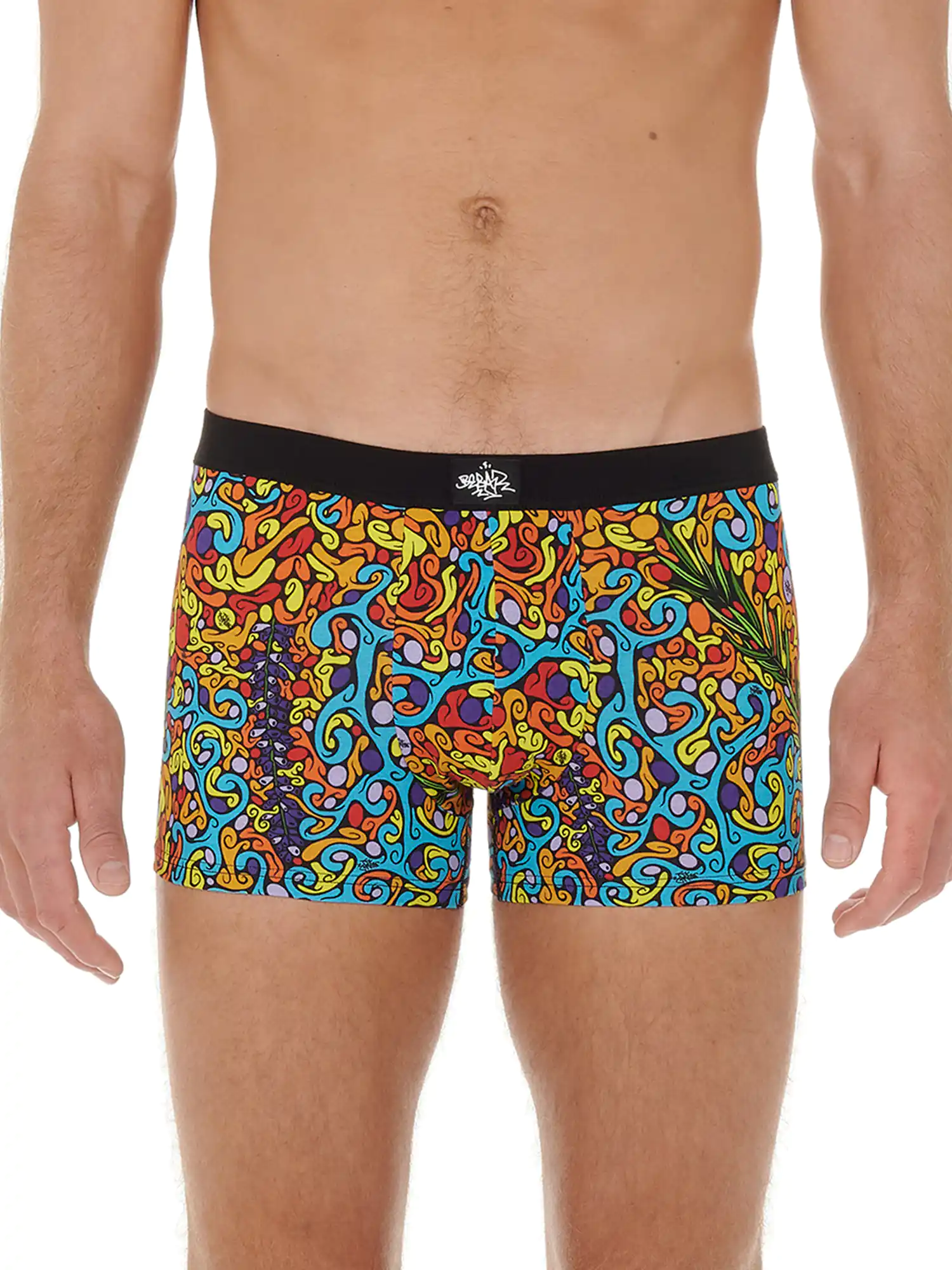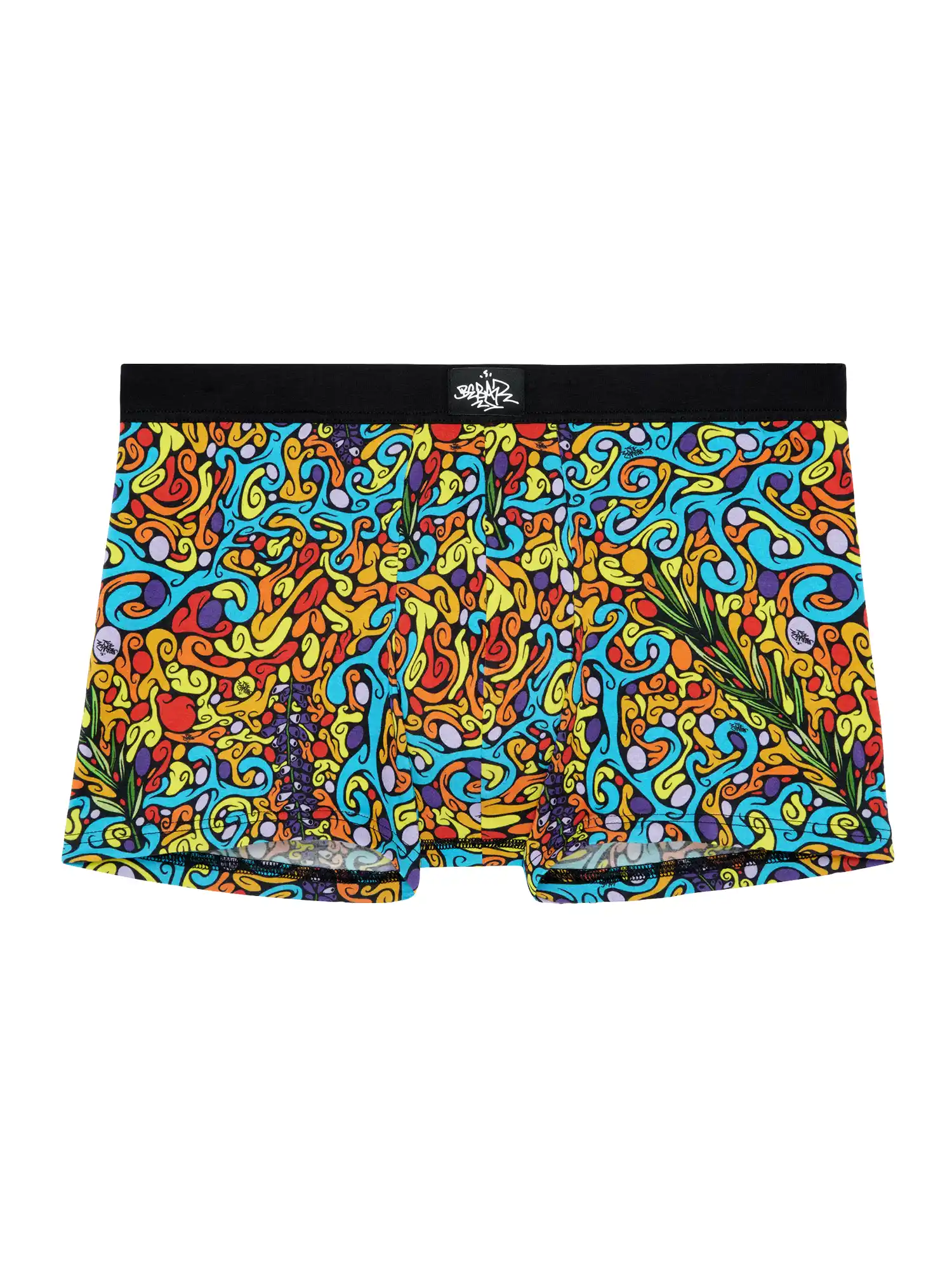 Boxer Brief - Mars by Bebar, een unieke designers boxer brief met een artiestieke kleurrijke print van de kunstenaar BebarDeze bijzondere boxershort is gemaakt van een comfortabele katoenmodal mix wat zacht aan voelt, en zorgt voor een pasvorm die goed aansluit op het lichaam. Daarnaast heeft katoenmodal goede absorberende en ademende eigenschappen, waardoor je veel minder snel warme klamme plekken krijgt in je ondergoed. Doordat katoen en modal beide een natuurlijke oorsprong hebben, is de deze boxer geschikt voor iedere man die graag natuurlijke stoffen draagt. Bij normaal gebruik is de stof goed bestand tegen krimpen en slijtage door wrijving. De boxershort heeft een zwarte heupband met een uniek logo speciaal ontworpen voor dit short.
