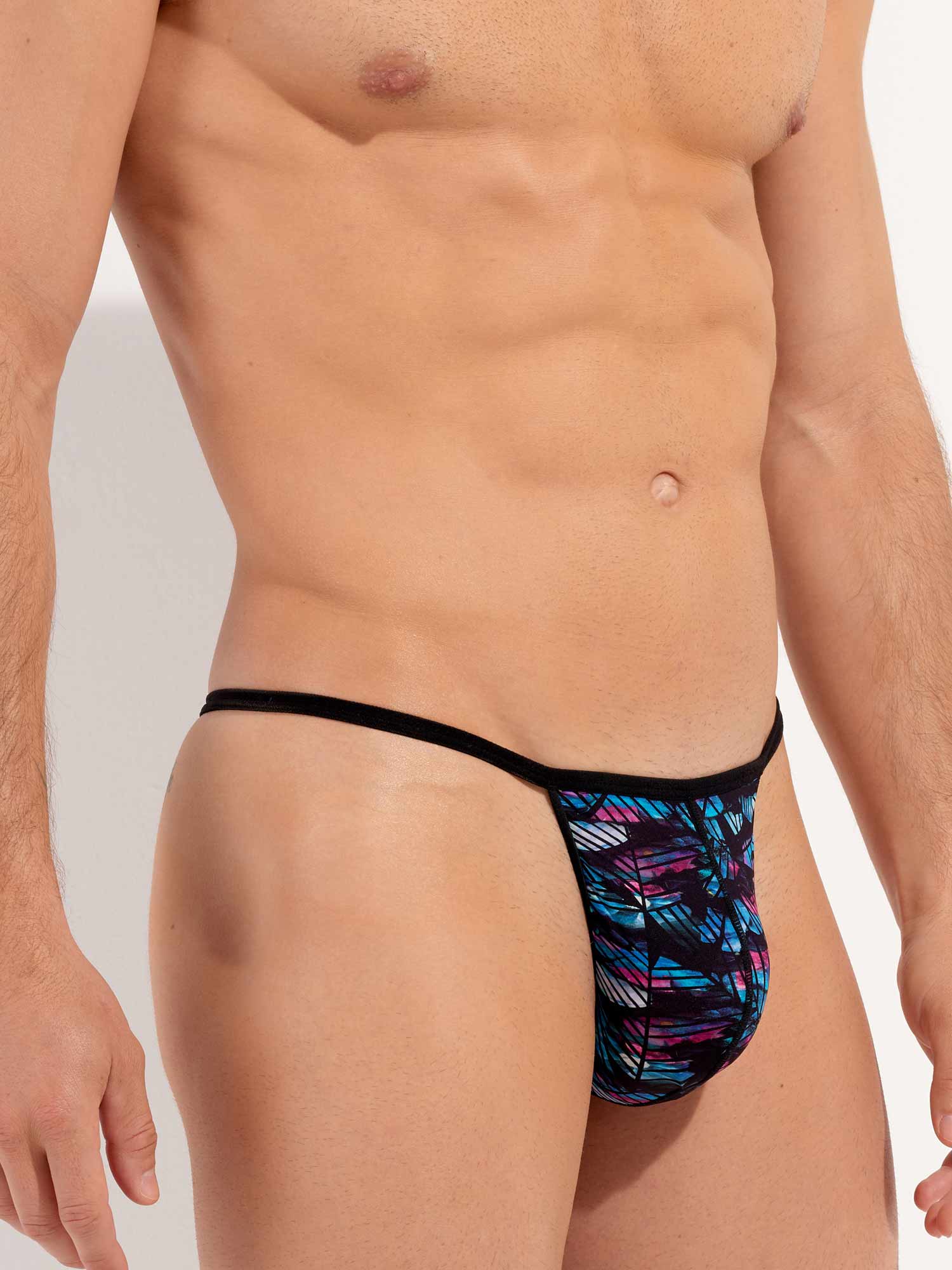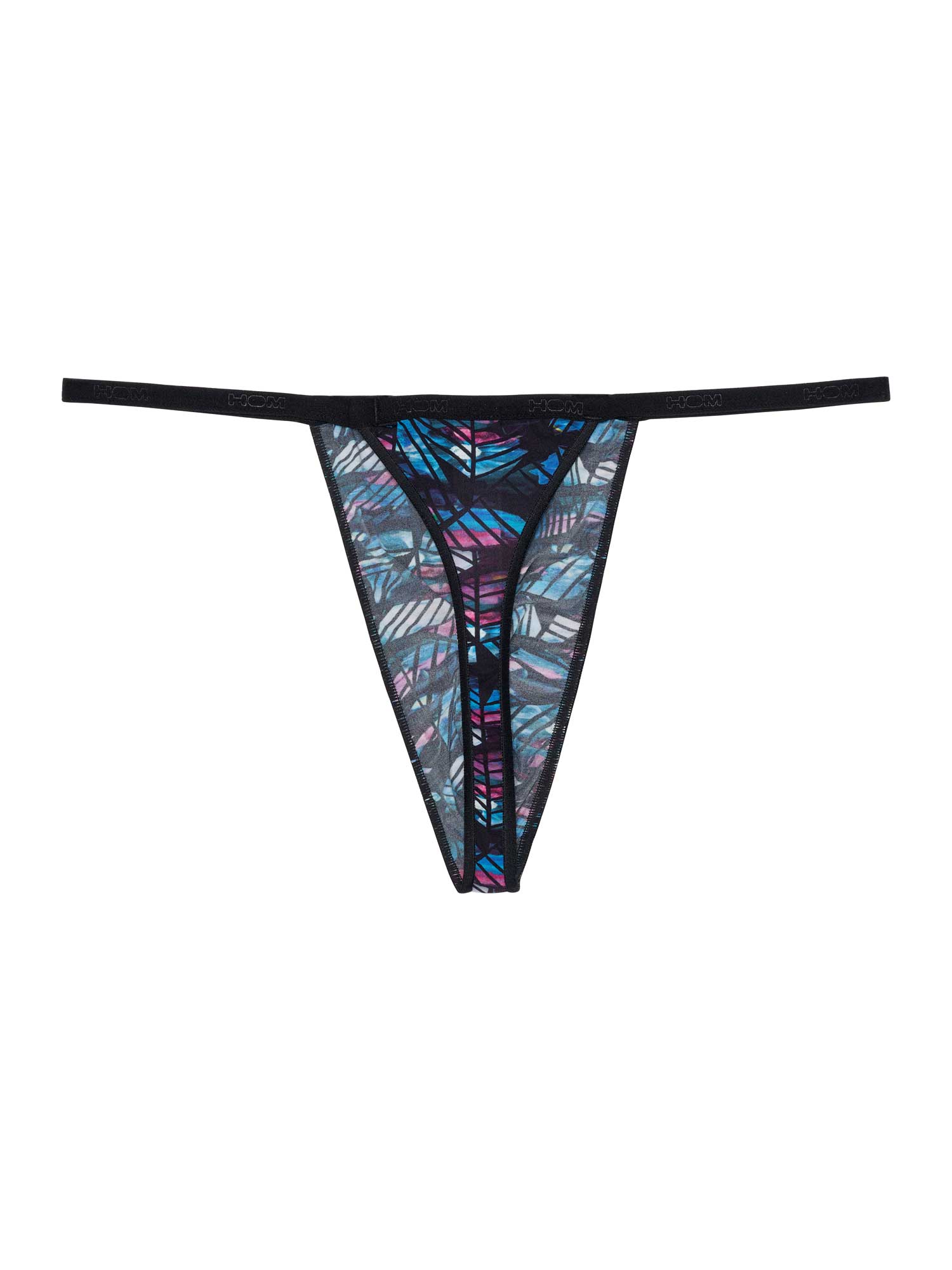 Die Blackrock - G-string ist eine sinnliche Ergänzung der HOM-Kollektion. Diese G-string besteht aus dem gleichen Stoff wie die reguläre Plumes-String, einem halbtransparenten Polyamid. Der Stoff zeigt ein abstraktes Blumenmuster in Blau und Rosa auf einem schwarzen Hintergrund, überlagert von schwarzen geometrischen Formen.