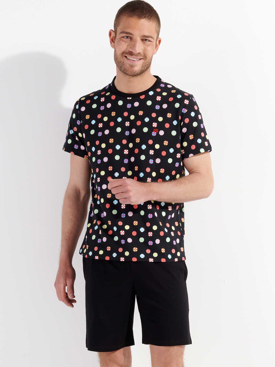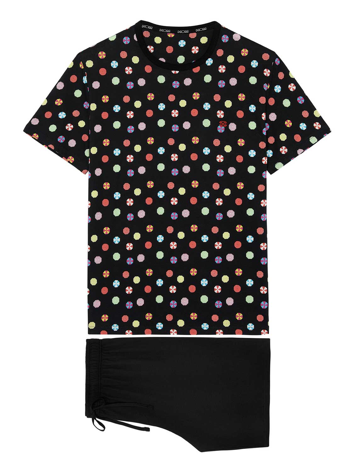 Die Fabian - Short Sleepwear ist aus 100 % Baumwolle in einer Jersey-Ausführung gefertigt. Diese kurze Nachtwäsche besteht aus einem T-Shirt mit einem verspielten, bunten Aufdruck mit Sonnenschirmen auf schwarzem Hintergrund. Das Shirt hat kurze Ärmel und einen Rundhalsausschnitt mit HOM-Band an der Innenseite des Ausschnitts. Die Shorts sind in schlichtem Schwarz gehalten und haben Seitentaschen am linken und rechten Saum. Der Bund ist mit einem Kordelzug versehen, so dass die Shorts perfekt geschnitten sind.