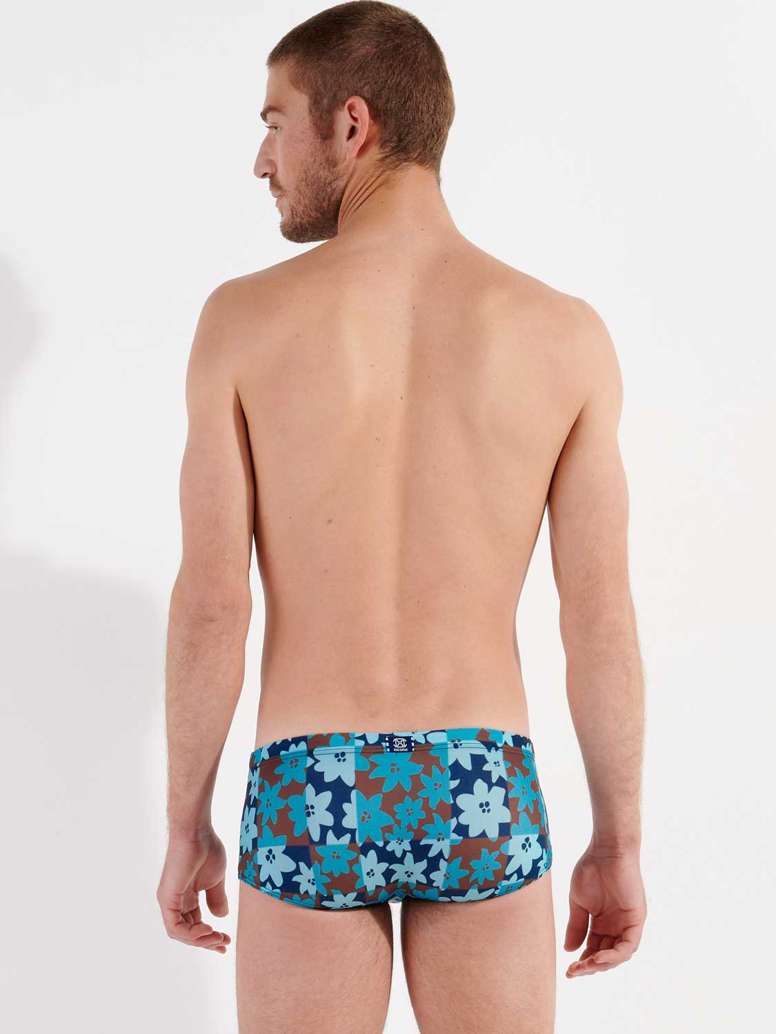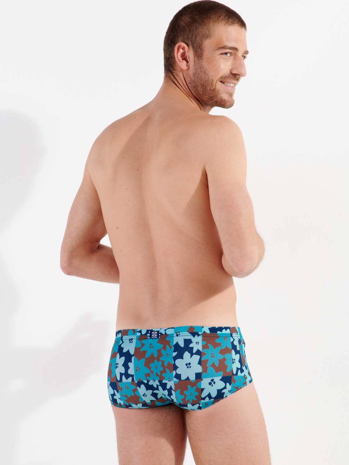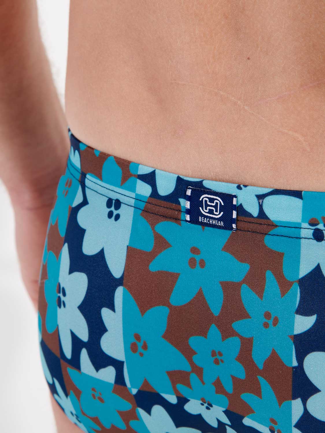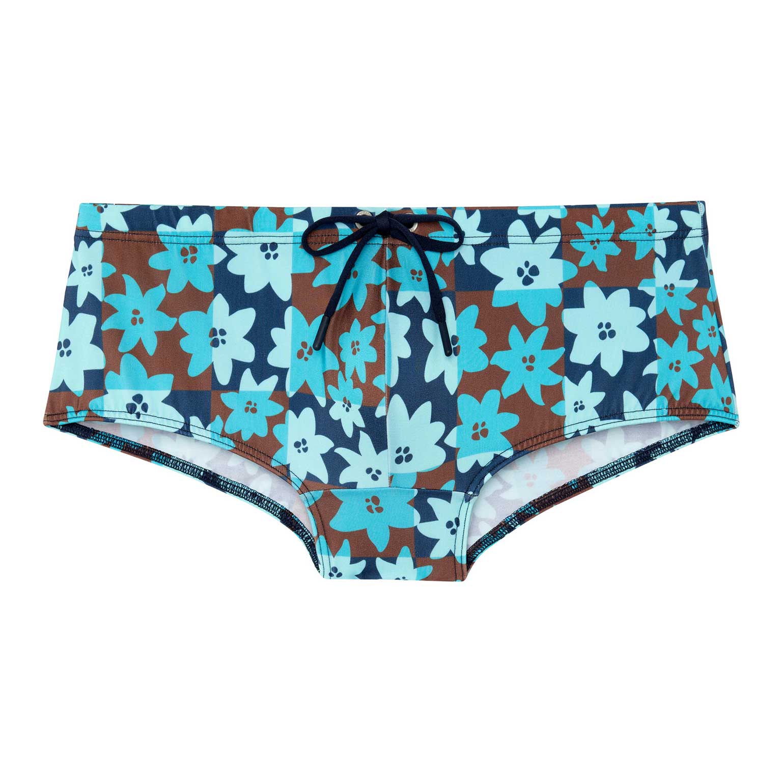 Die Mervyn - Badehose hat einen abstrakten Blumendruck in Blau- und Brauntönen. Der Stoff ist elastisch, liegt gut auf der Haut und scheint nicht durch. Da es sich bei dieser Badehose um ein Rüsselmodell handelt, wird sie tiefer auf den Fersen getragen und hat kürzere Beine als normale Badeshorts für einen wirklich modischen Retro-Look. Mit dem Kordelzug im Bund können Sie die Badeshorts auf die perfekte Größe einstellen. Ein toller Modeartikel für den Strand oder den Pool.