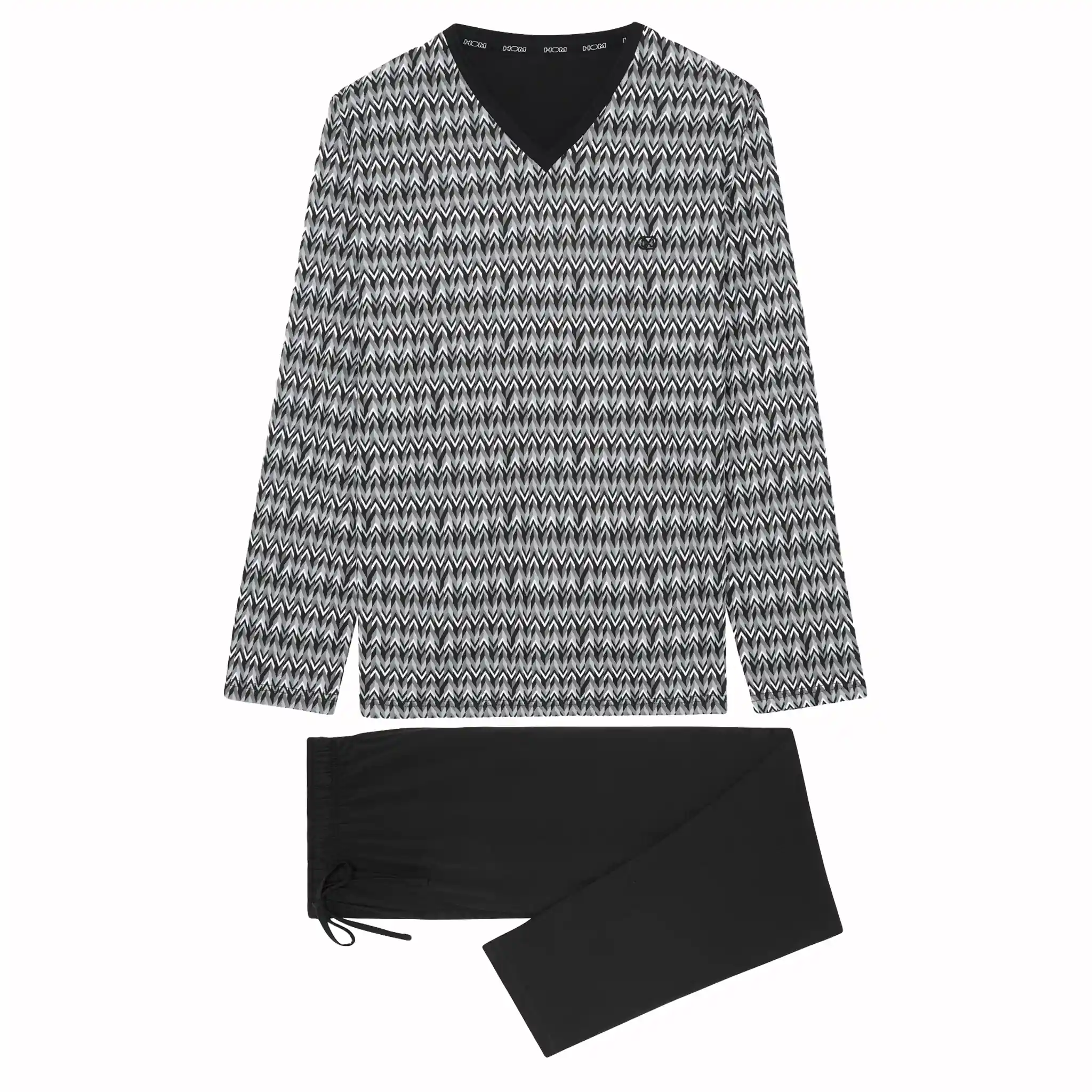 The Jerry men's pajama is made of 100% jersey cotton. The long-sleeve T-shirt features a V-neck. The shirt has a striking geometric print in shades of gray with black and white. The solid black long pants have side seam pockets on the left and right sides. The waistband is elastic and has a drawstring. Because the pajama is made of cotton, it is easy to clean and breathable. Perfect for the man who likes to wear natural fabrics.