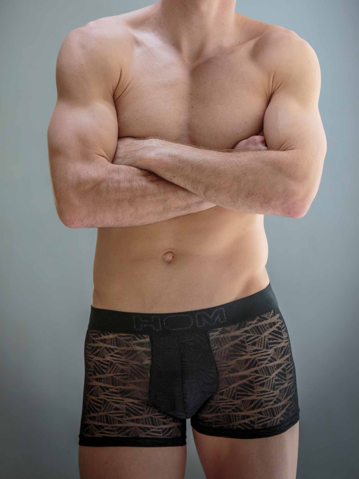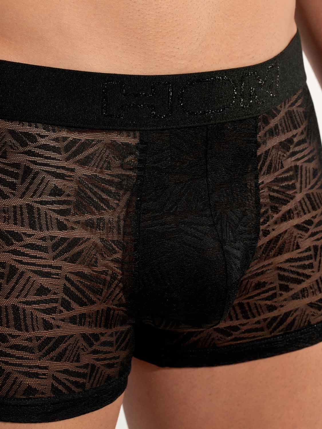 Discover the Ari - Boxer Brief from HOM, a bold and sensual boxer from the HOM Temptation series. The Ari is made from black lace with a geometric print, for a bold yet sensual effect. The transparent fabric plays erotically with the skin for the ultimate seduction.