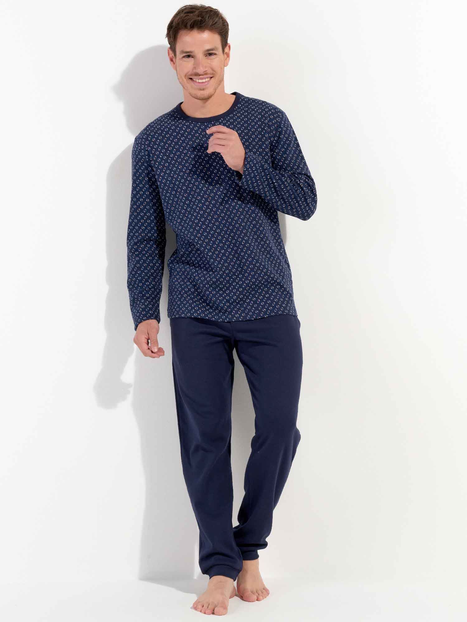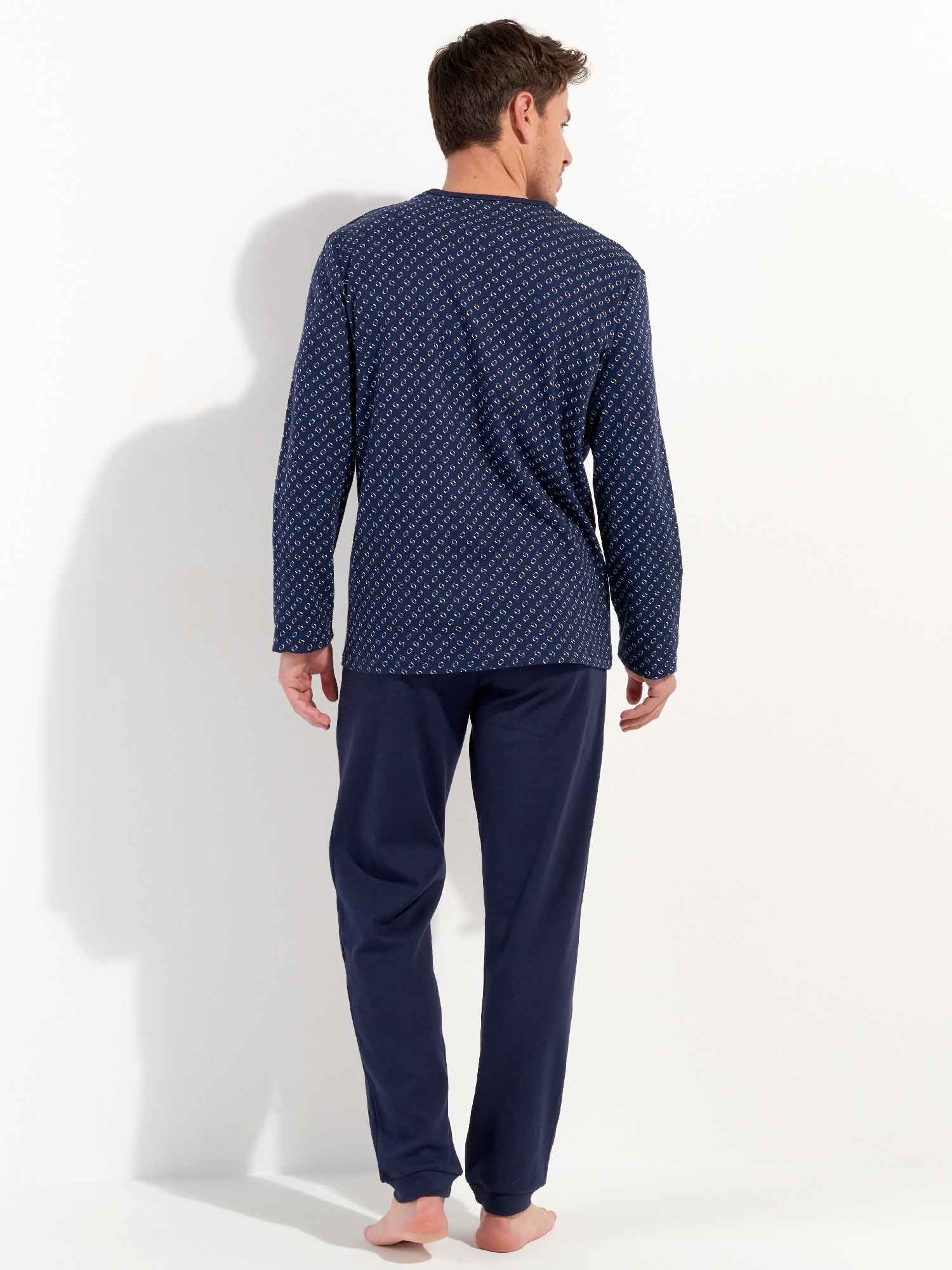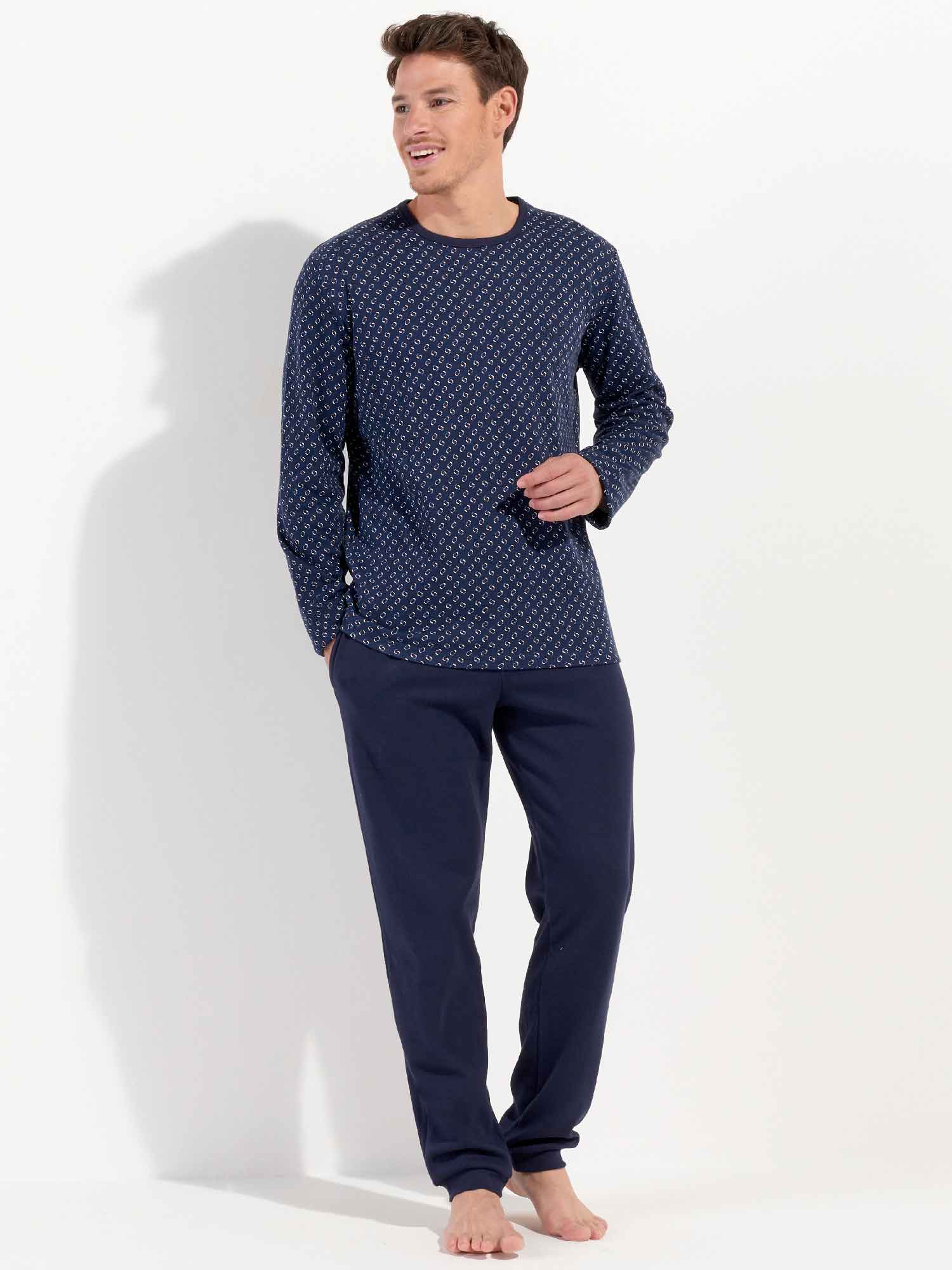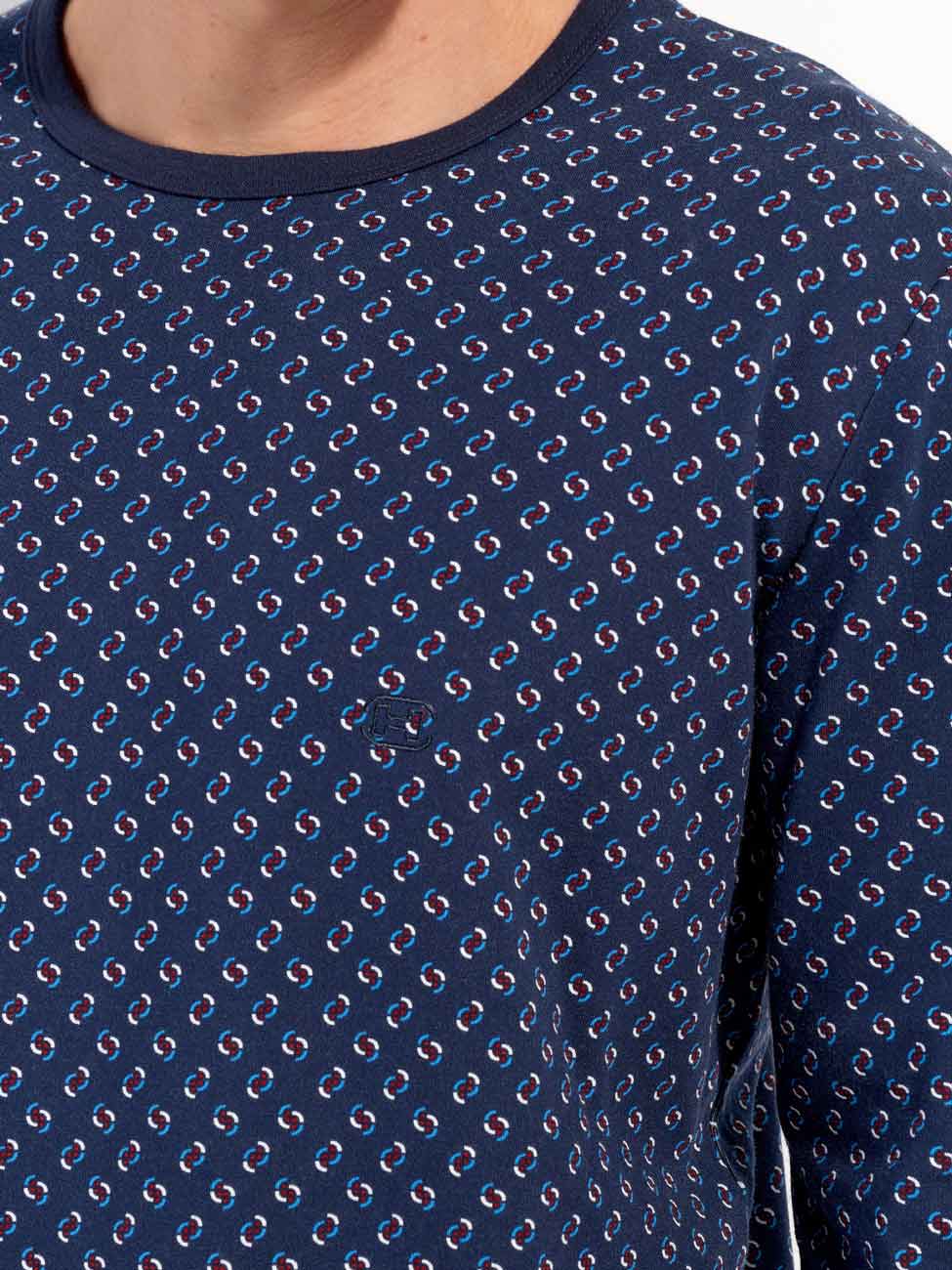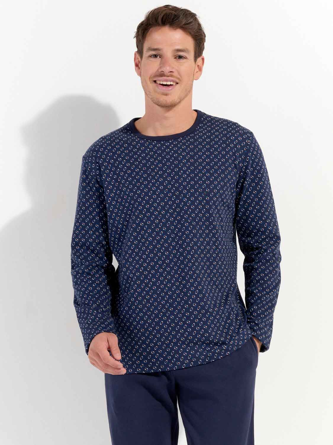 The Cyrus - Long Sleepwear is made from 100% cotton, knitted with an interlock stitch. The pajamas feature a long-sleeve T-shirt with a round collar. The long pants are solid navy blue, with pockets in the seams on the left and right sides. The long pants have a drawstring to adjust the fit perfectly. The shirt features a geometric print in three colors on a navy blue background.