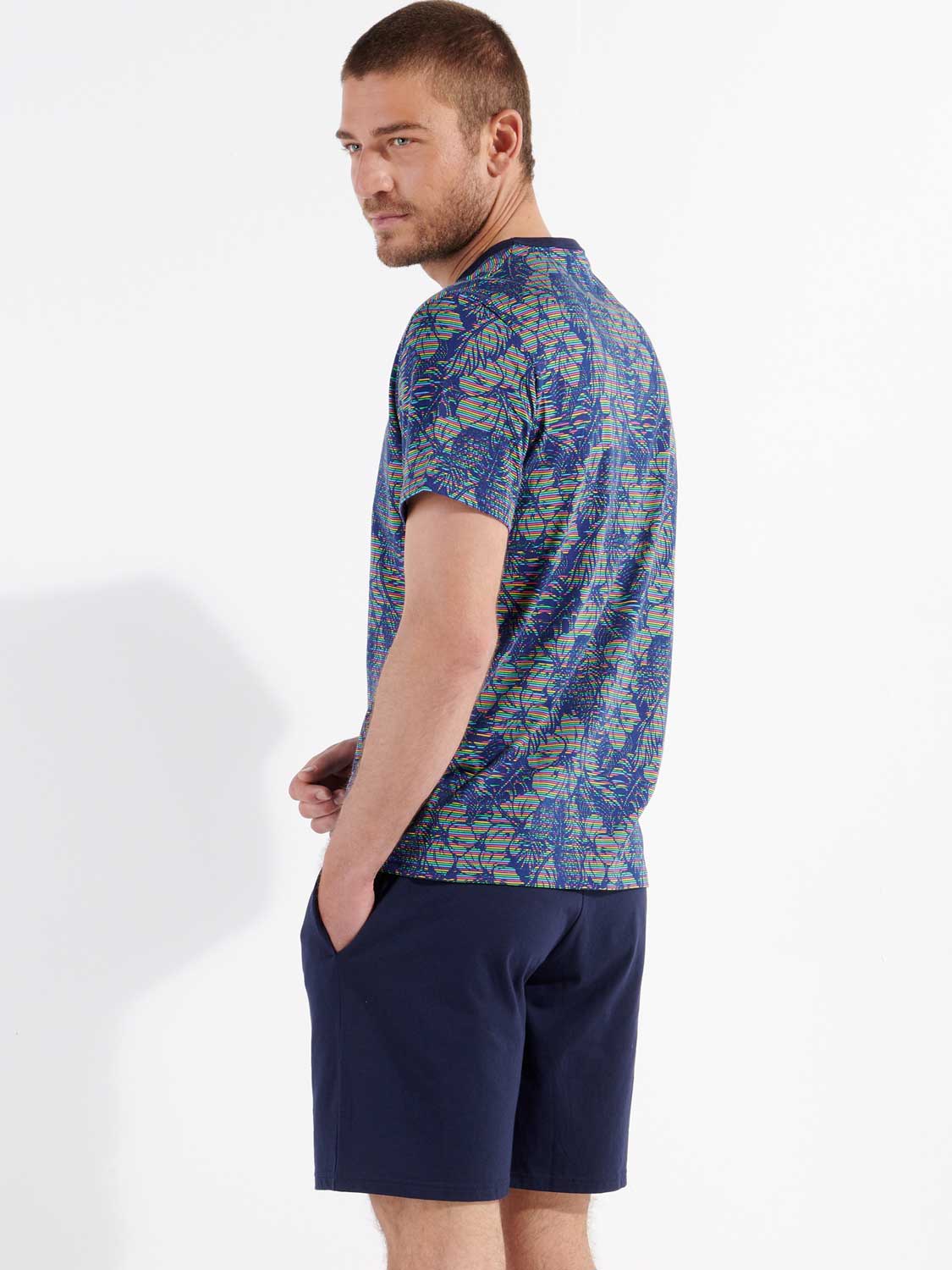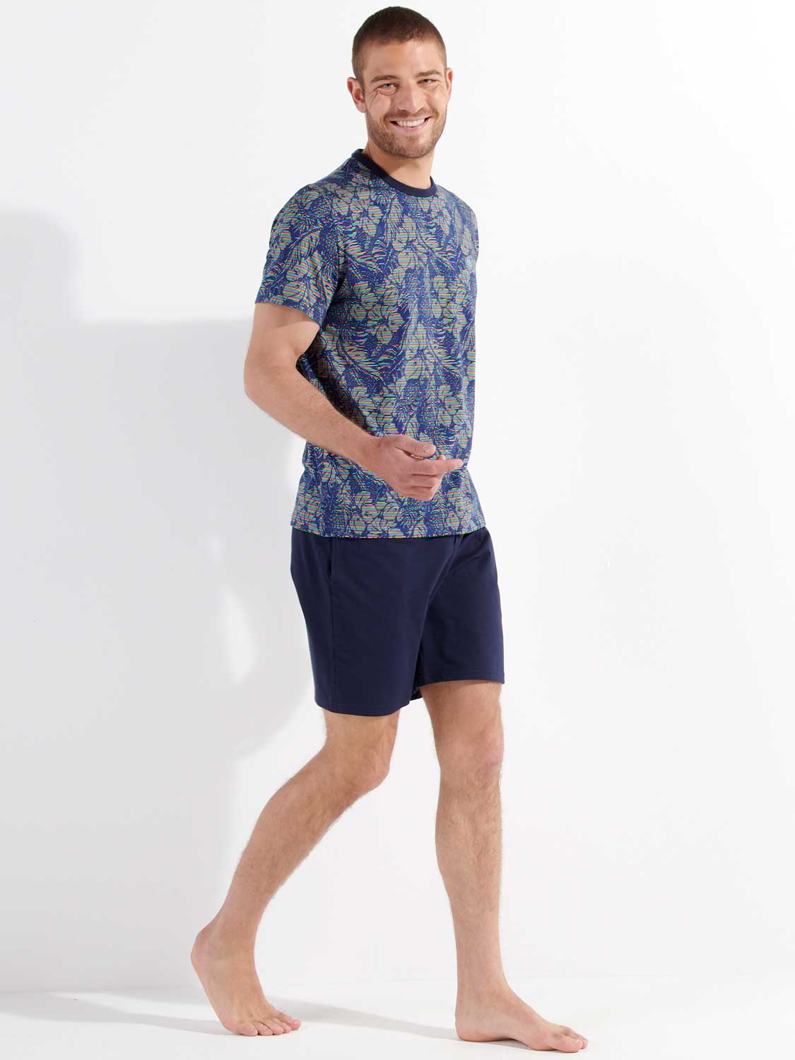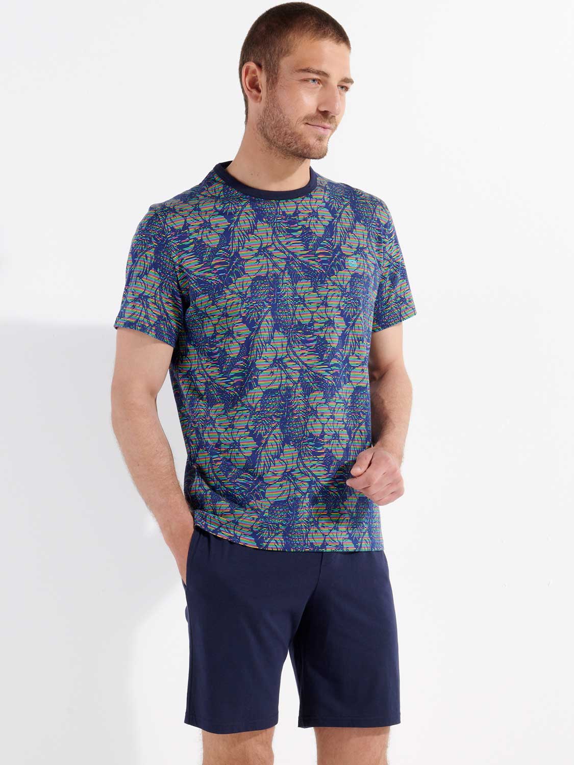 The Callum - Short Sleepwear is made from 100% cotton crafted in a jersey fabric. This short sleepwear set features a T-shirt with a tropical floral print on a striped background in various colors. The shirt has short sleeves and a round neckline with HOM tape on the inside of the neckline. The shorts are in solid navy blue and have side seam pockets on the left and right. The waistband has a drawstring to adjust the shorts to the perfect fit.