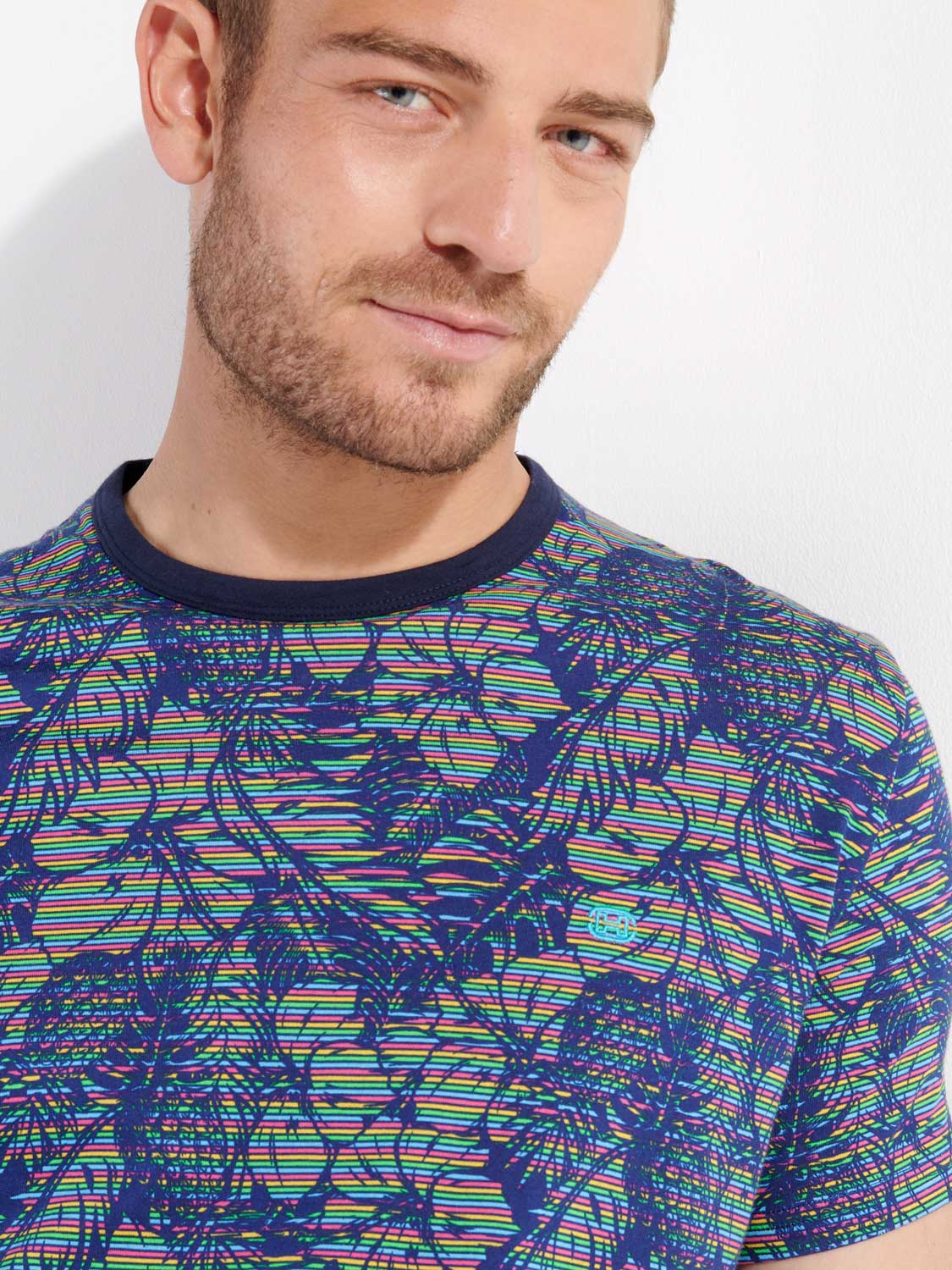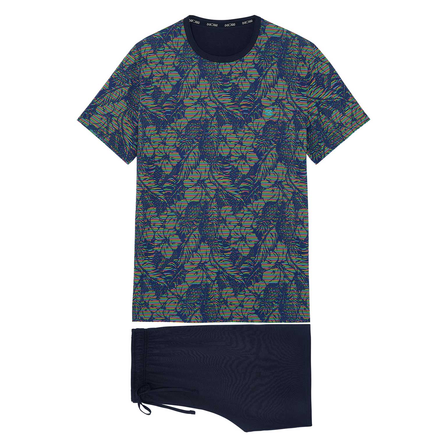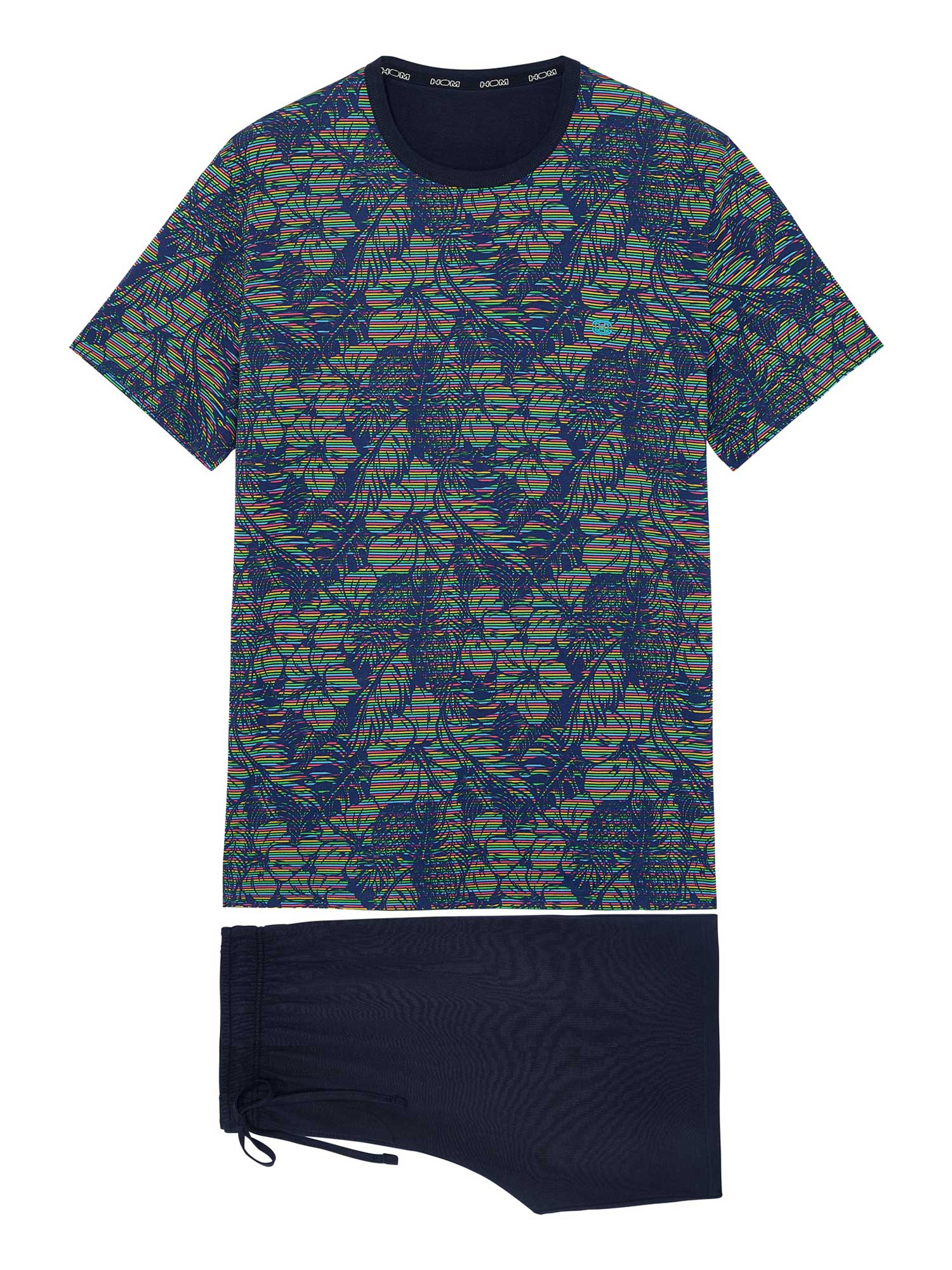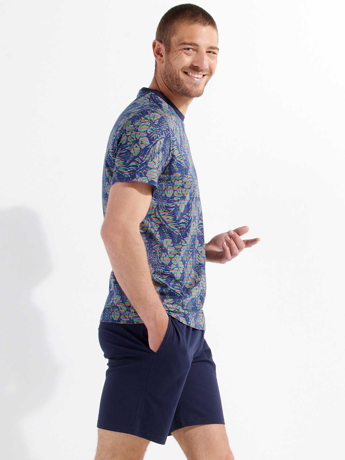 The Callum - Short Sleepwear is made from 100% cotton crafted in a jersey fabric. This short sleepwear set features a T-shirt with a tropical floral print on a striped background in various colors. The shirt has short sleeves and a round neckline with HOM tape on the inside of the neckline. The shorts are in solid navy blue and have side seam pockets on the left and right. The waistband has a drawstring to adjust the shorts to the perfect fit.