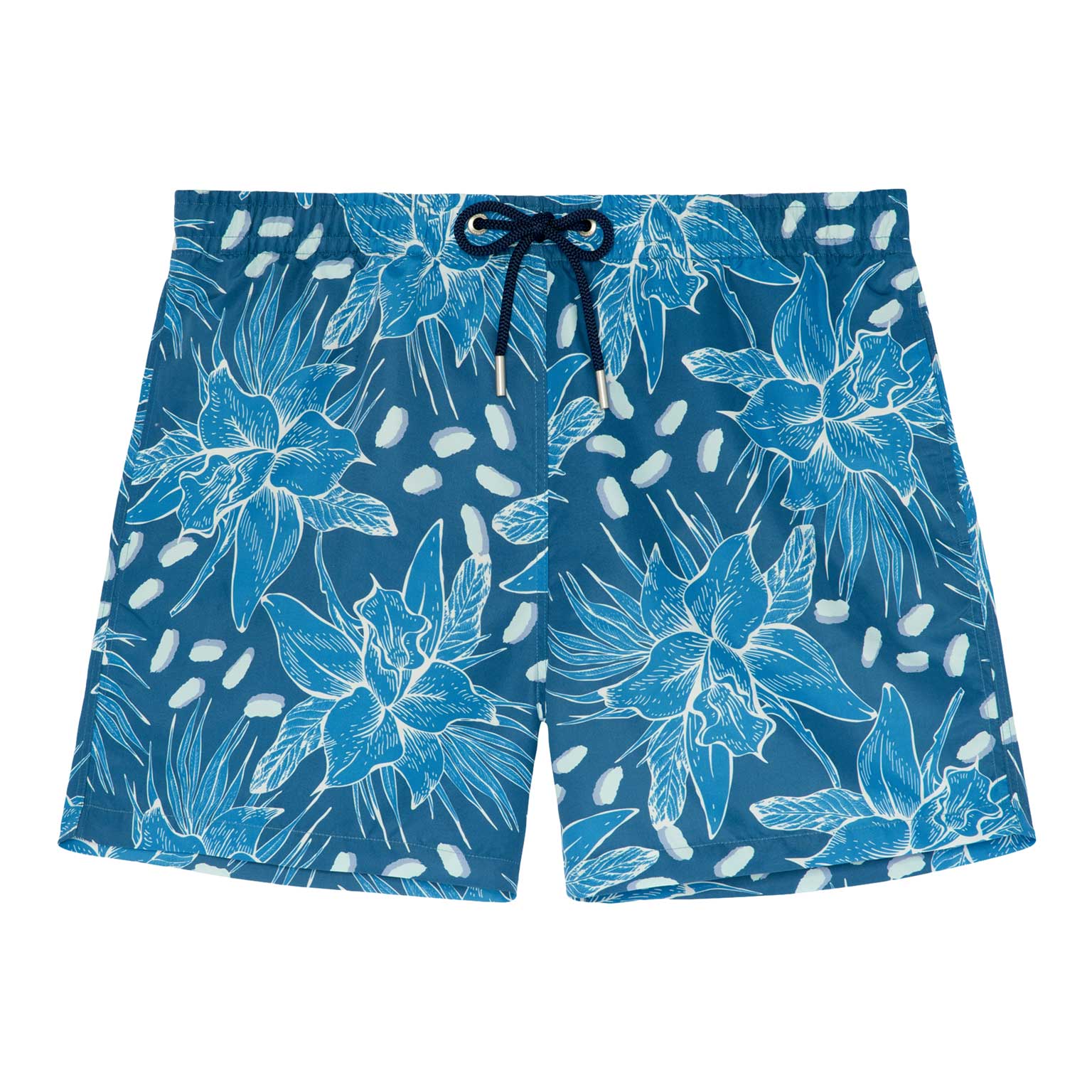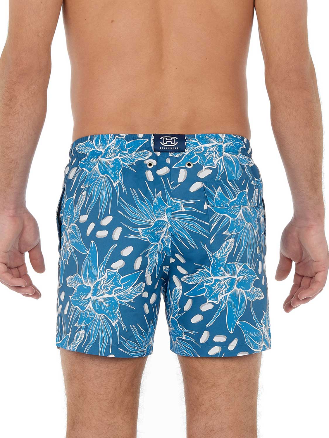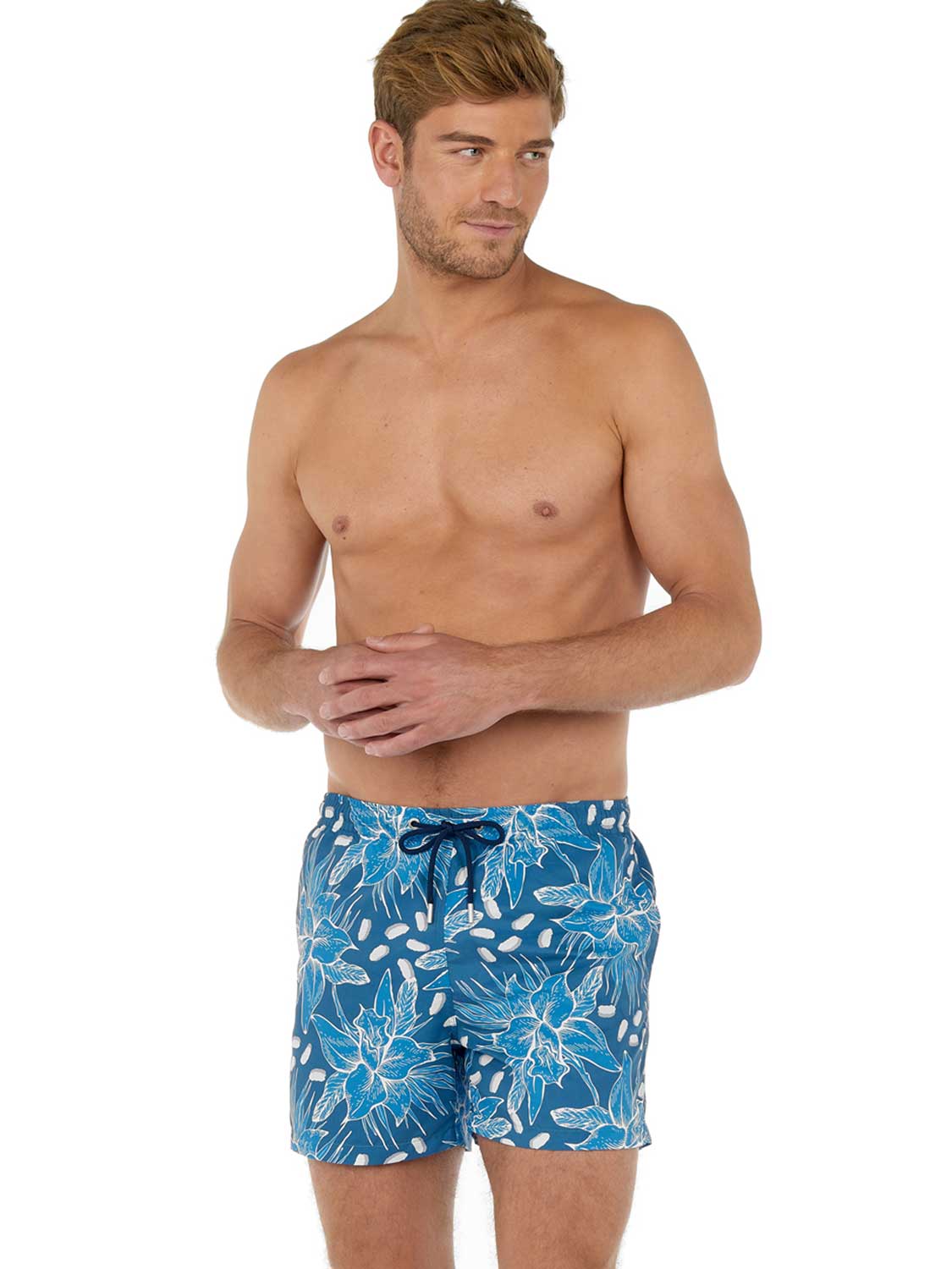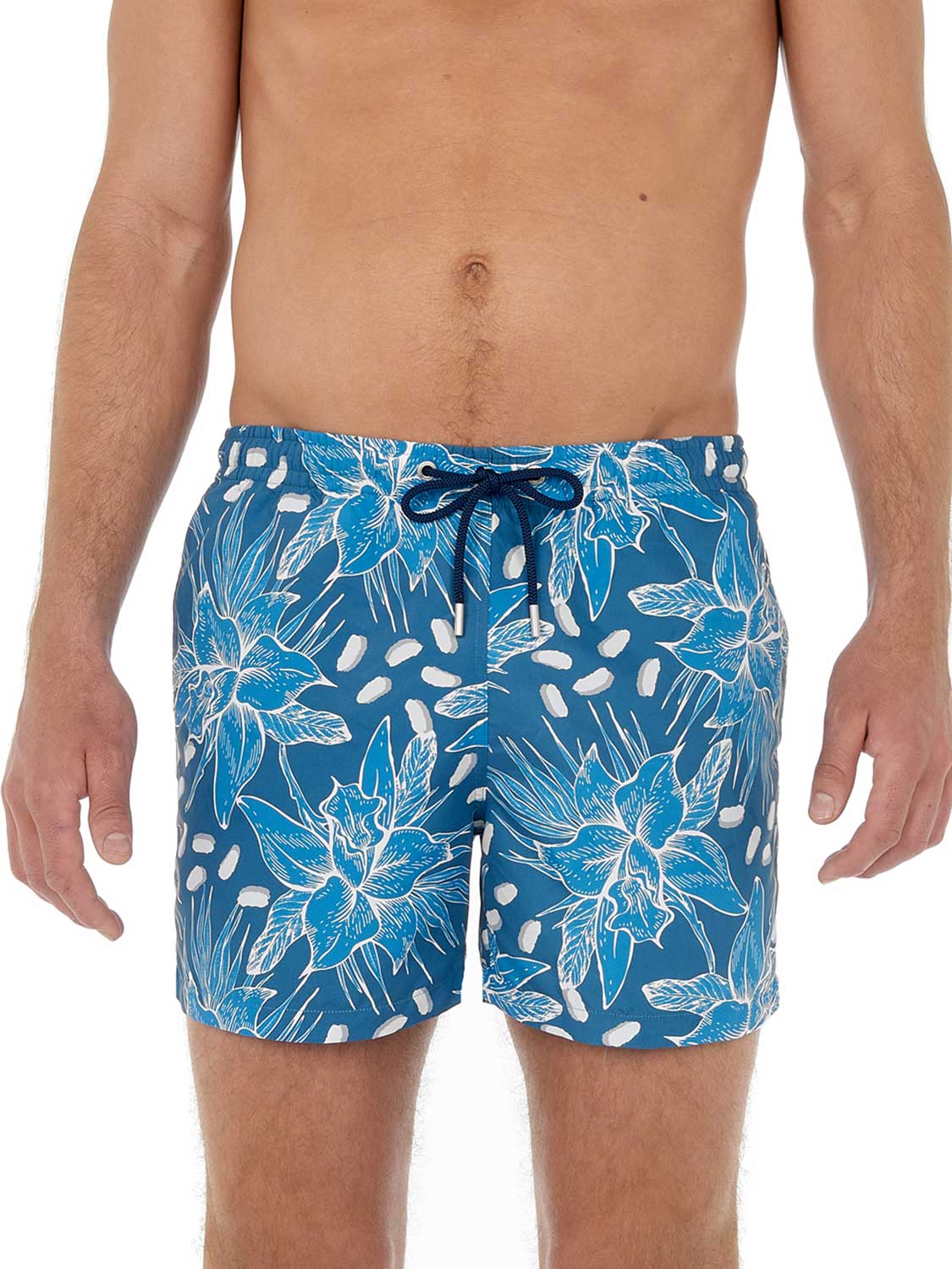 The Moorea - Beach Boxer from the HOM summer collection features a beautiful tropical floral print in blue. The Beach Boxer includes an inner brief for extra support and comfort and has side pockets on the left and right. The drawstring in the waistband allows you to perfectly adjust the Beach Boxer to size, so you can take a refreshing dip with confidence. The fabric is made of polyester, making the Beach Boxer quick-drying. Ideal for the beach or if you want to head to the terrace afterward.