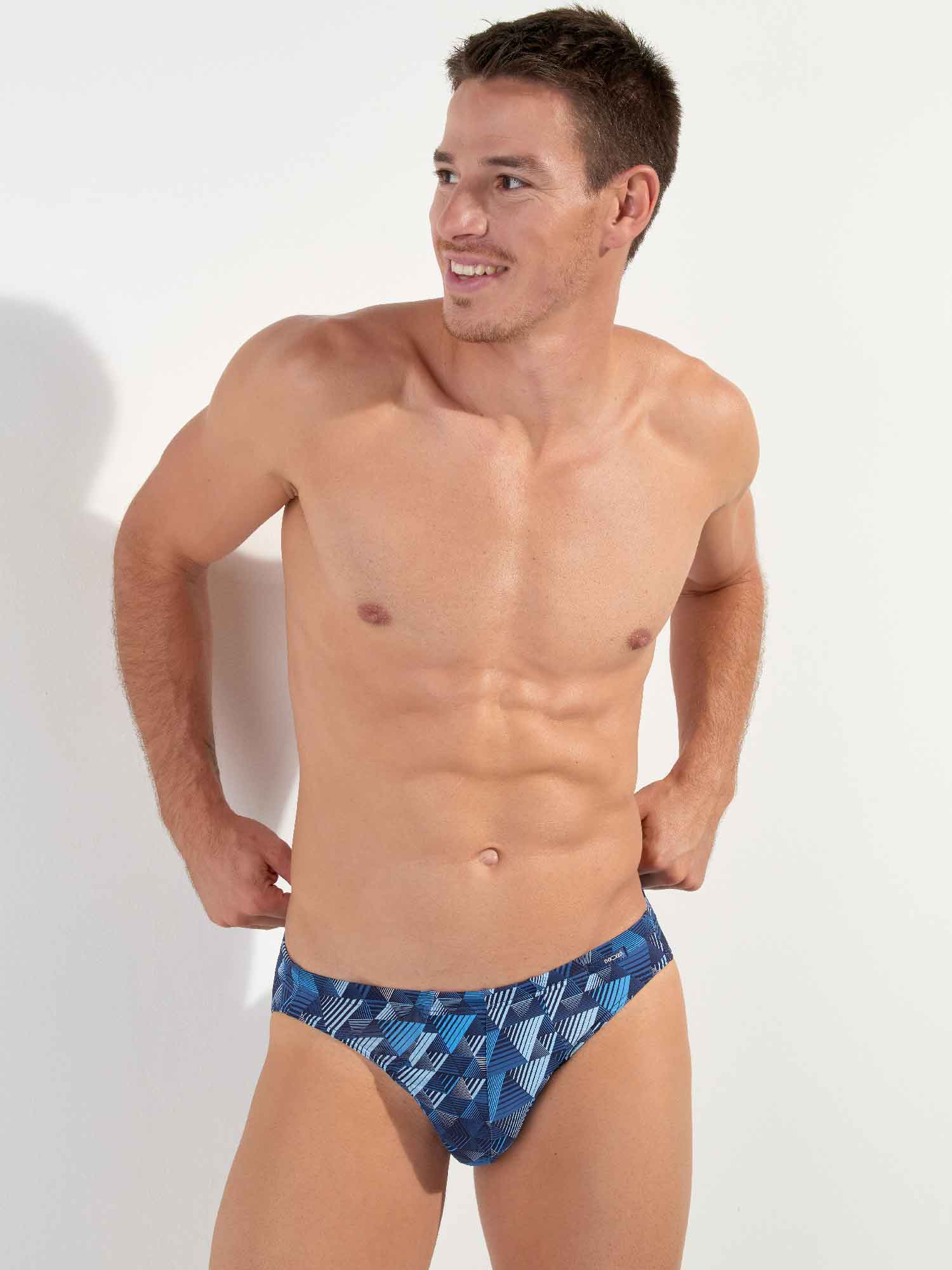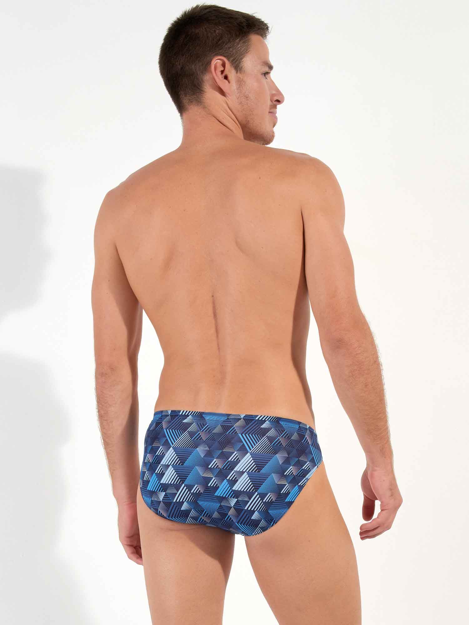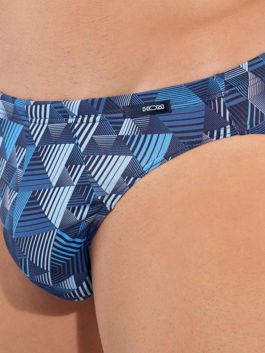 The Mekong - Comfort Micro Briefs are made from a comfortable microfiber and feature a comfort waistband, where the fabric extends over the elastic band for optimal comfort. These men's briefs have a contemporary print with geometric triangles in shades of blue. A small label with the HOM logo is placed on the left front of the comfort band.