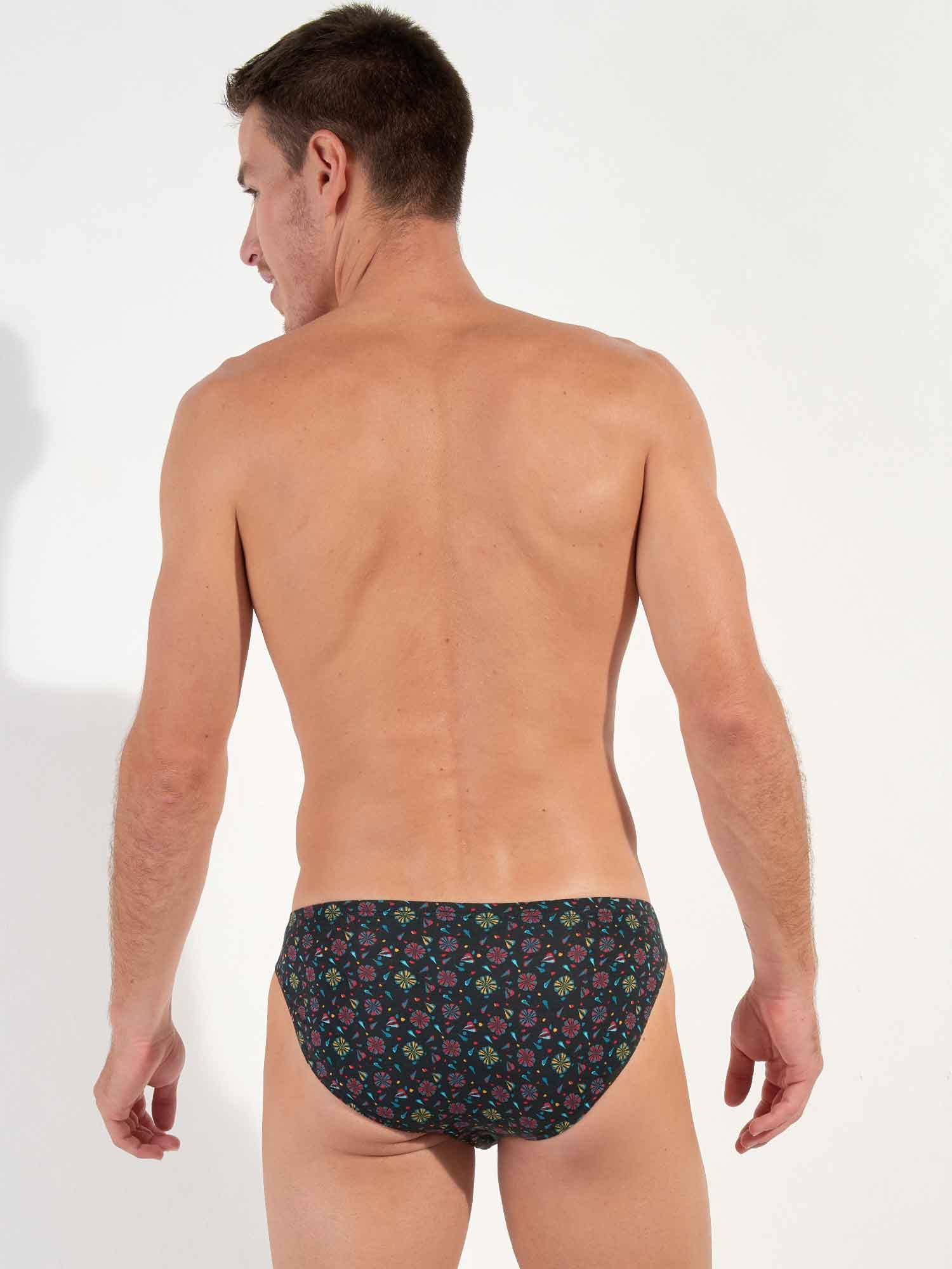 The Menorca - Comfort Micro Briefs is made from high-quality cotton modal and features a comfort waistband, where the fabric is extended and folded over the elastic band for extra comfort. The men's micro brief has an abstract floral print on a black background. A small HOM label is placed on the front left of the comfort band.