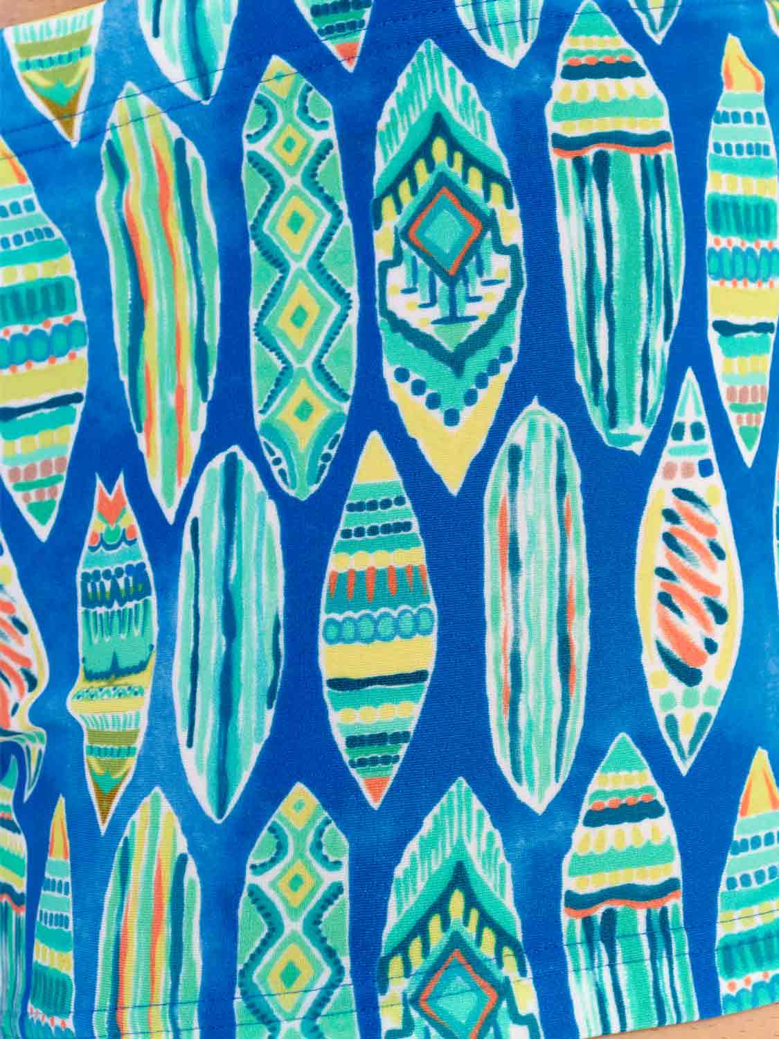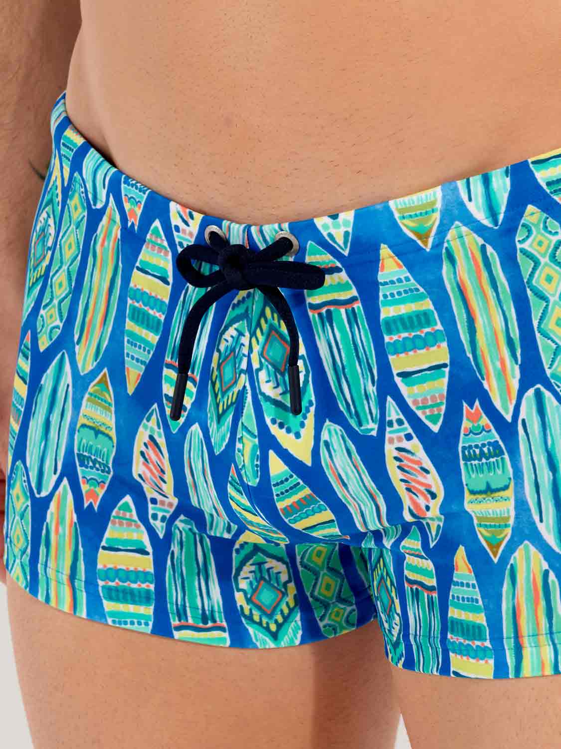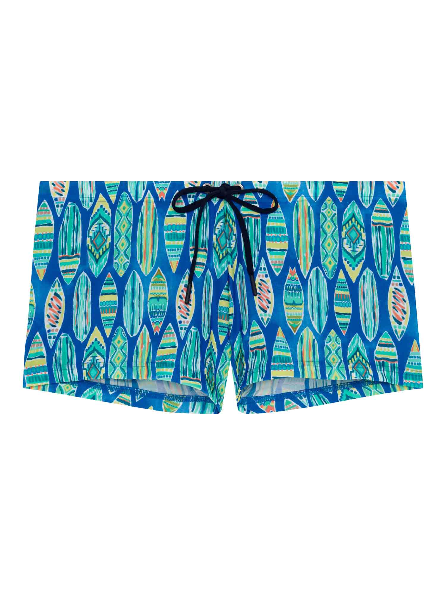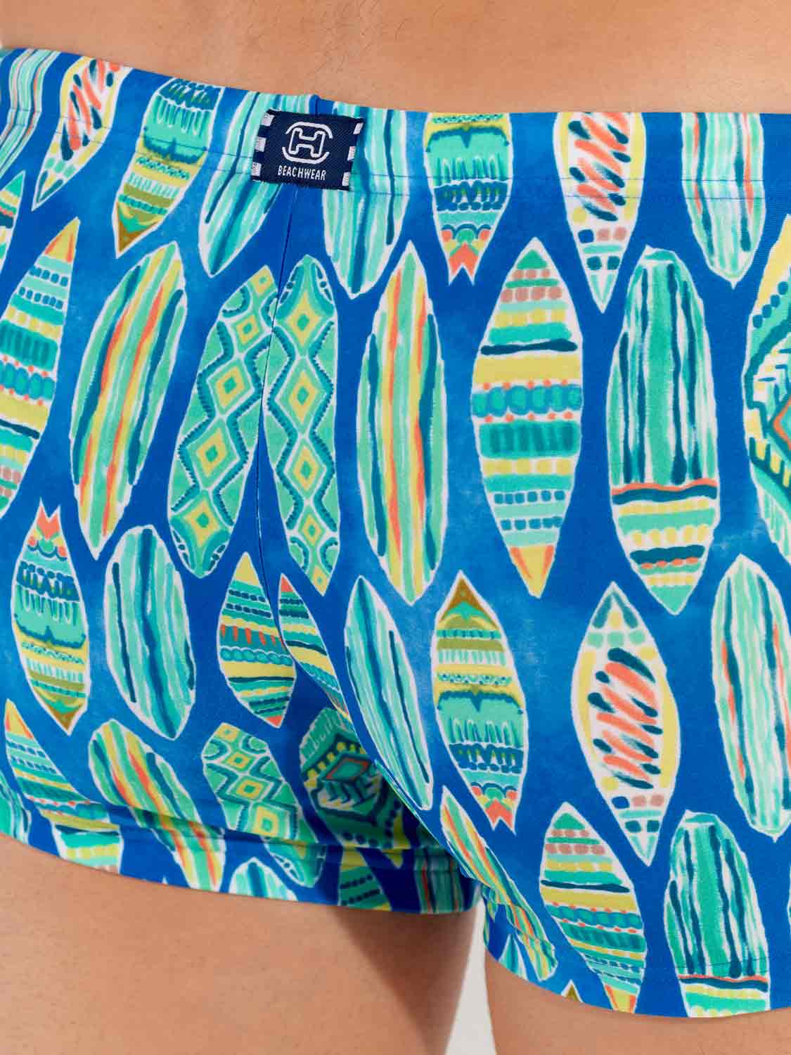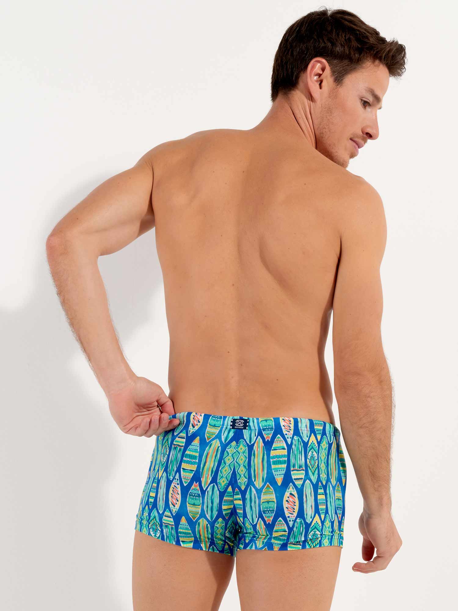 The Marbella - Swim Shorts are part of the HOM summer swim collection. The design features turquoise, green and yellow surfboards on a tie-dye blue background, evoking exotic vacations. The fabric is elastic, fits nicely to the skin, and is not see-through. The drawstring in the waistband allows you to adjust the swim shorts perfectly to size for a secure fit. With this fashion item. Bring a touch of cheerfulness to the beach or the pool with this swim short.