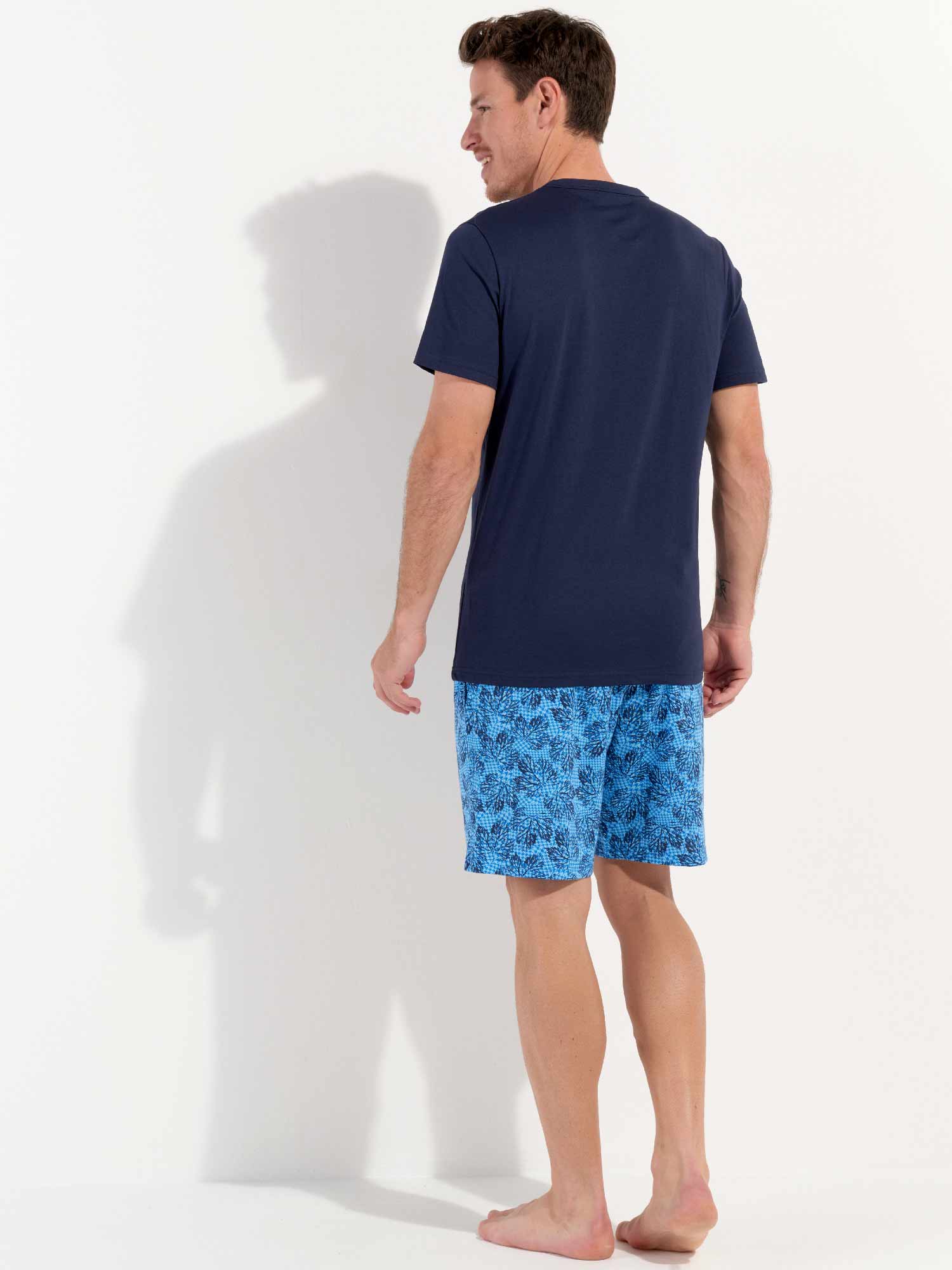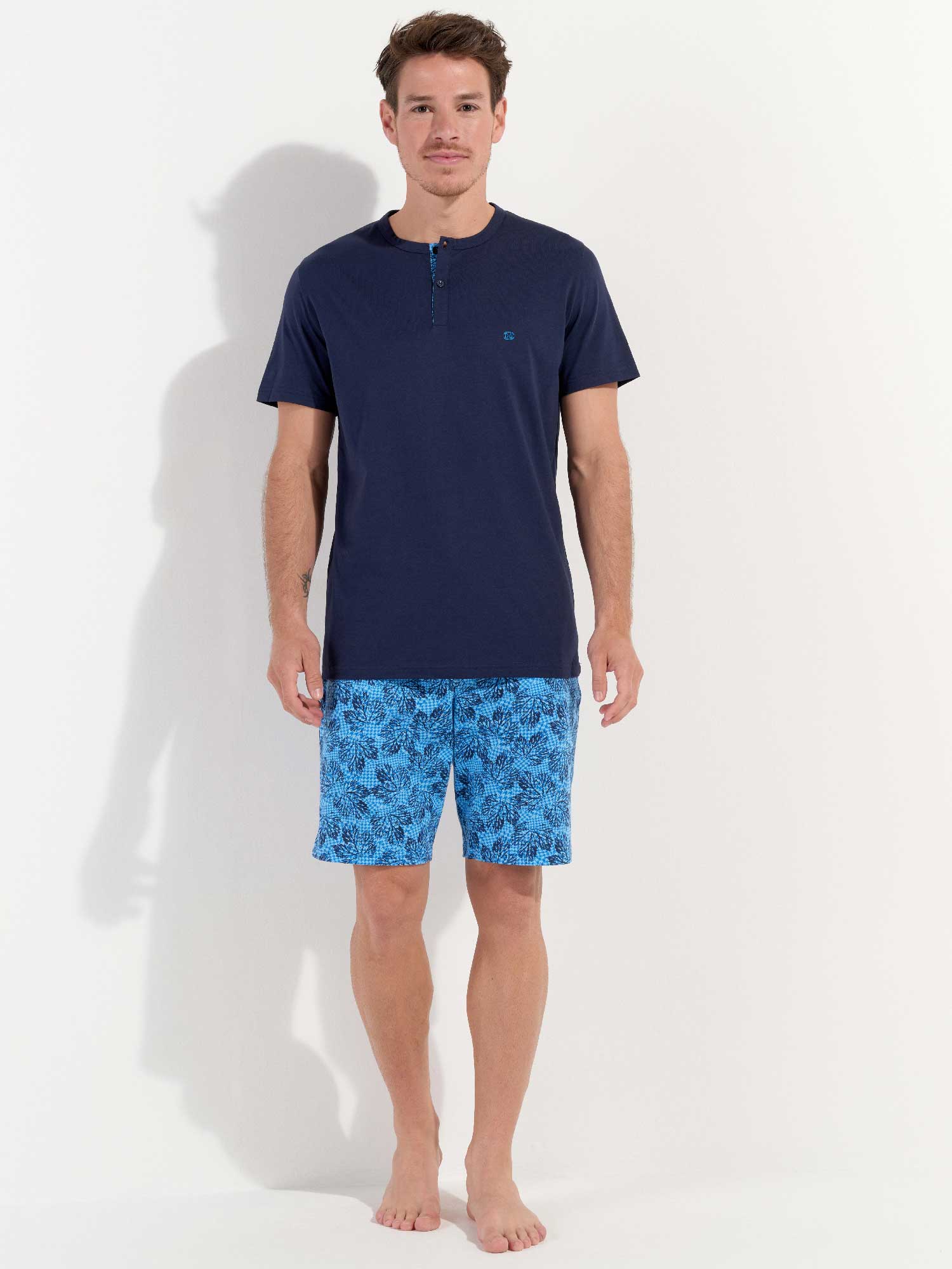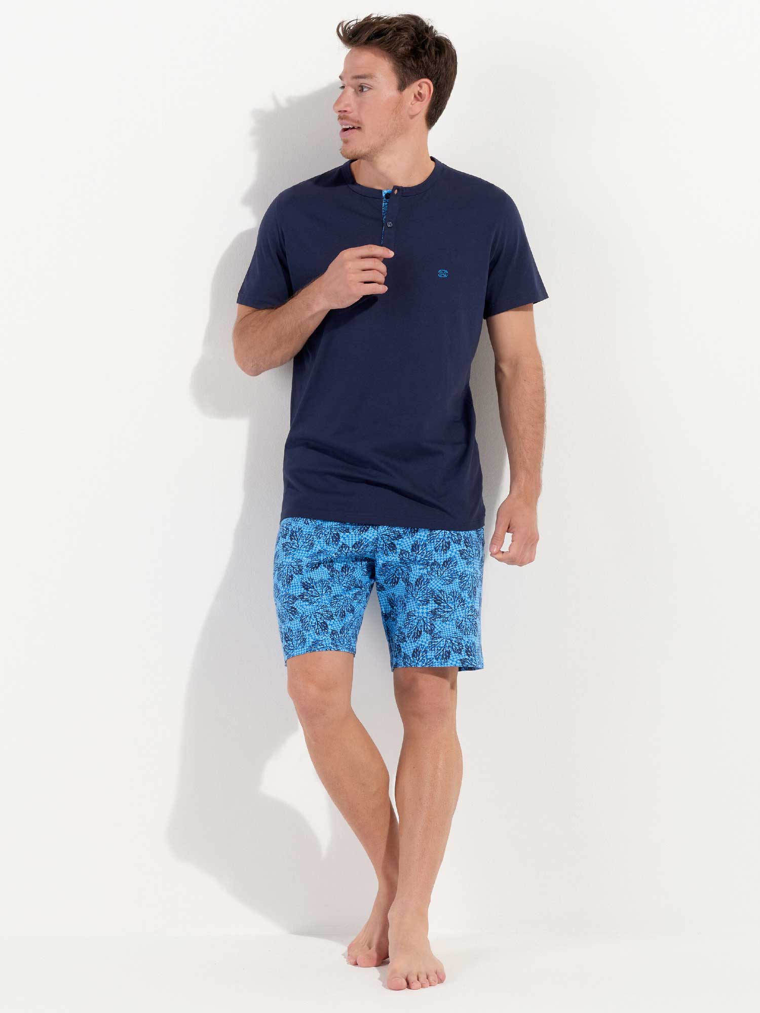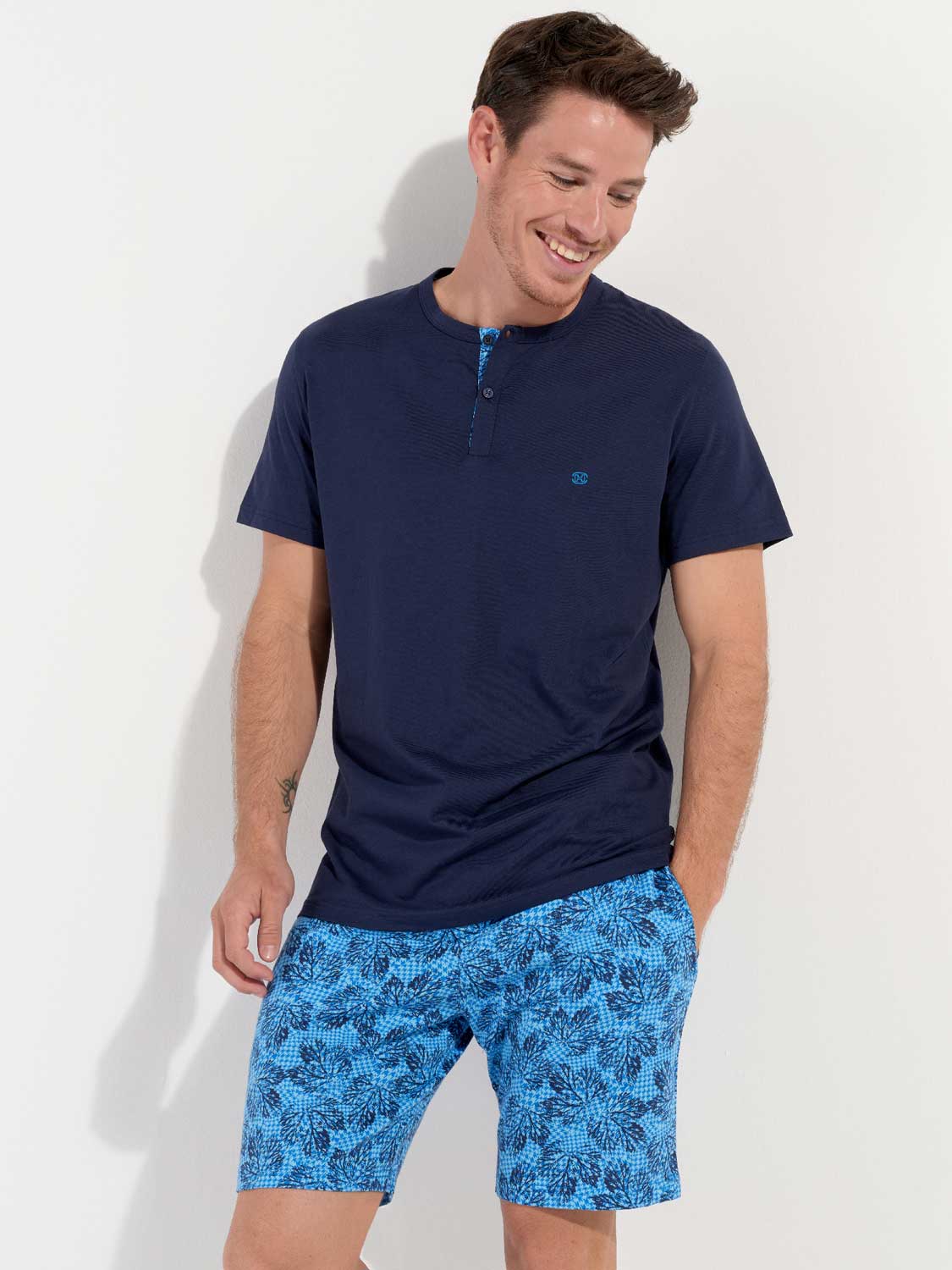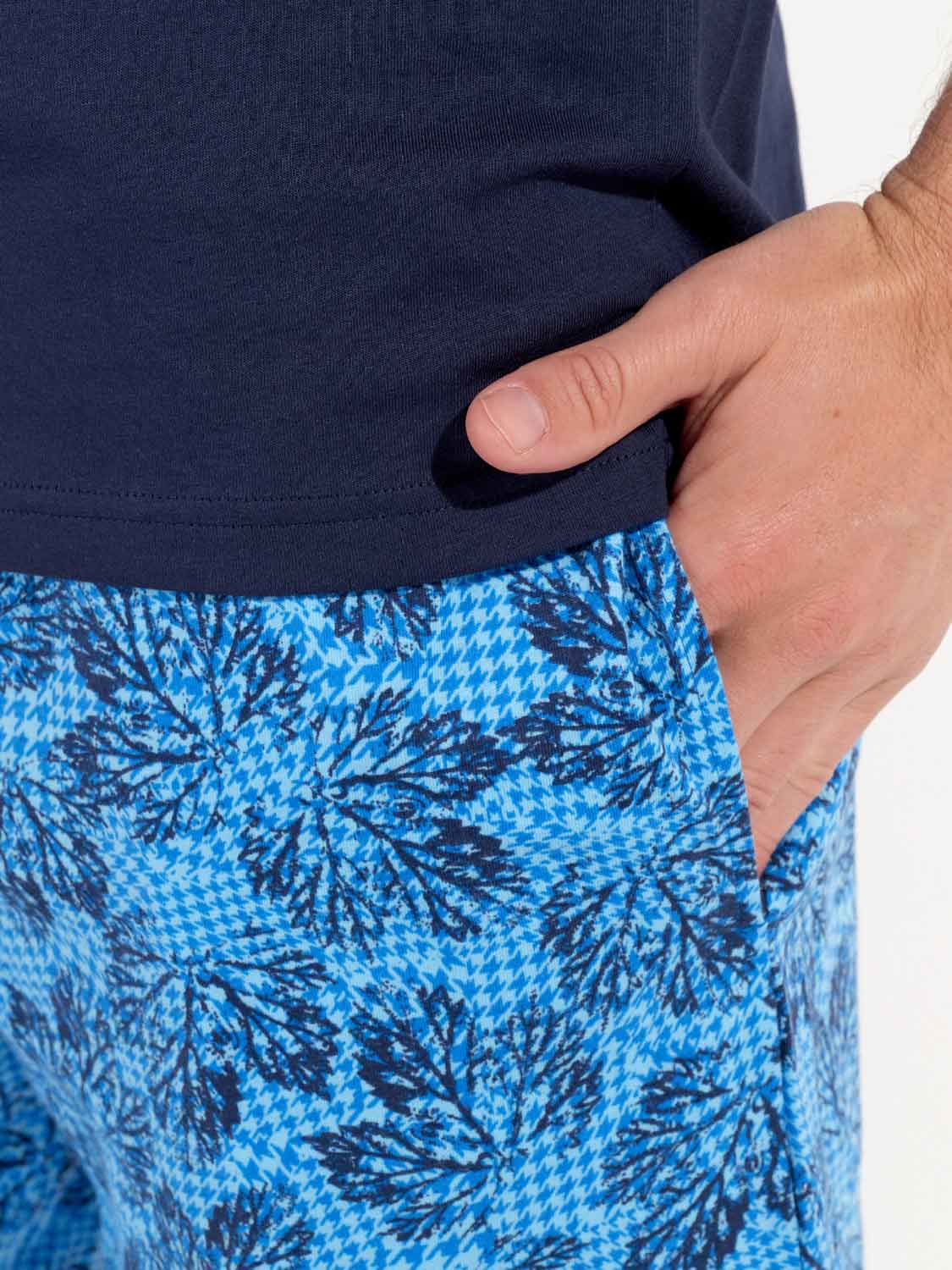 Douro - Shortama on valmistettu 100% puuvillasta, jersey-kankaasta. Pyjama koostuu yksivärisestä lyhythihaisesta T-paidasta tummansinisellä, pyöreällä kauluksella ja napeilla. Shortseissa on leikkisä lehtikuvio sinisellä taustalla ja sivutaskut molemmilla puolilla. Shortseissa on myös kiristysnyöri vyötäröllä täydellisen istuvuuden säätämiseksi.
