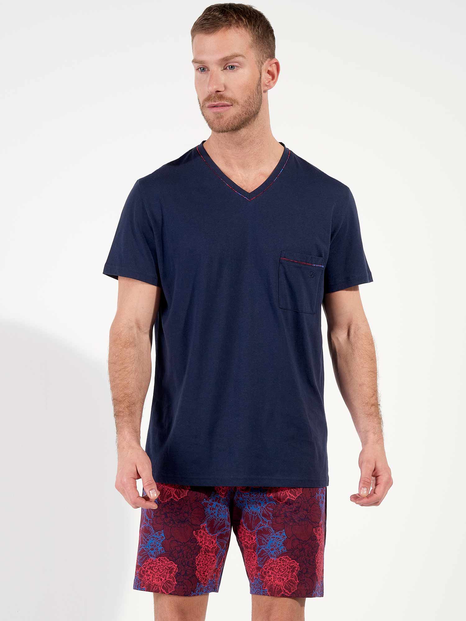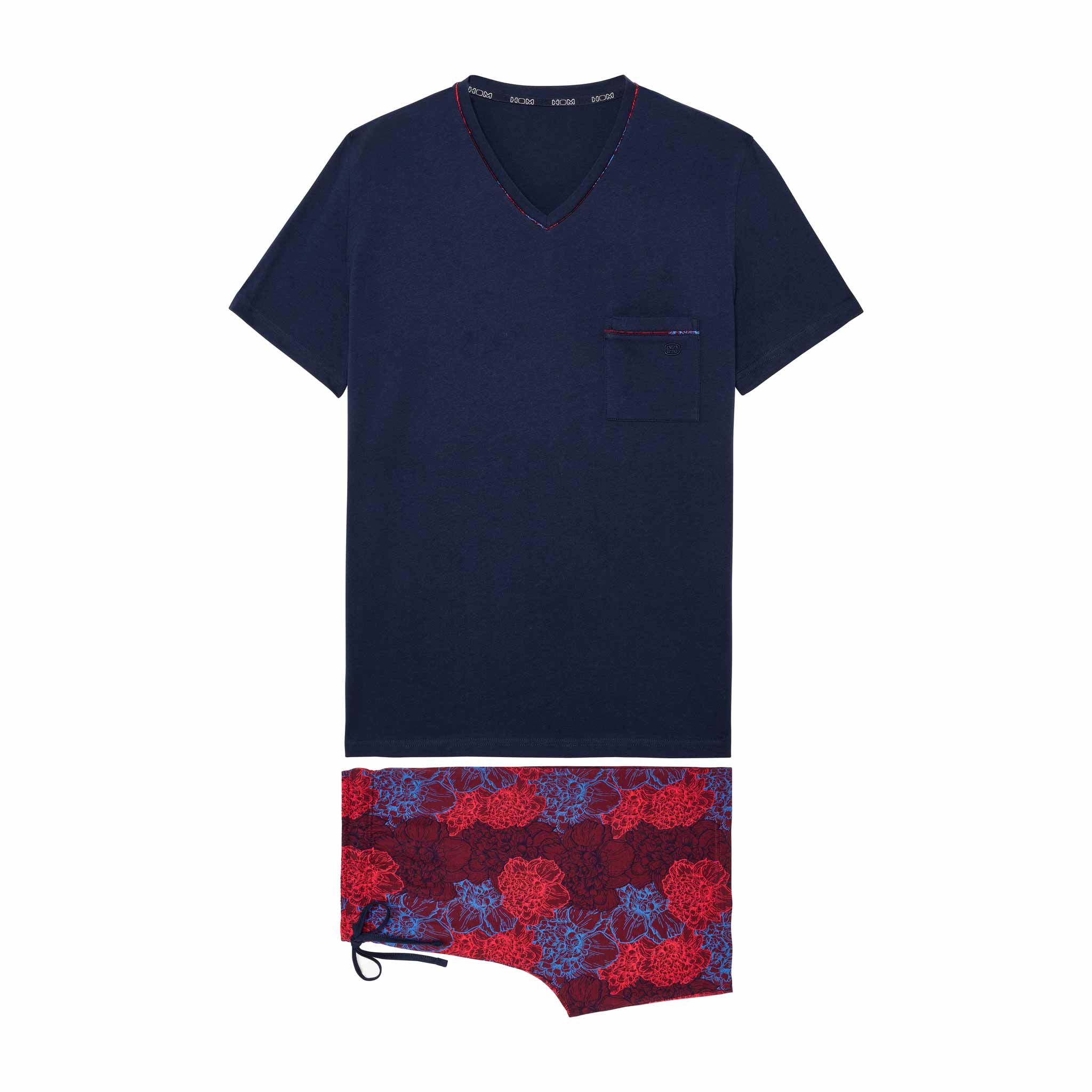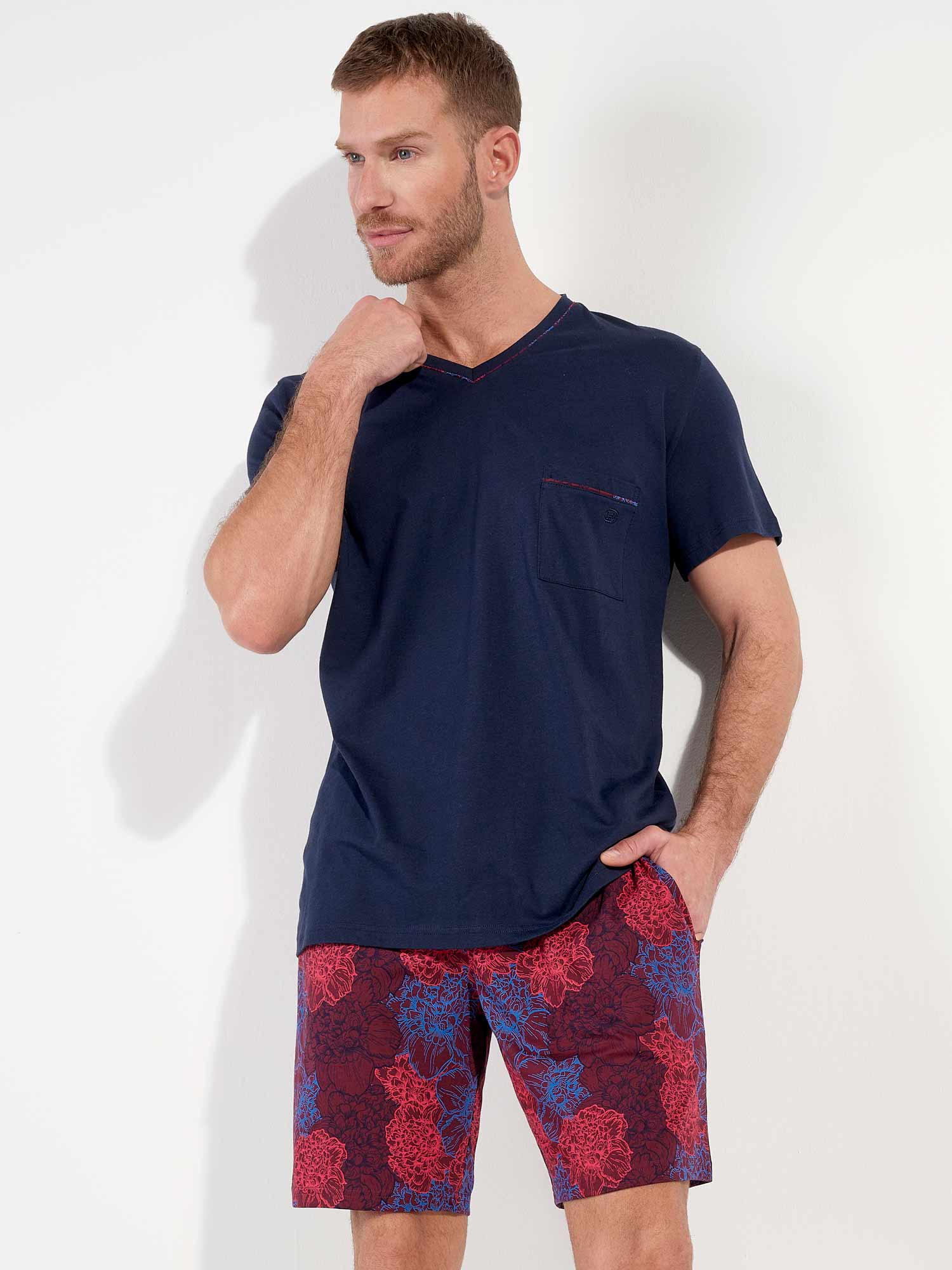 Le shortama Bouquet allie fantaisie et confort raffiné. Composé à 100 % de coton, il est doux et agréable à porter – parfait pour ceux qui préfèrent des pyjamas légers, même en automne ou dans un intérieur bien chauffé. Le T-shirt bleu marine arbore un col en V avec liseré fleuri et une poche poitrine assortie. Le short bordeaux, orné de fleurs rouges et bleues, complète ce look élégant. Un pyjama expressif pour les hommes soucieux de leur style et de leur bien-être – toute l’année.
