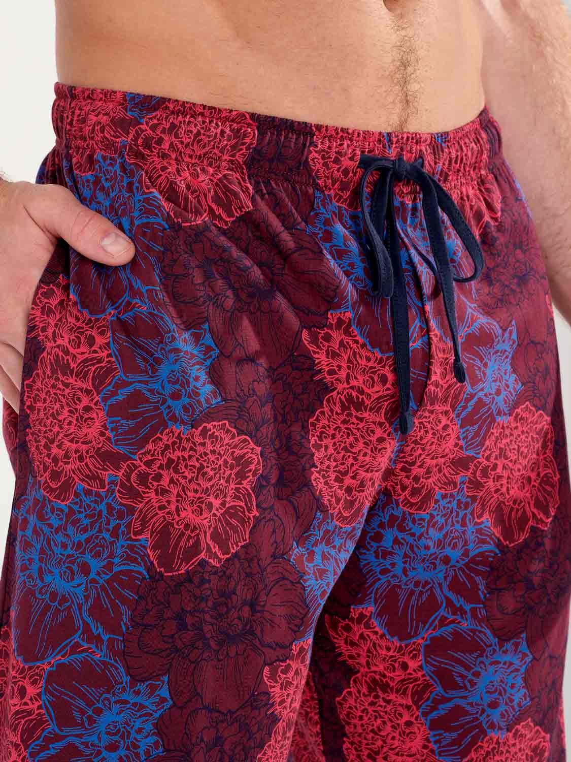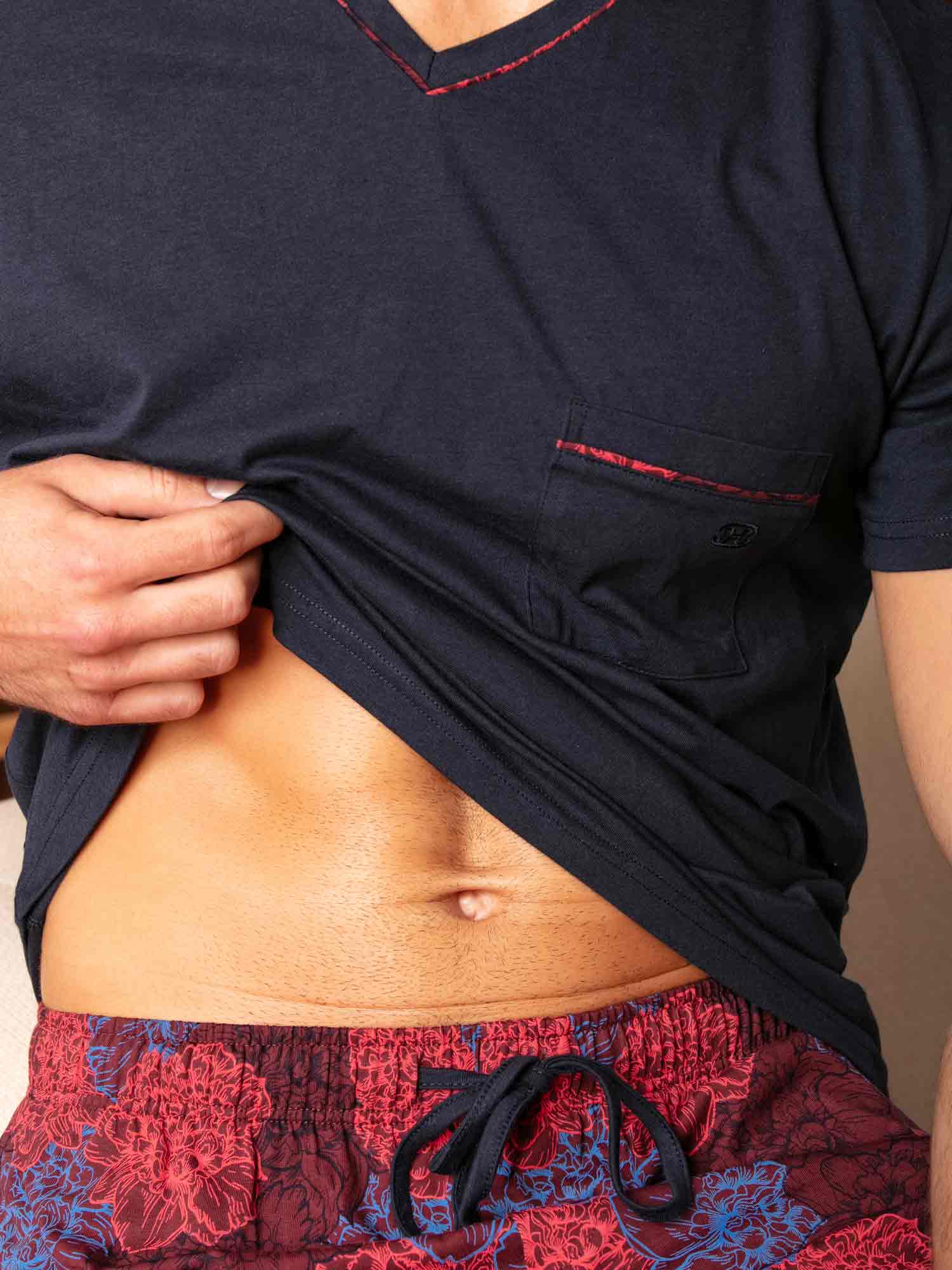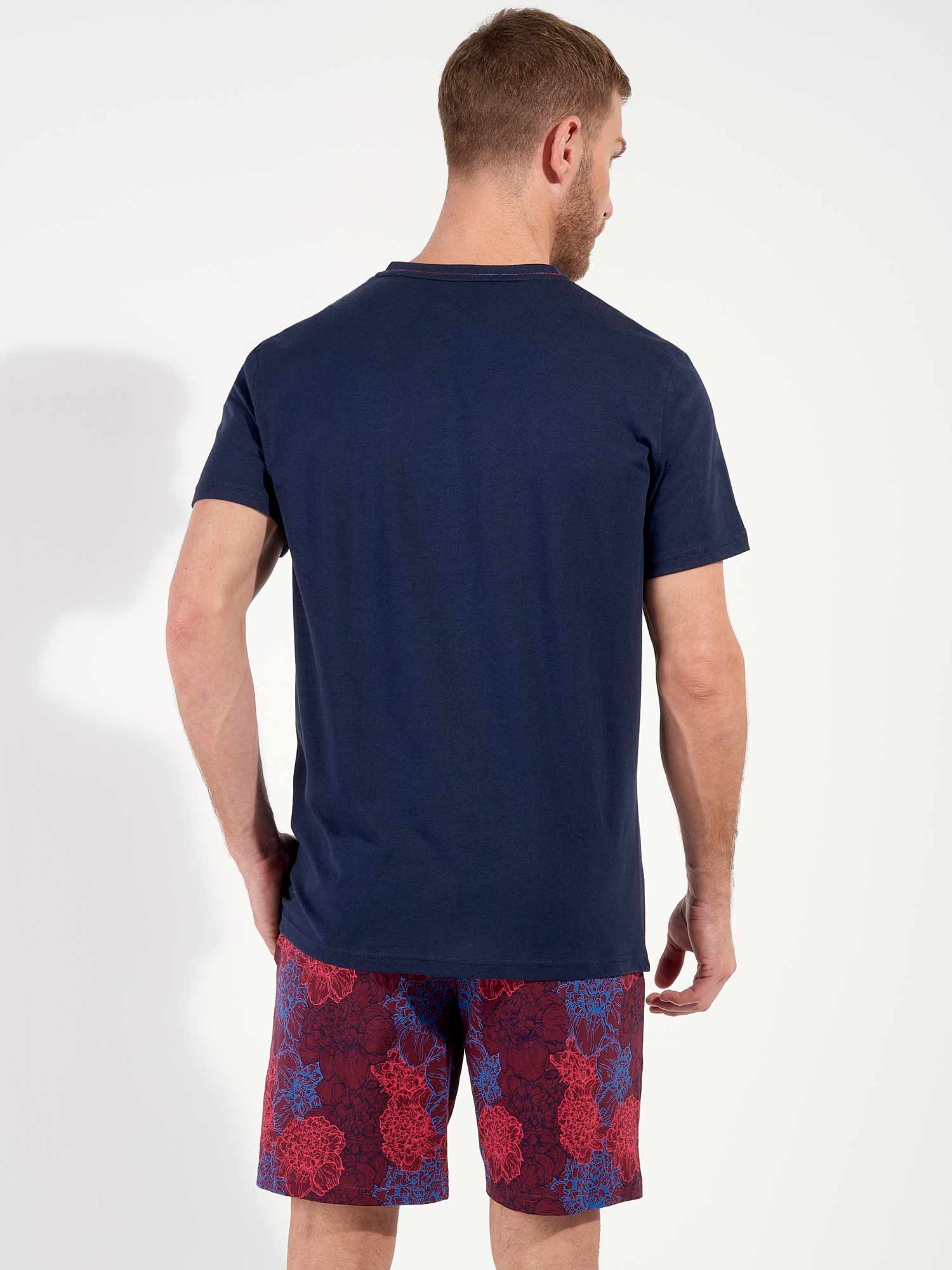 Le shortama Bouquet allie fantaisie et confort raffiné. Composé à 100 % de coton, il est doux et agréable à porter – parfait pour ceux qui préfèrent des pyjamas légers, même en automne ou dans un intérieur bien chauffé. Le T-shirt bleu marine arbore un col en V avec liseré fleuri et une poche poitrine assortie. Le short bordeaux, orné de fleurs rouges et bleues, complète ce look élégant. Un pyjama expressif pour les hommes soucieux de leur style et de leur bien-être – toute l’année.