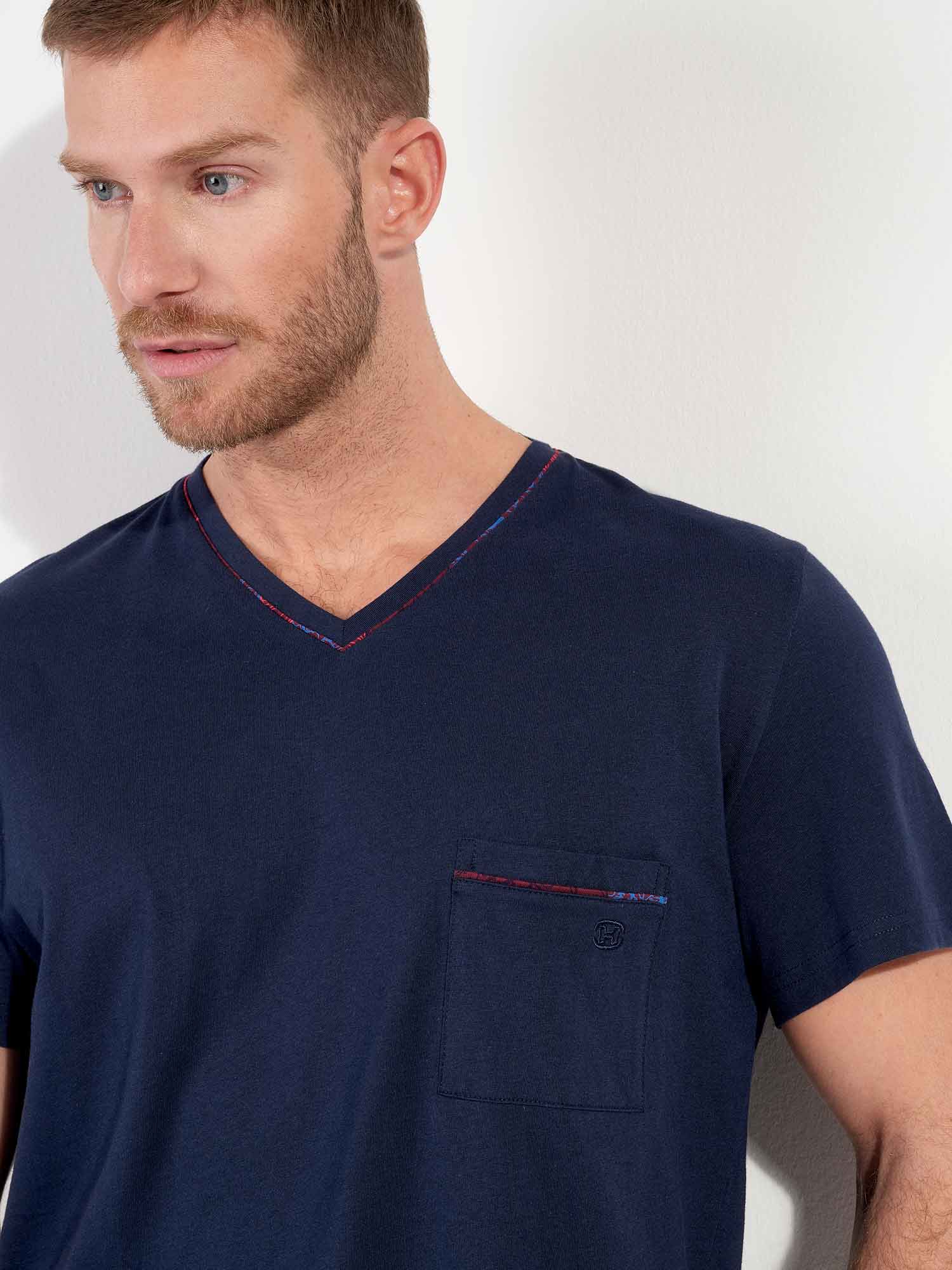 - T-shirt bleu marine avec poche poitrine et liseré fleuri