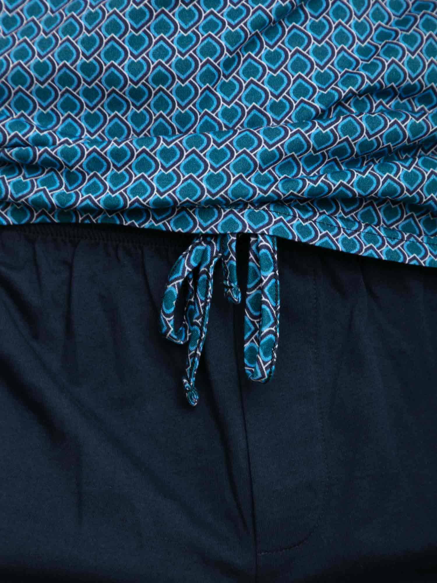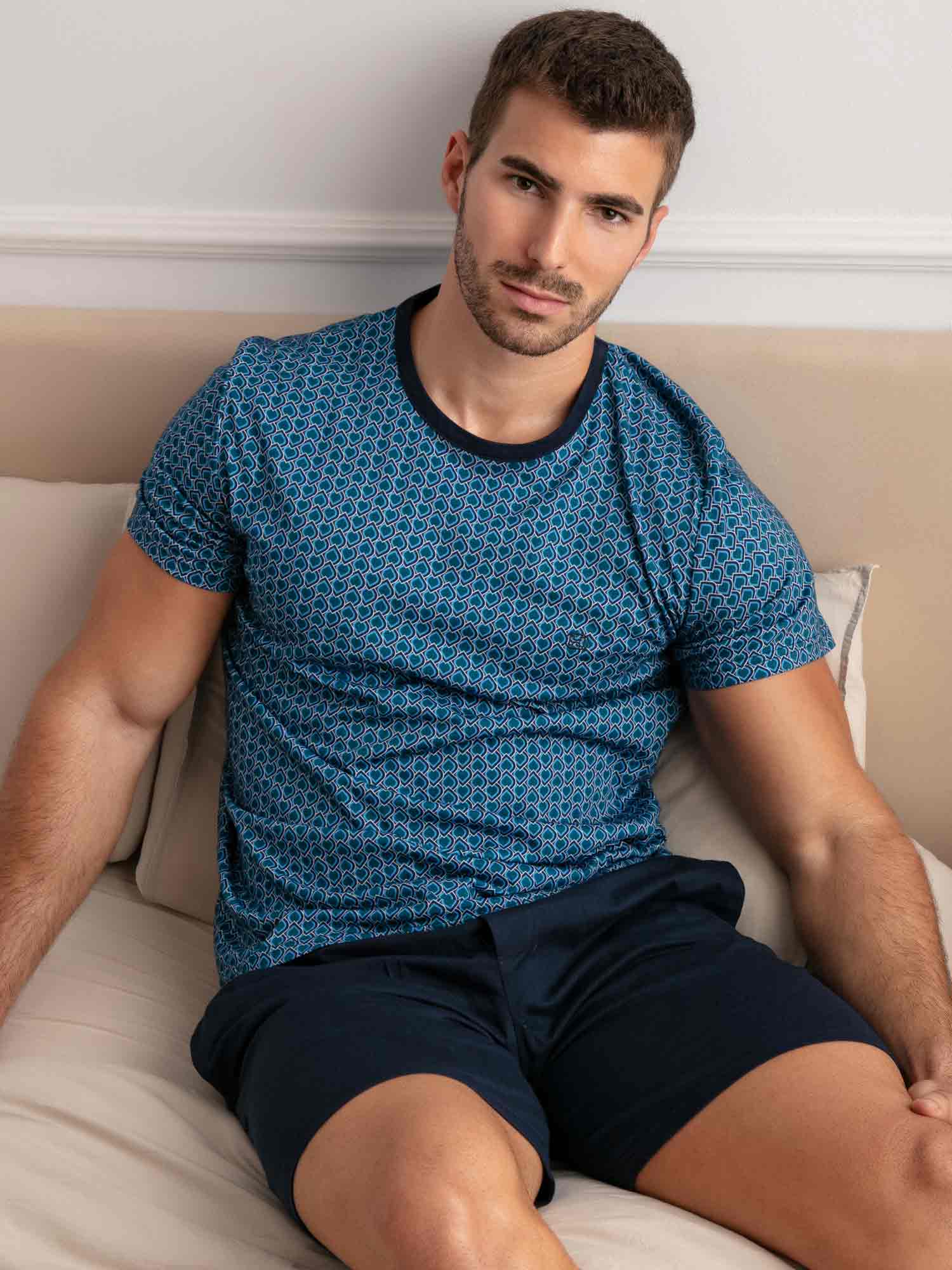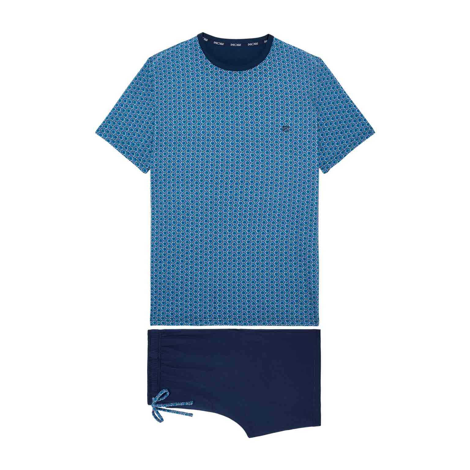 Avec son motif graphique et son jeu de couleurs raffiné, le shortama Martinez de HOM est un choix élégant pour les nuits chaudes ou les matins décontractés. Le t-shirt à manches courtes arbore un motif bleu inspiré de l’Art déco avec une touche d’ornements égyptiens. Le short bleu marine uni est doté de poches latérales et d’une ceinture élastique avec cordon imprimé assorti. Confectionné en 100 % coton, ce shortama est doux au toucher et confortable même après plusieurs lavages. Une élégance intemporelle dans une coupe moderne.