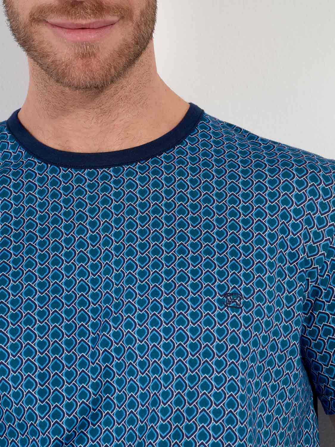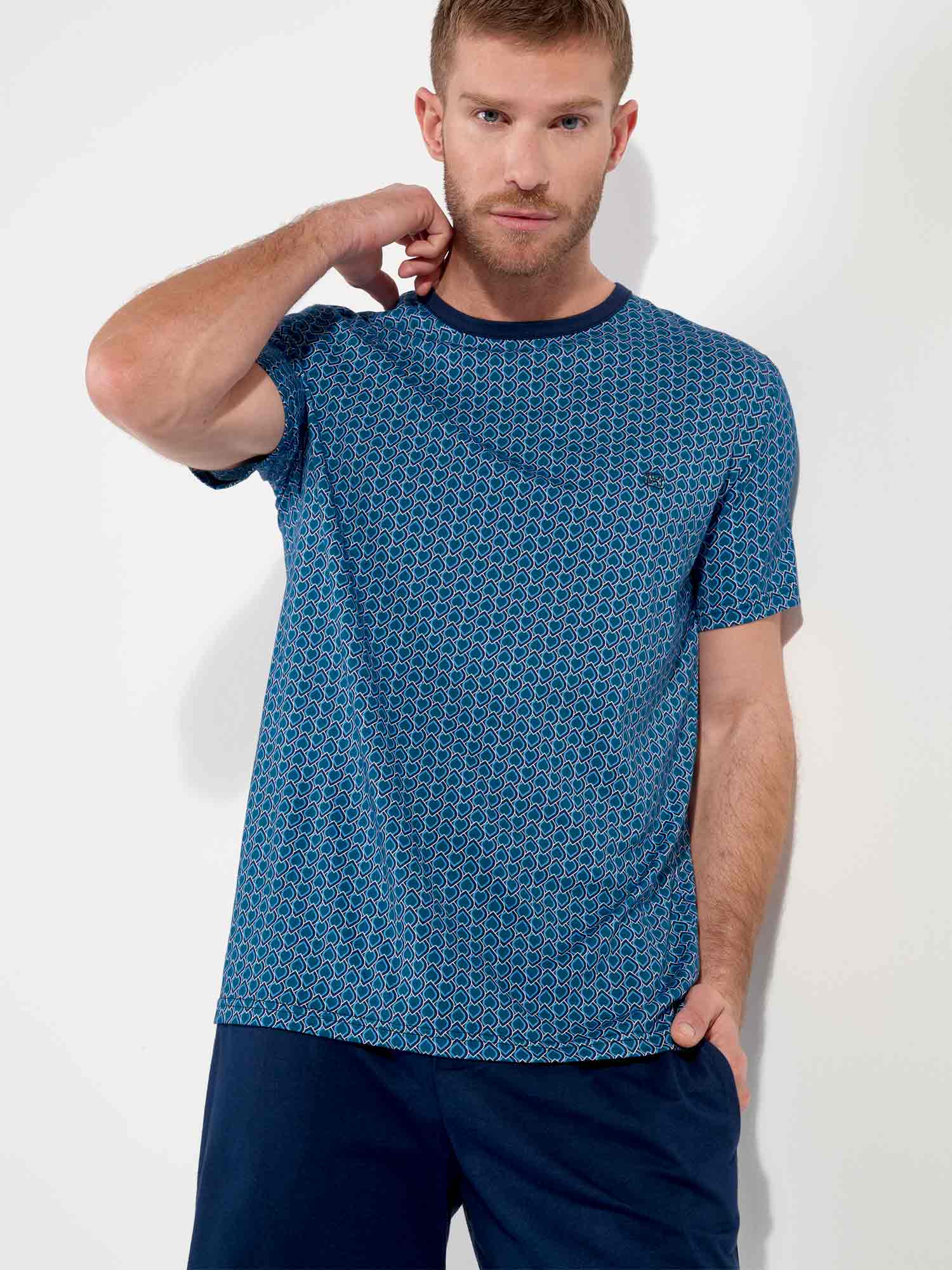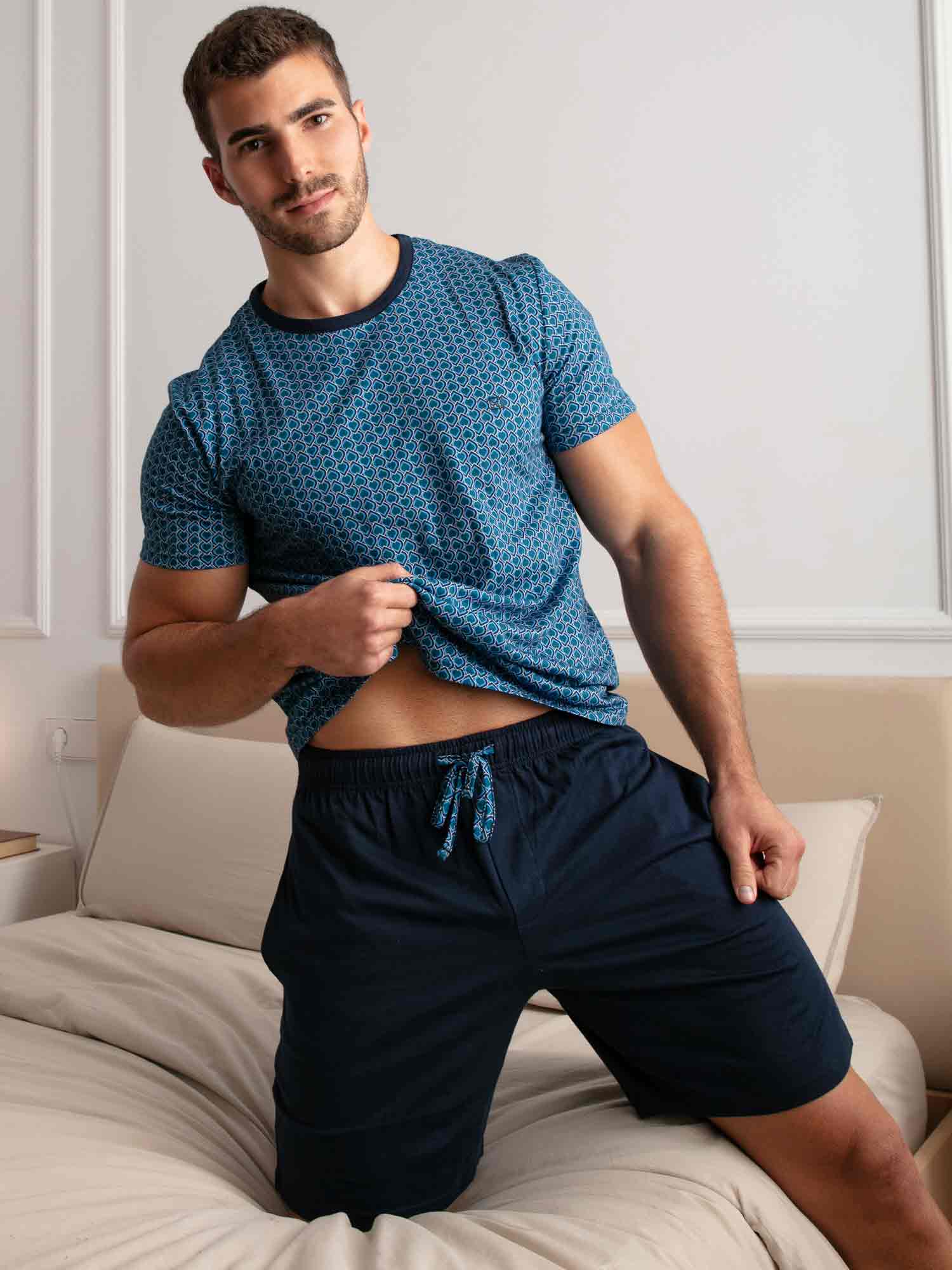 Avec son motif graphique et son jeu de couleurs raffiné, le shortama Martinez de HOM est un choix élégant pour les nuits chaudes ou les matins décontractés. Le t-shirt à manches courtes arbore un motif bleu inspiré de l’Art déco avec une touche d’ornements égyptiens. Le short bleu marine uni est doté de poches latérales et d’une ceinture élastique avec cordon imprimé assorti. Confectionné en 100 % coton, ce shortama est doux au toucher et confortable même après plusieurs lavages. Une élégance intemporelle dans une coupe moderne.