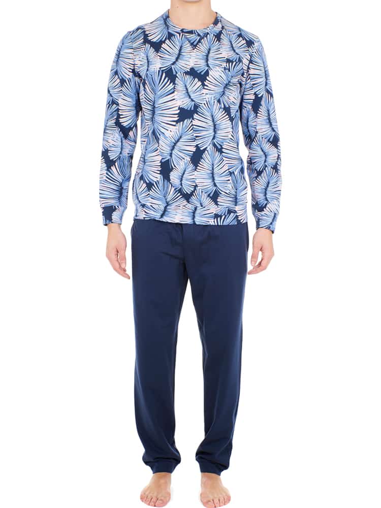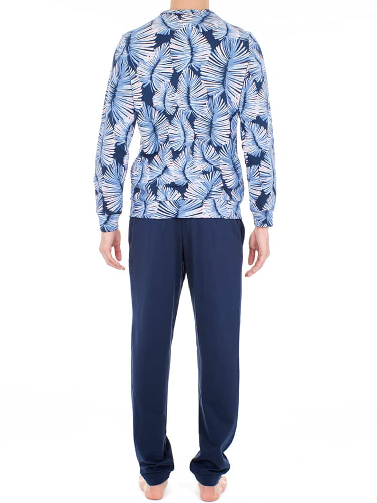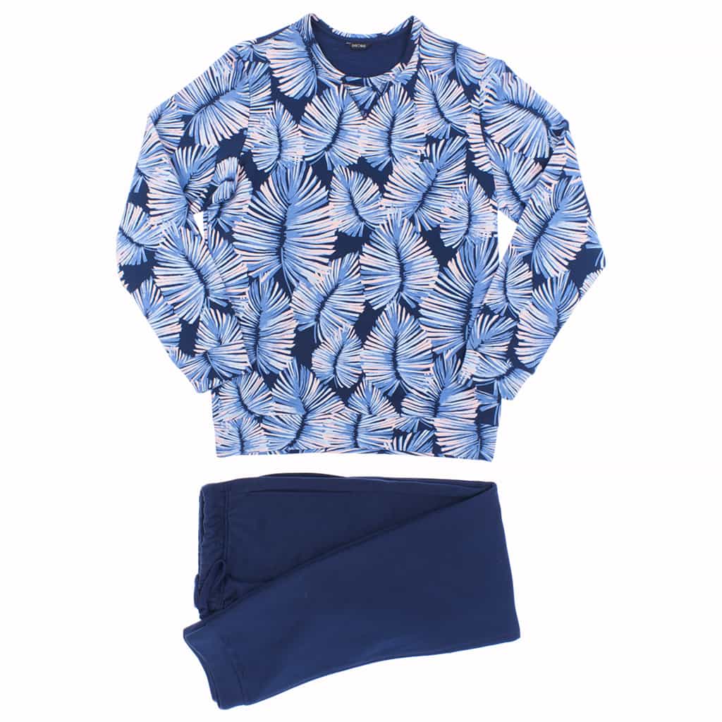 Het Isatis Huispak is gemaakt van een 100% katoen wat goed ademt, vocht opneemt en je lekker warm houdt. Het pak heeft een bladerpatroon en bestaat uit een top met lange mouwen en ronde hals met een een lange broek in een donkerblauwe kleur. De broek heeft een elastische heupband en heeft daarnaast steekzakken aan de linker en rechterzijde. Omdat de Isatis gemaakt is van 100% katoen is dit huispak perfect voor de man die graag enkel natuurlijke stoffen draagt. In dit huispak kun jij comfortabel op de bank kunt zitten en ontspannen.