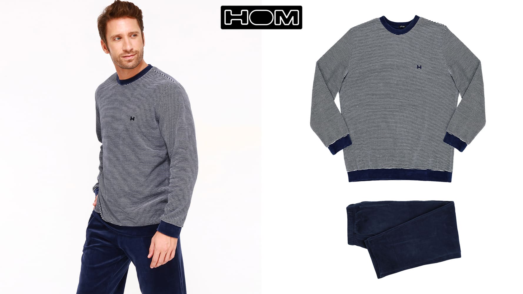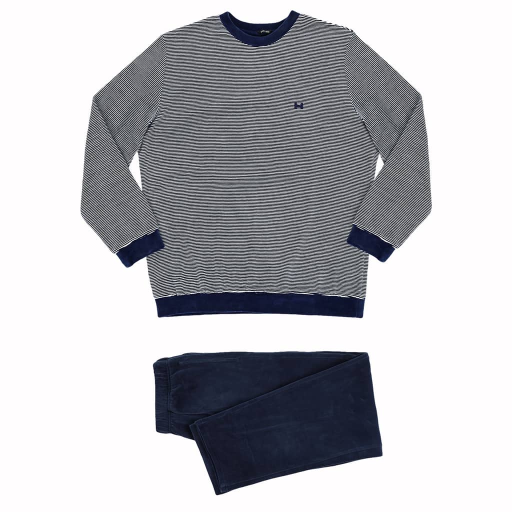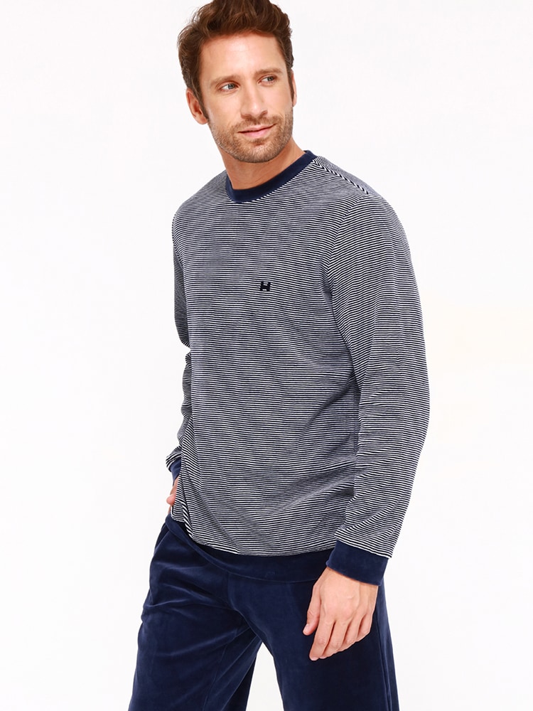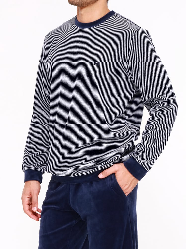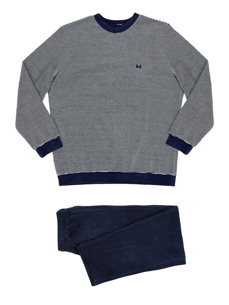 De Mirimair is een huispak gemaakt van zacht velours katoen gemixt met polyester waardoor het huispak een zachte touch heeft. Het pak bestaat uit een top met lange mouwen en een ronde hals en een effen broek. De afwerking van de top is functioneel met banden aan het einde van de mouwen en rondom de taille, zodat de warmte behouden blijft. De broek van deze indoor-set loopt losjes langs het been en heeft een elastische heupband voor een comfortabele fit. De broek heeft zakken aan de linker en rechterzijde en is net als de top gemaakt van velours, wat je lekker warm houdt en zacht op de huid ligt. Omdat het pak is gemaakt van een mix met katoen blijft de temperatuur comfortabel gereguleerd en is het pak makkelijk te reinigen. De broek is uitgevoerd in effen marine blauw met een top met horizontale marine blauw/witte lijnen.