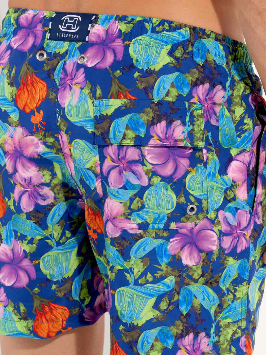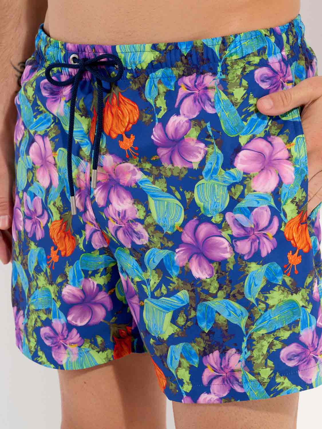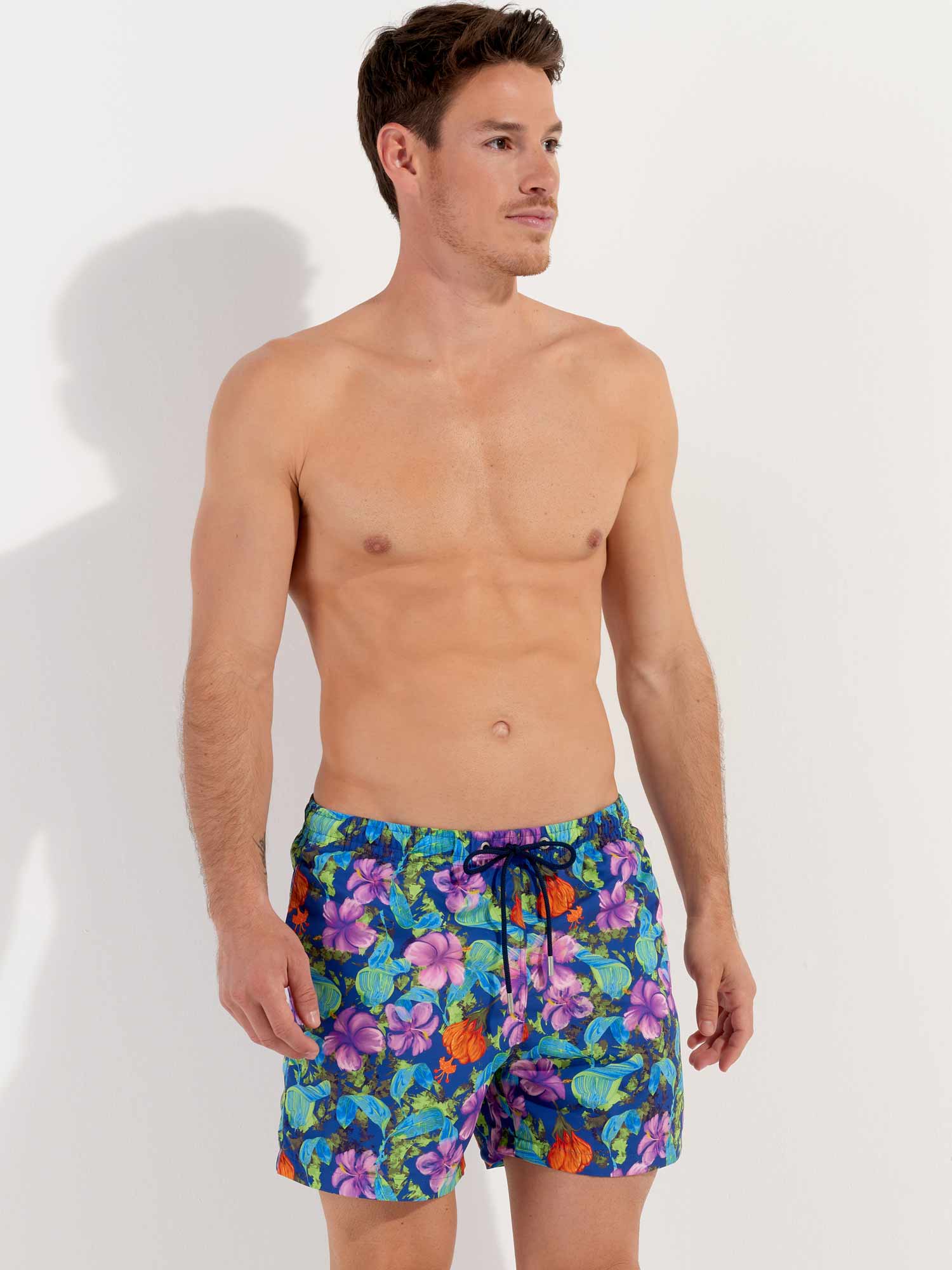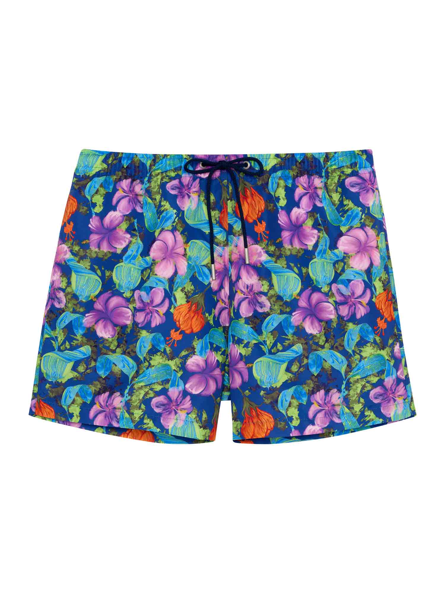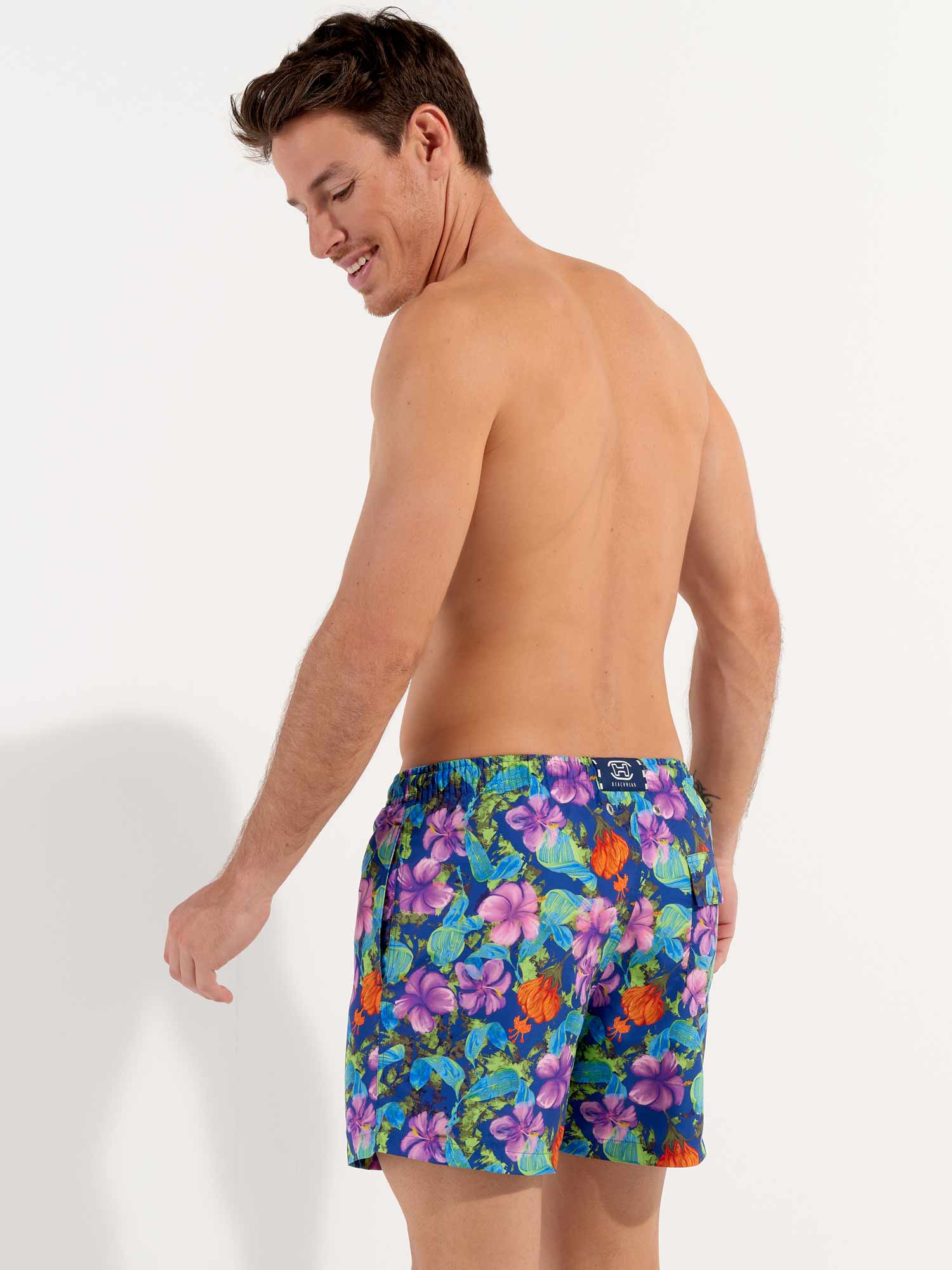 I Balata - Beach Boxer presentano una splendida stampa floreale. I magnifici giardini botanici di Balata sono evocati in questo design floreale in tonalità malva, arancione e verde chiaro su sfondo blu — un invito a viaggiare verso la meravigliosa isola della Martinica. I Beach Boxer hanno tasche laterali a sinistra e a destra nella cucitura e includono una fodera interna per maggiore comfort e sostegno. Il laccetto in vita permette di regolarli perfettamente alla tua misura, così puoi tuffarti con sicurezza. Il tessuto è in poliestere, il che rende i Beach Boxer a rapida asciugatura. Ideali per la spiaggia o per una sosta in terrazza dopo il bagno.