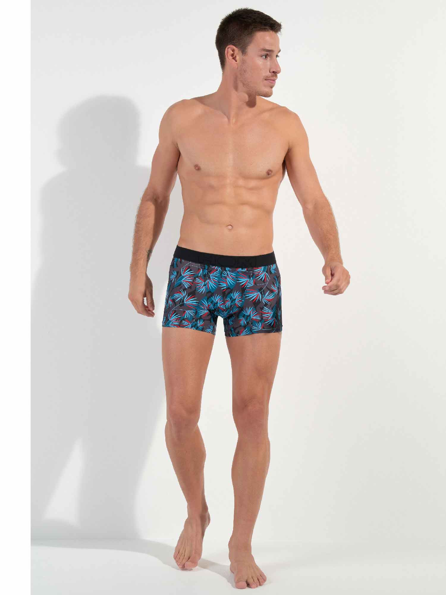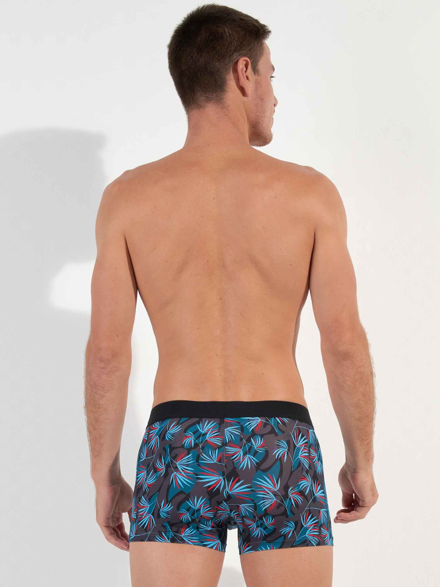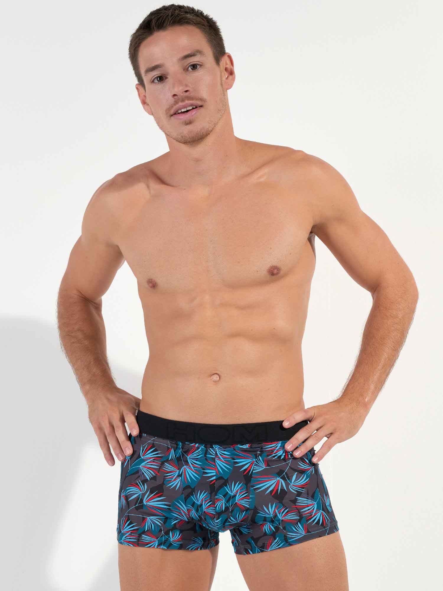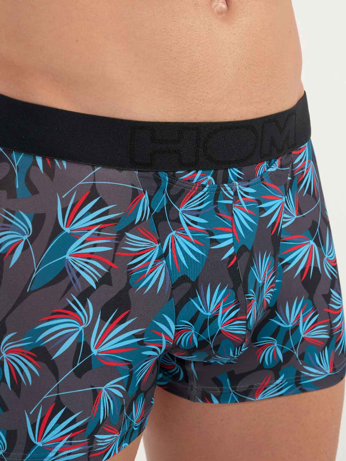Gli Hanoï - HO1 Slip sono realizzati in confortevole microfibra e presentano l'apertura orizzontale, la patta speciale per maggiore praticità, per cui HOM è famoso. Questi slip da uomo hanno una stampa accattivante di piante esotiche in turchese, azzurro e arancione, su uno sfondo mimetico grigio e blu. Gli Hanoï hanno una fascia elastica in vita realizzata in cotone con il logo HOM in tono su tono.