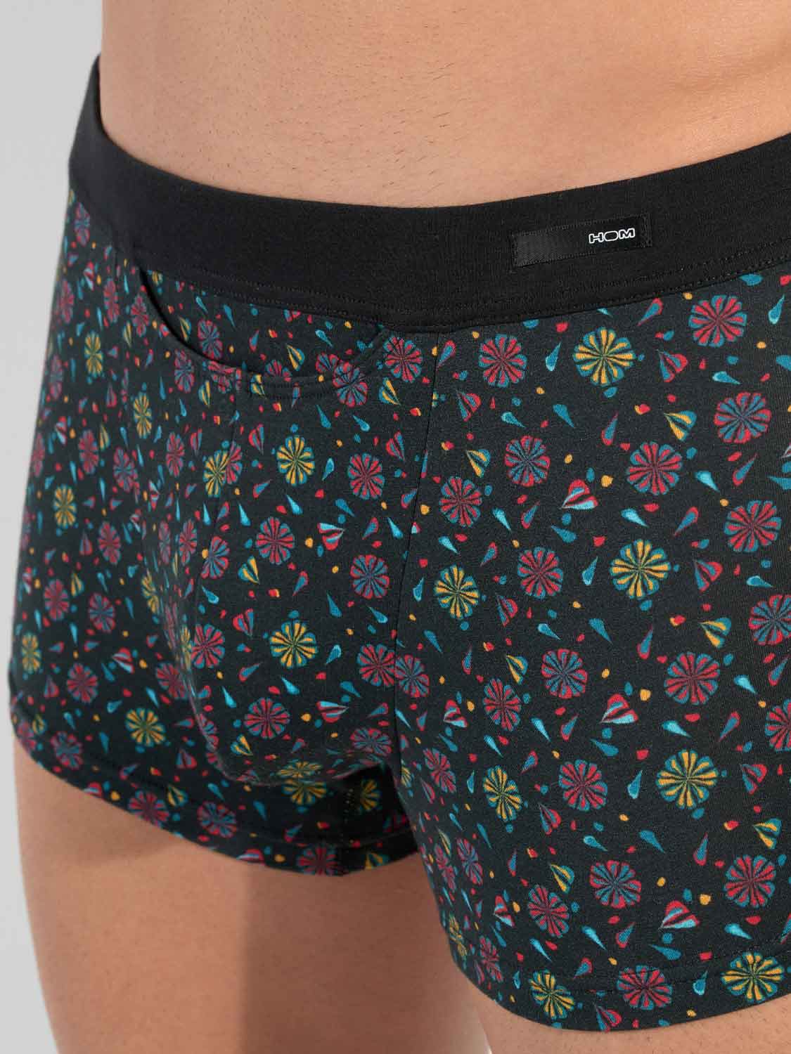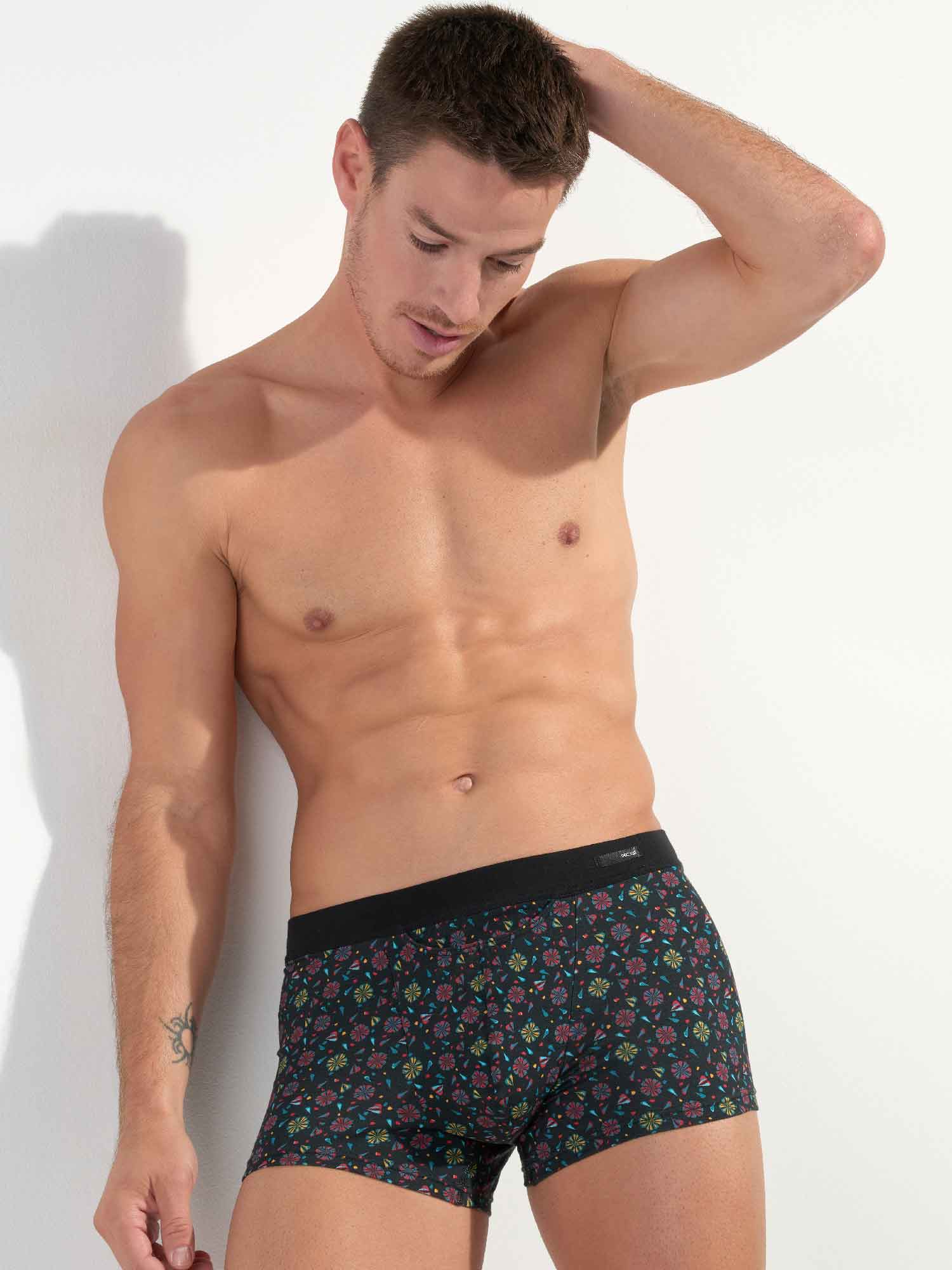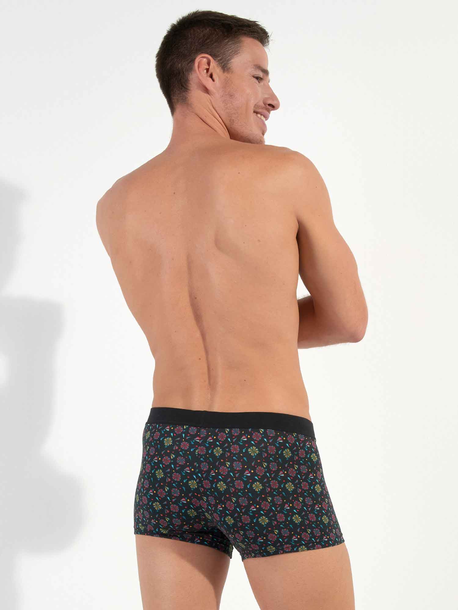 I Menorca - HO1 Comfort Boxer Briefs sono realizzati in cotone modal e presentano l'apertura orizzontale, la patta speciale per un comfort extra, per cui HOM è famoso. Questi boxer da uomo hanno una stampa floreale astratta su uno sfondo nero. I Menorca sono progettati con una cintura comfort, dove il tessuto è ripiegato sulla fascia elastica per un maggiore comfort. Una piccola etichetta HOM è posizionata sulla parte anteriore sinistra della fascia comfort.