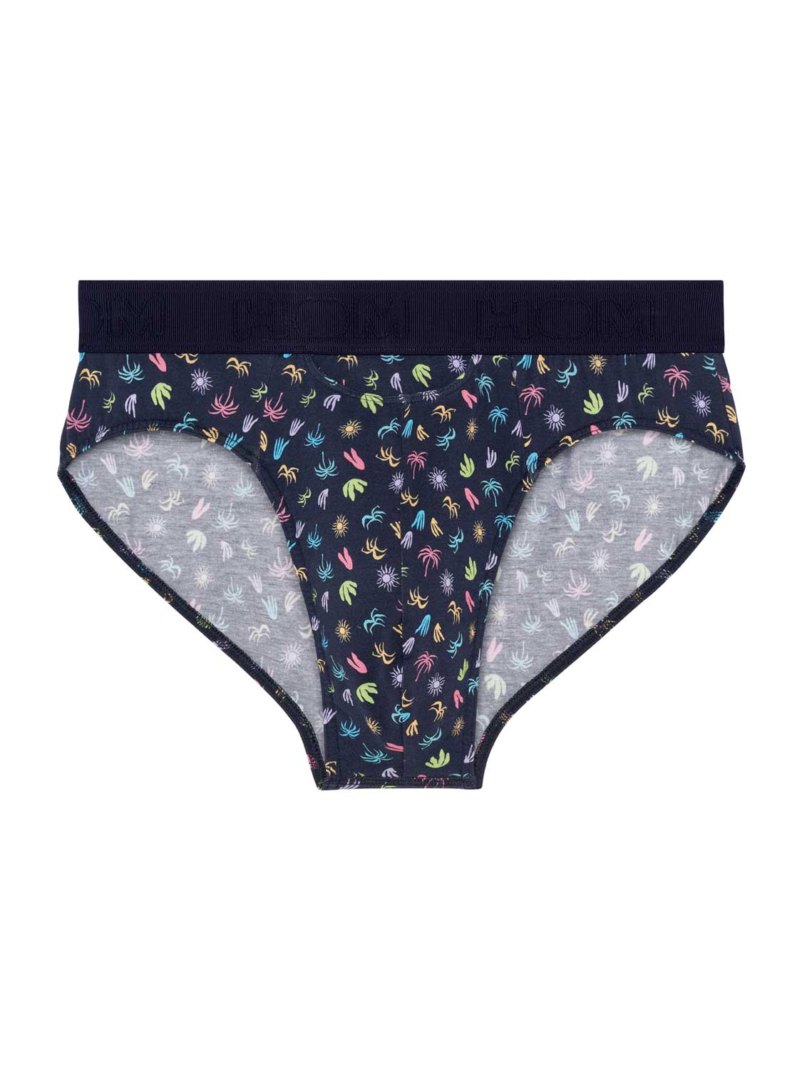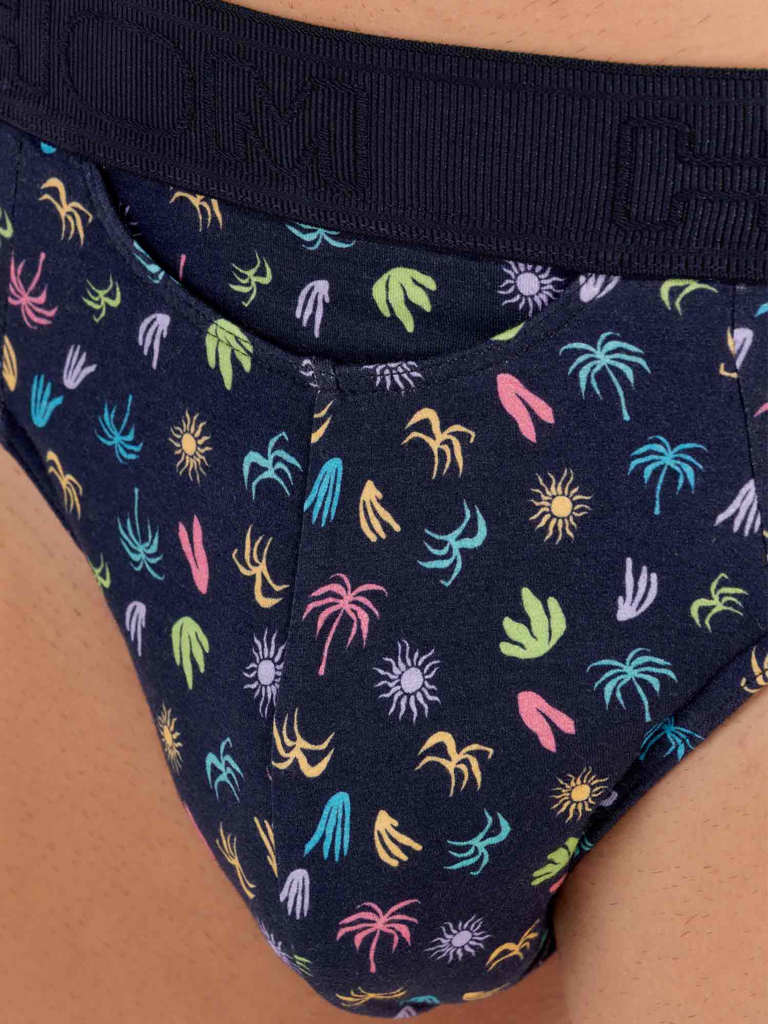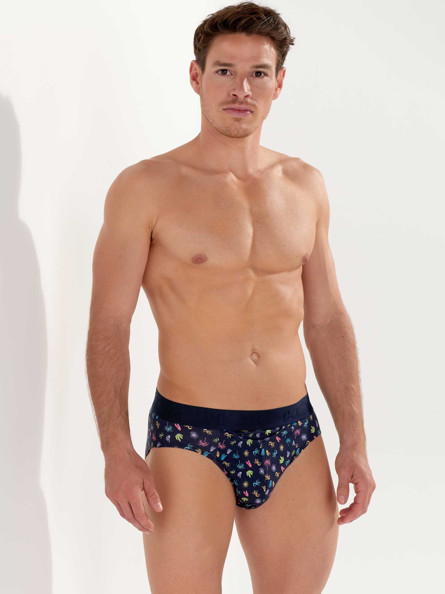 Il California - HO1 Mini Brief è realizzato in cotone-modal e presenta l'apertura orizzontale, il dettaglio caratteristico di HOM per maggiore praticità. Questo slip da uomo presenta una microstampa esotica multicolore che richiama la morbidezza di una vacanza californiana, con piccole palme e soli dai colori vivaci, in uno stile Coachella. Il California è dotato di una fascia elastica a coste con il logo HOM ricamato tono su tono.
