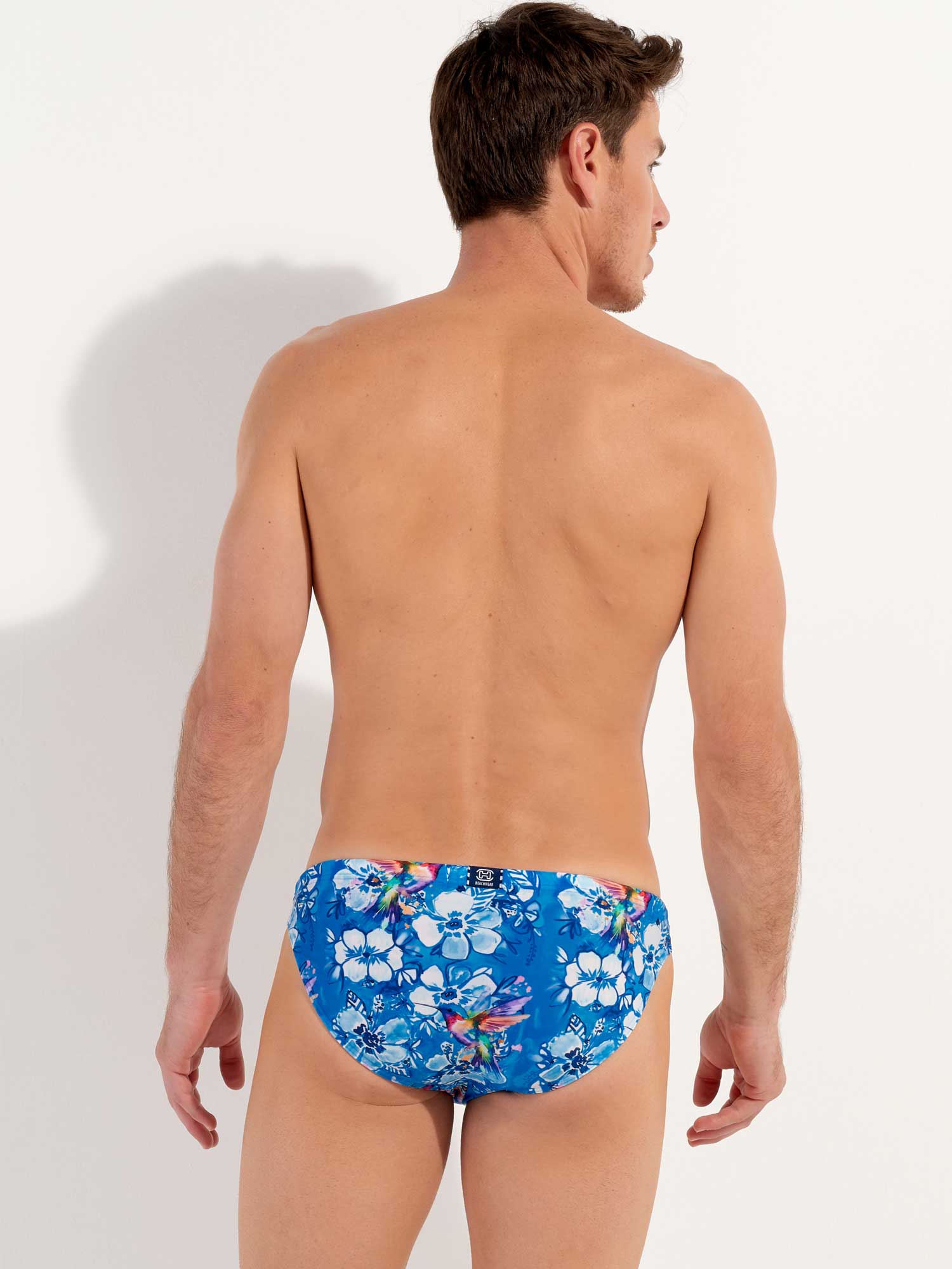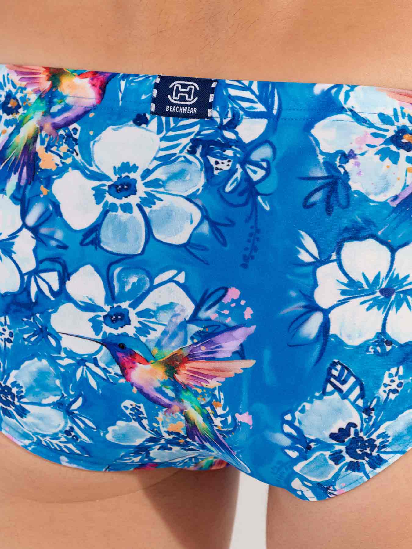 I Colibris - Swim Micro Briefs fanno parte della collezione estiva di costumi da bagno HOM. Colibrì dai colori vivaci su un design floreale esotico in tonalità di blu evocano la natura tropicale dei Caraibi. Il tessuto è elastico, aderisce bene alla pelle e non è trasparente. Essendo un modello micro brief, i costumi si portano bassi sui fianchi. Il laccetto in vita permette di regolare perfettamente il costume alla tua misura.