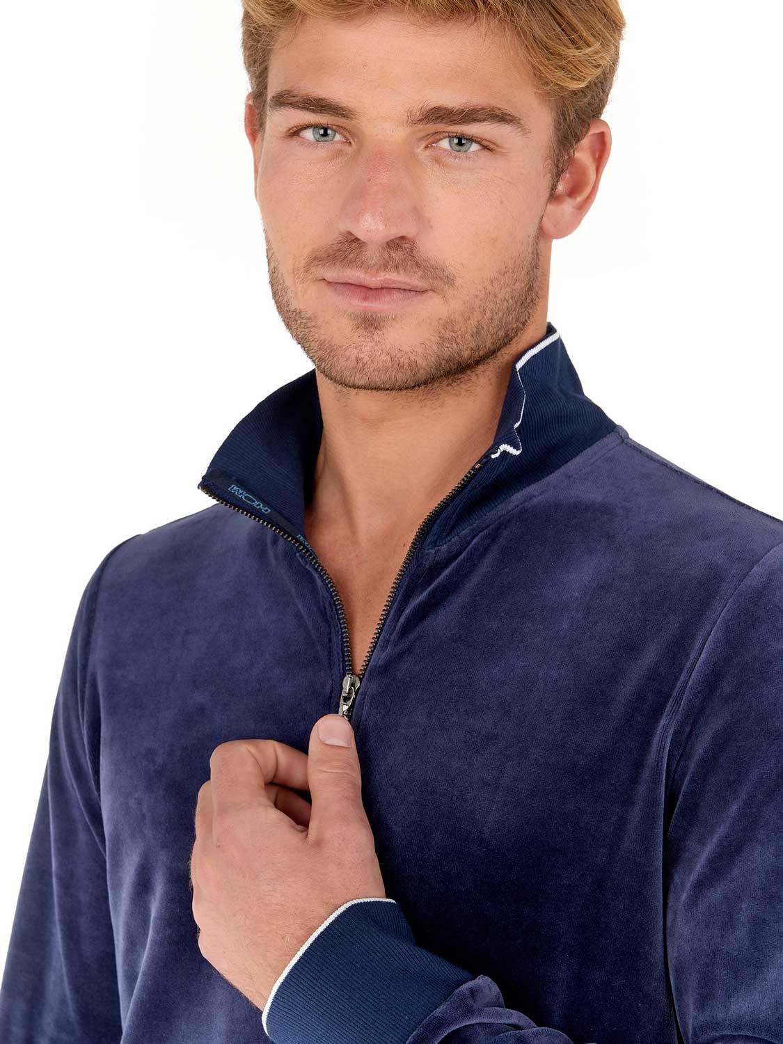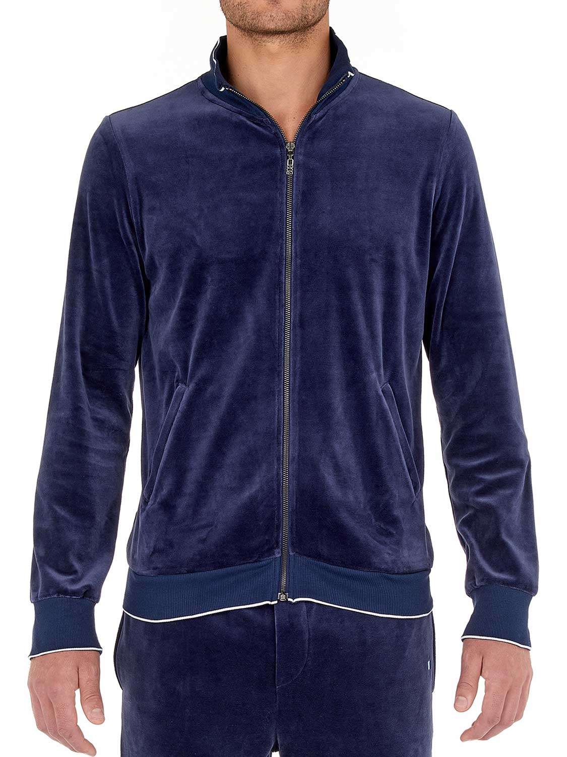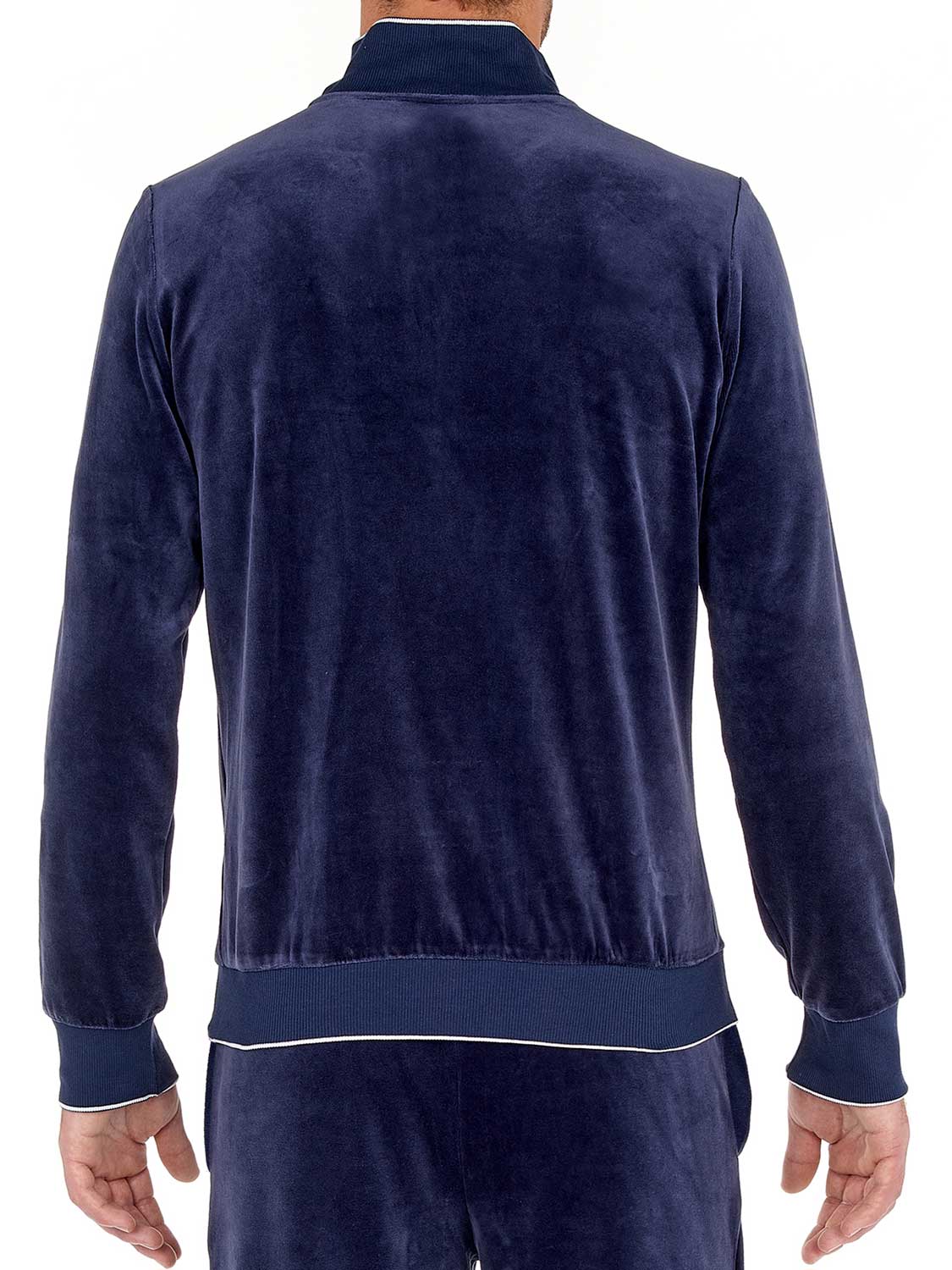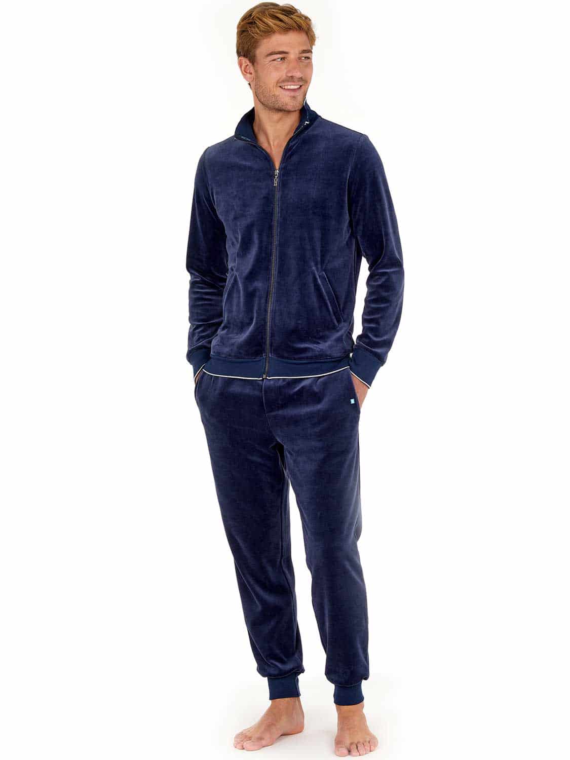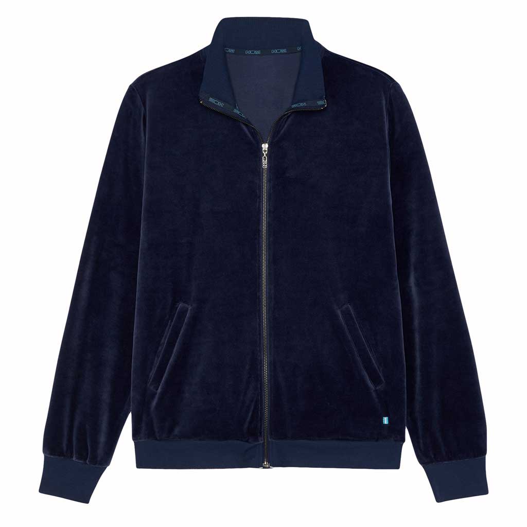 De Jacket - Catane is gemaakt van zacht velours katoen gemixt met polyester voor een zachte touch. Uitgevoerd in de kleur marine blauw met lange mouwen en een verhoogde hals met een ritssluiting waarmee je de jacket geheel kunt openen of sluiten. Omdat de Catana is gemaakt van een mix met katoen blijft de temperatuur comfortabel gereguleerd en is het jacket makkelijk te reinigen. Je kunt de Jacket combineren met de bijbehorende broek tot een compleet huispak.