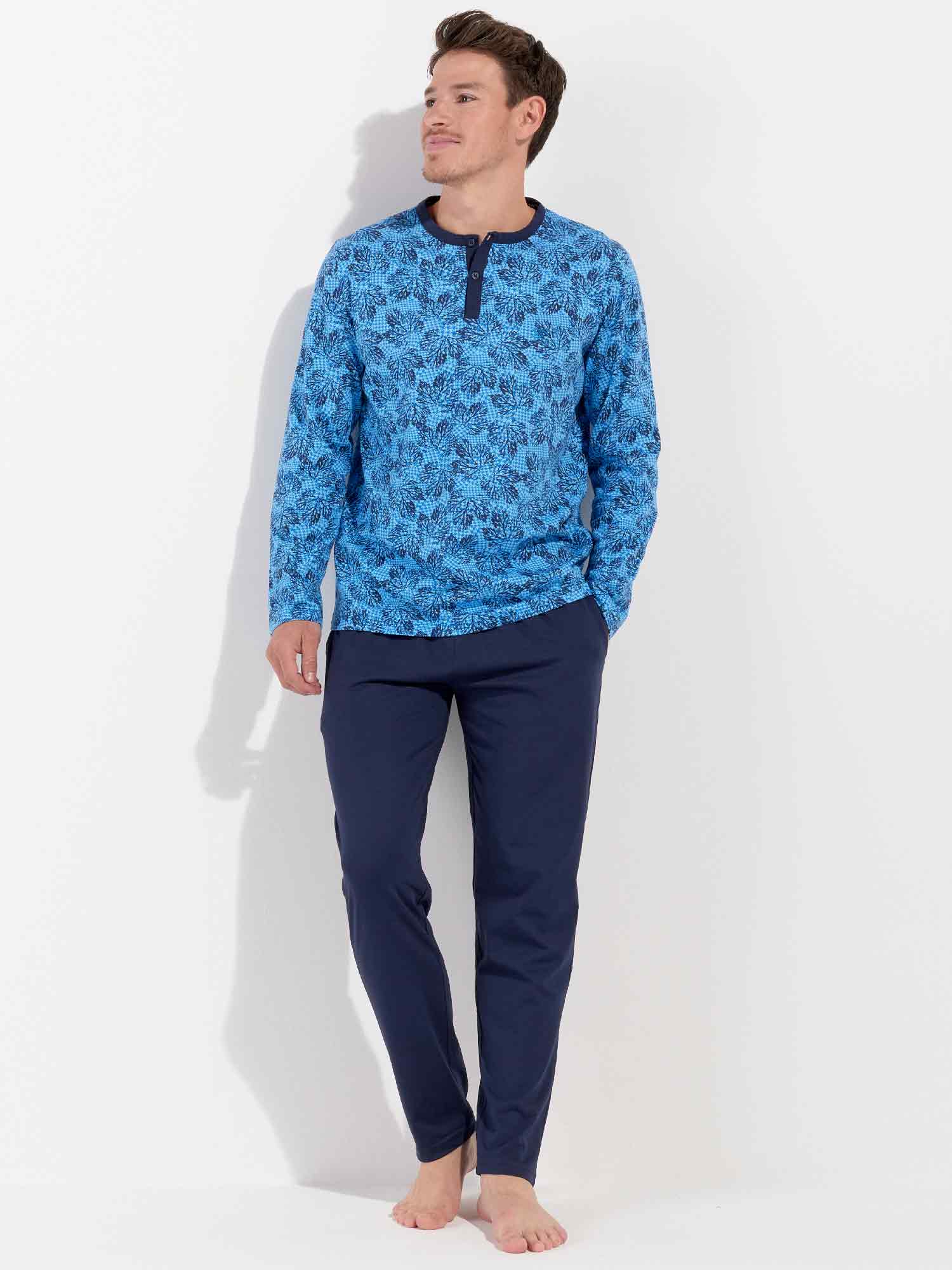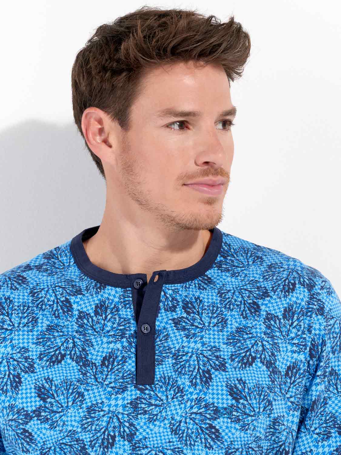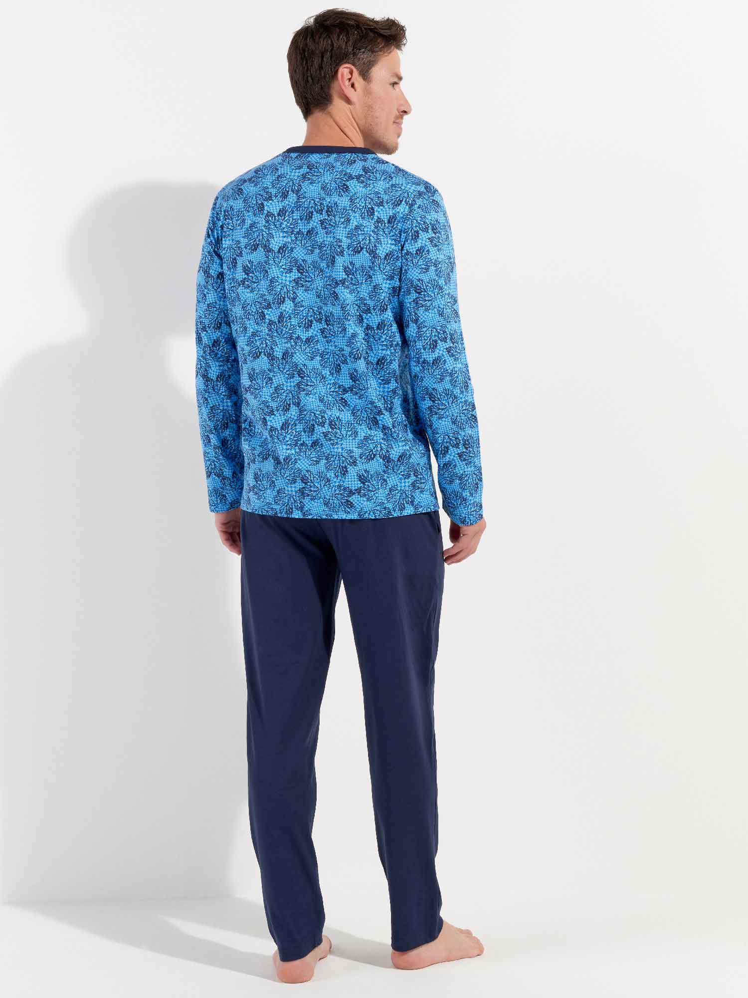 De Douro - Long Sleepwear is gemaakt van 100% katoen uitgevoerd in een jersey. De pyjama beschikt over een T-shirt met lange mouwen en een ronde kraag met knopen. De lange broek is effen uitgevoerd met steekzakken in de zoom, aan de linker en rechterzijde. De lange broek beschikt over een trekkoord om de broek perfect op maat te brengen. Het shirt heeft een blader print op een zure blauwe achtergrond.