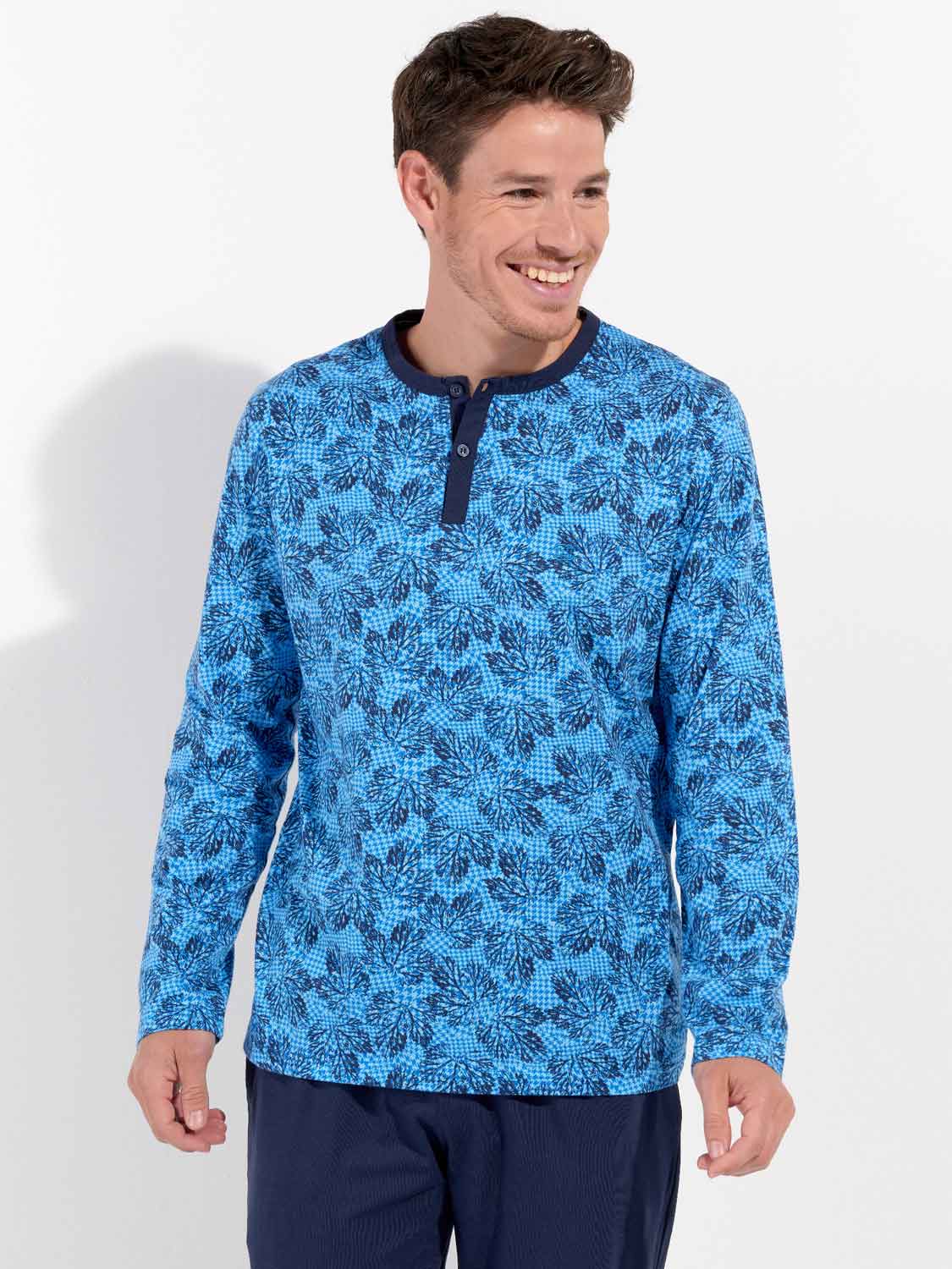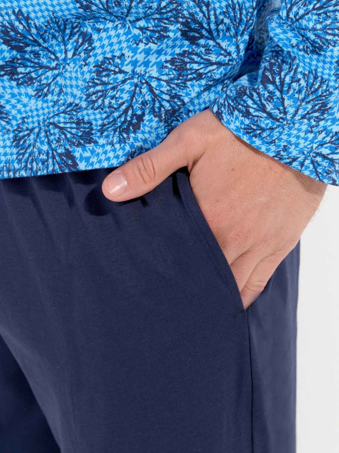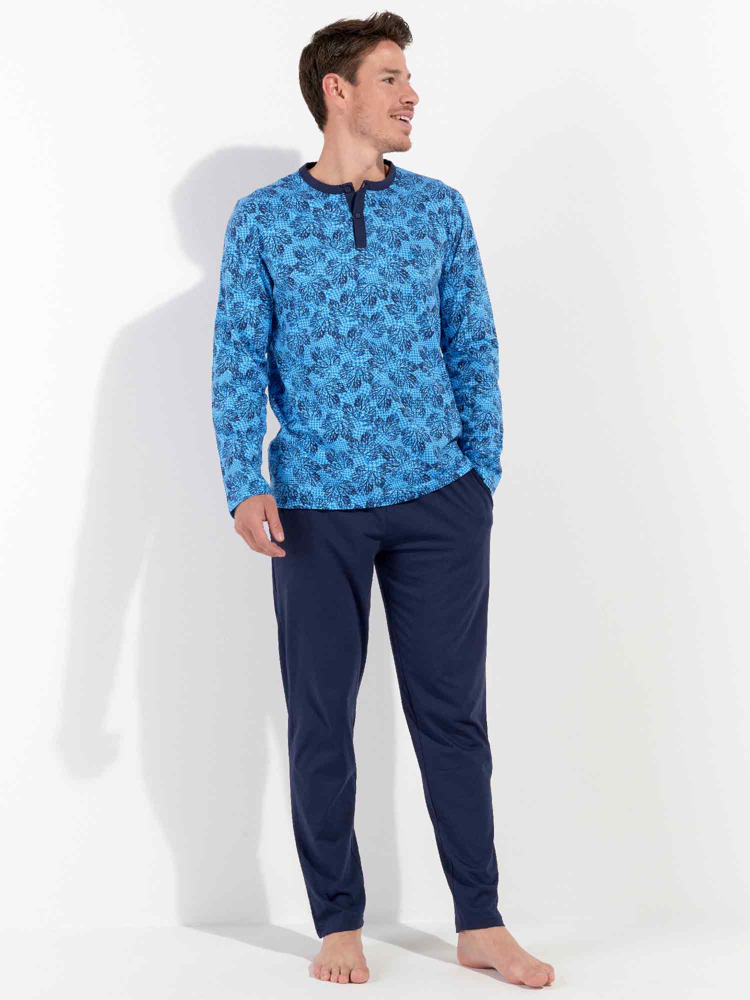 De Douro - Long Sleepwear is gemaakt van 100% katoen uitgevoerd in een jersey. De pyjama beschikt over een T-shirt met lange mouwen en een ronde kraag met knopen. De lange broek is effen uitgevoerd met steekzakken in de zoom, aan de linker en rechterzijde. De lange broek beschikt over een trekkoord om de broek perfect op maat te brengen. Het shirt heeft een blader print op een zure blauwe achtergrond.