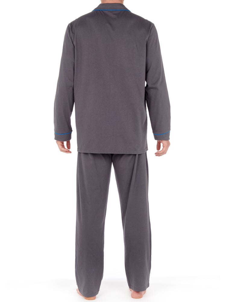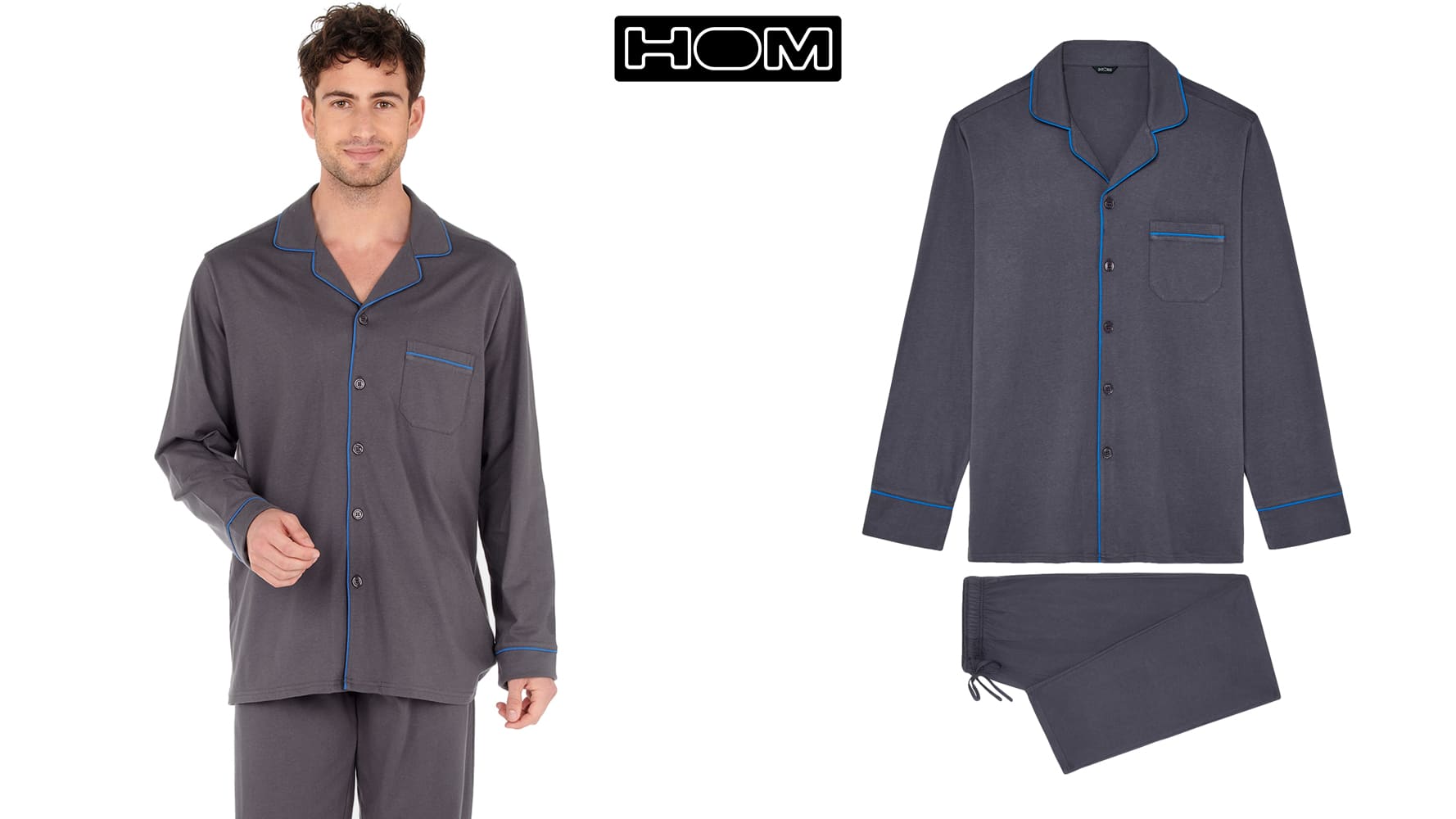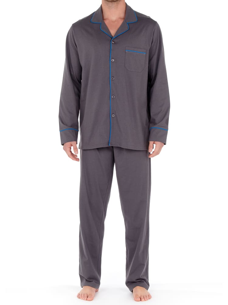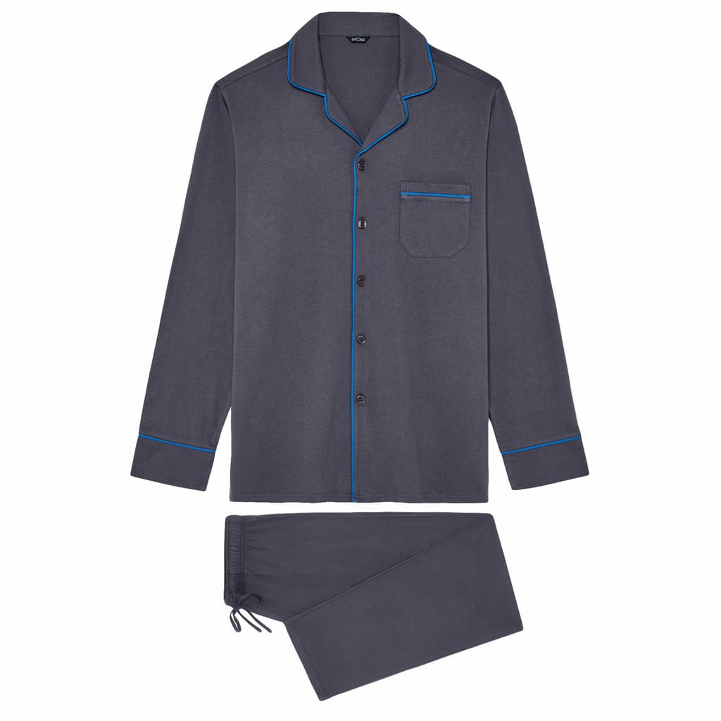 De Samena - Long Pyjama is een lange herenpyjama van 100% katoen in de kleur antraciet met een blauwe boord. De Samena is chic en elegant all-over. De pyjama heeft een losse top met lange mouwen en heeft een rechte cut. Je sluit de top met 6 knopen en wanneer je deze aantrekt valt deze los om het lichaam, voor volledige bewegingsvrijheid. De lange broek van de pyjama is uitgevoerd met een trekkoord. In de naden aan de linker en rechterzijde van de de broek zijn zakken genaaid. De broek heeft net als de top een rechte cut.