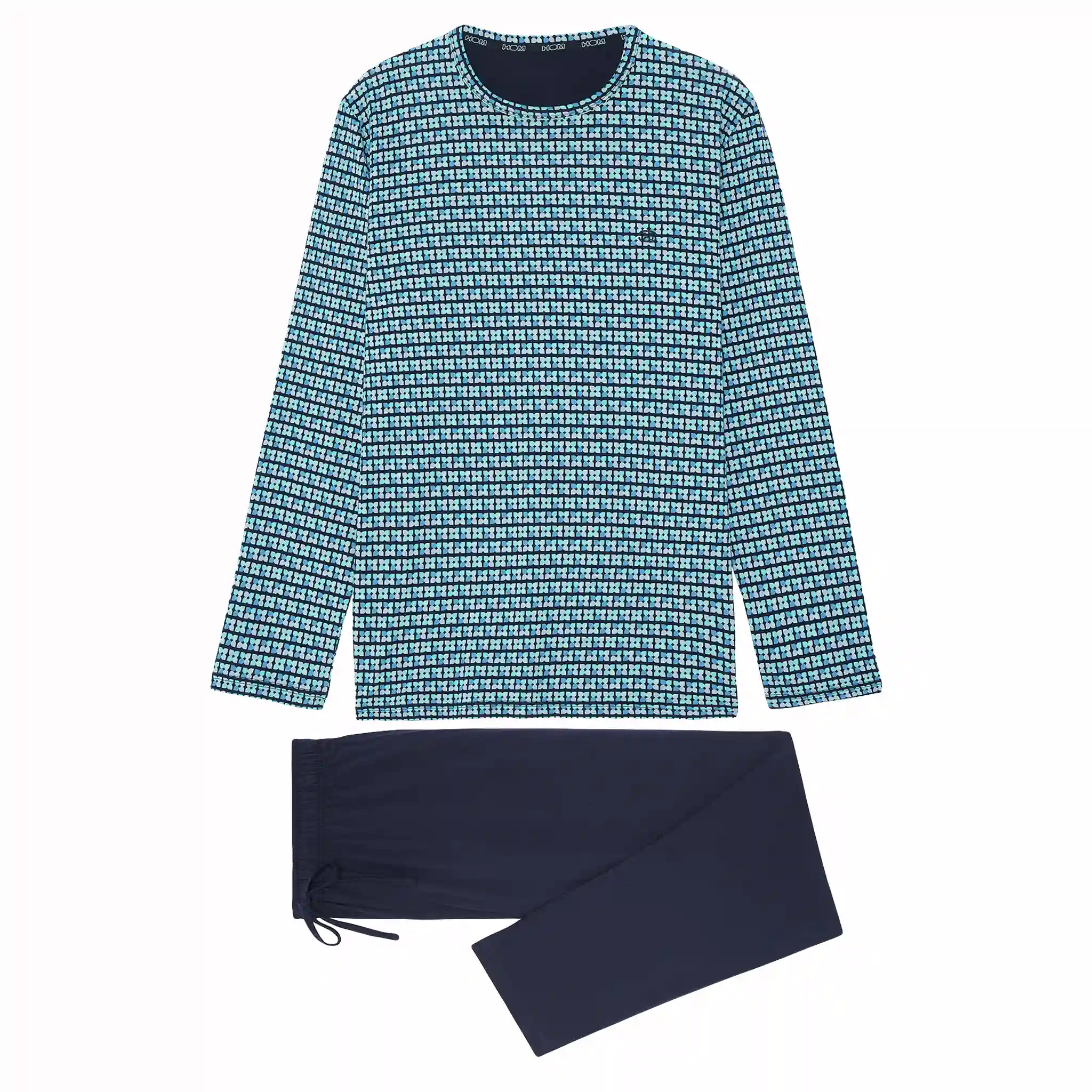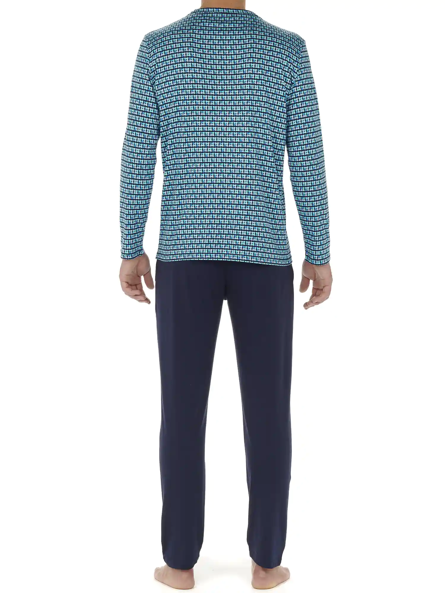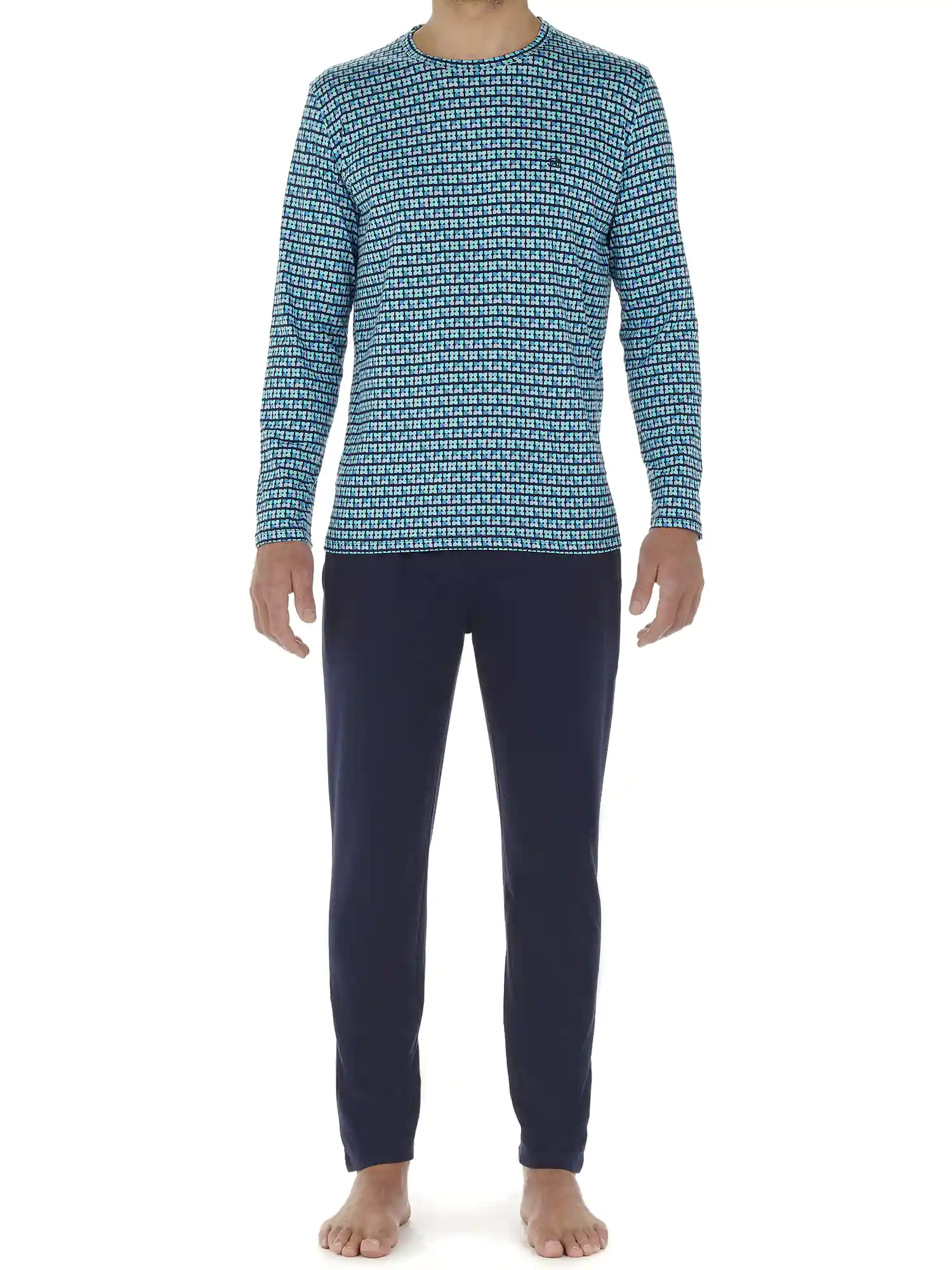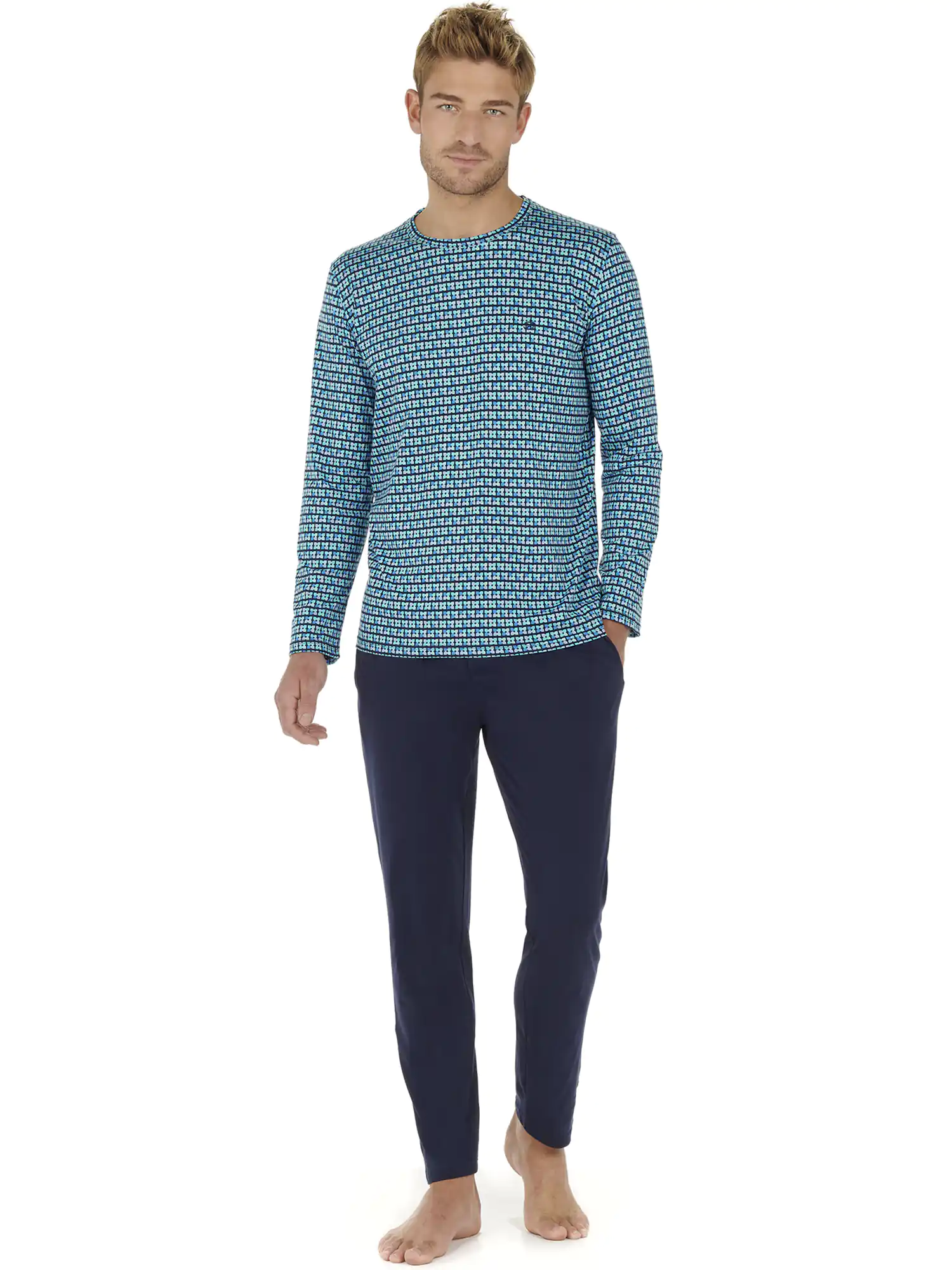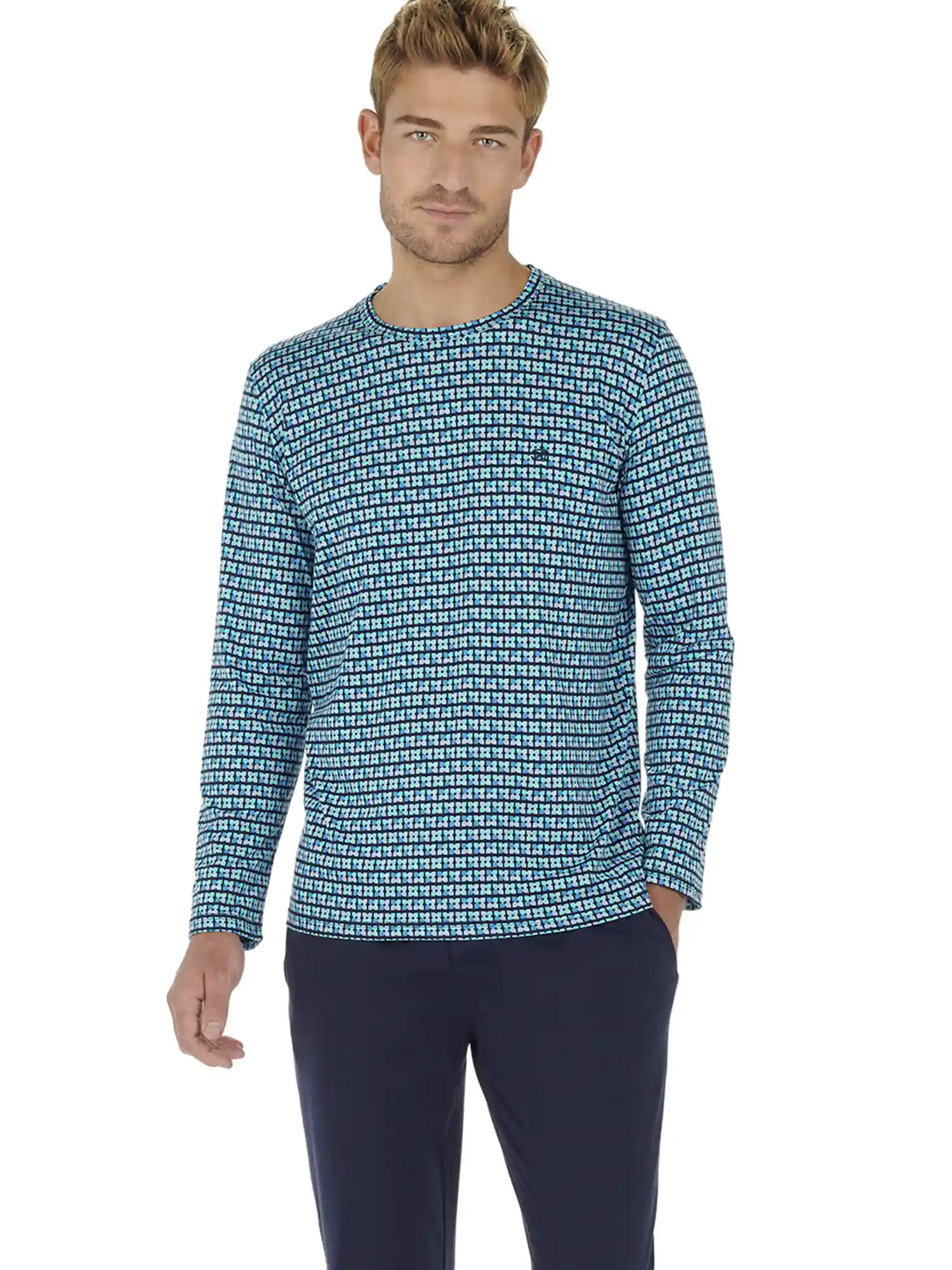 De Andy heren pyjama is gemaakt van 100% jersey katoen. Het T-shirt met lange mouwen, is uitgevoerd met een rondje hals en klassieke opening. Het shirt heeft een print met ovaaltjes uitgevoerd in lichte tinten groen op een marine blauwe achtergrond De lange broek in effen zwart heeft steekzakken in de zoom aan de linker en rechterzijde. De tailleband is elastisch en heeft een trekkoord. Doordat de pyjama is gemaakt van katoen is deze gemakkelijk schoon te maken en ademt deze goed. Perfect voor de man die graag natuurlijke stoffen draagt.
