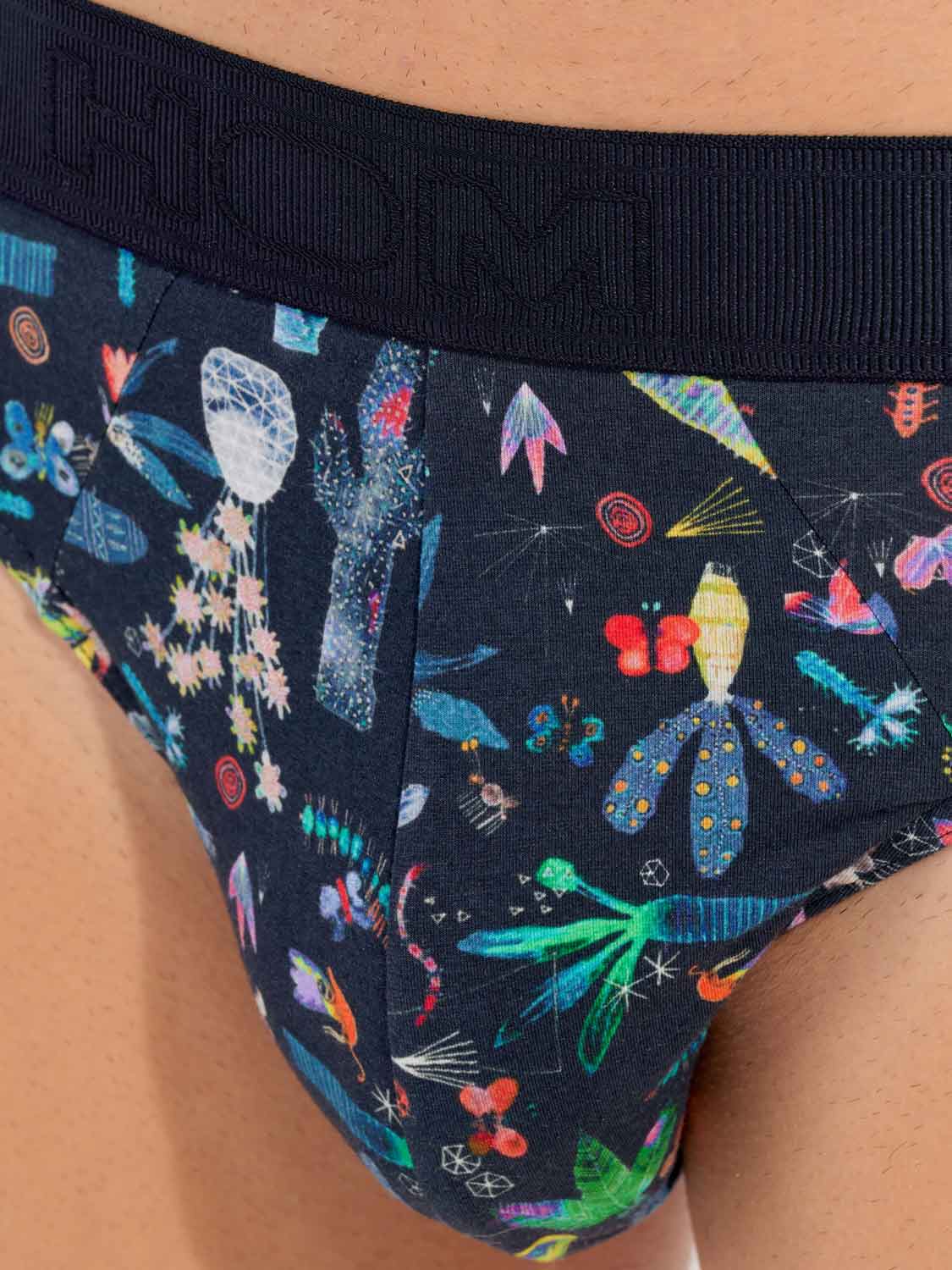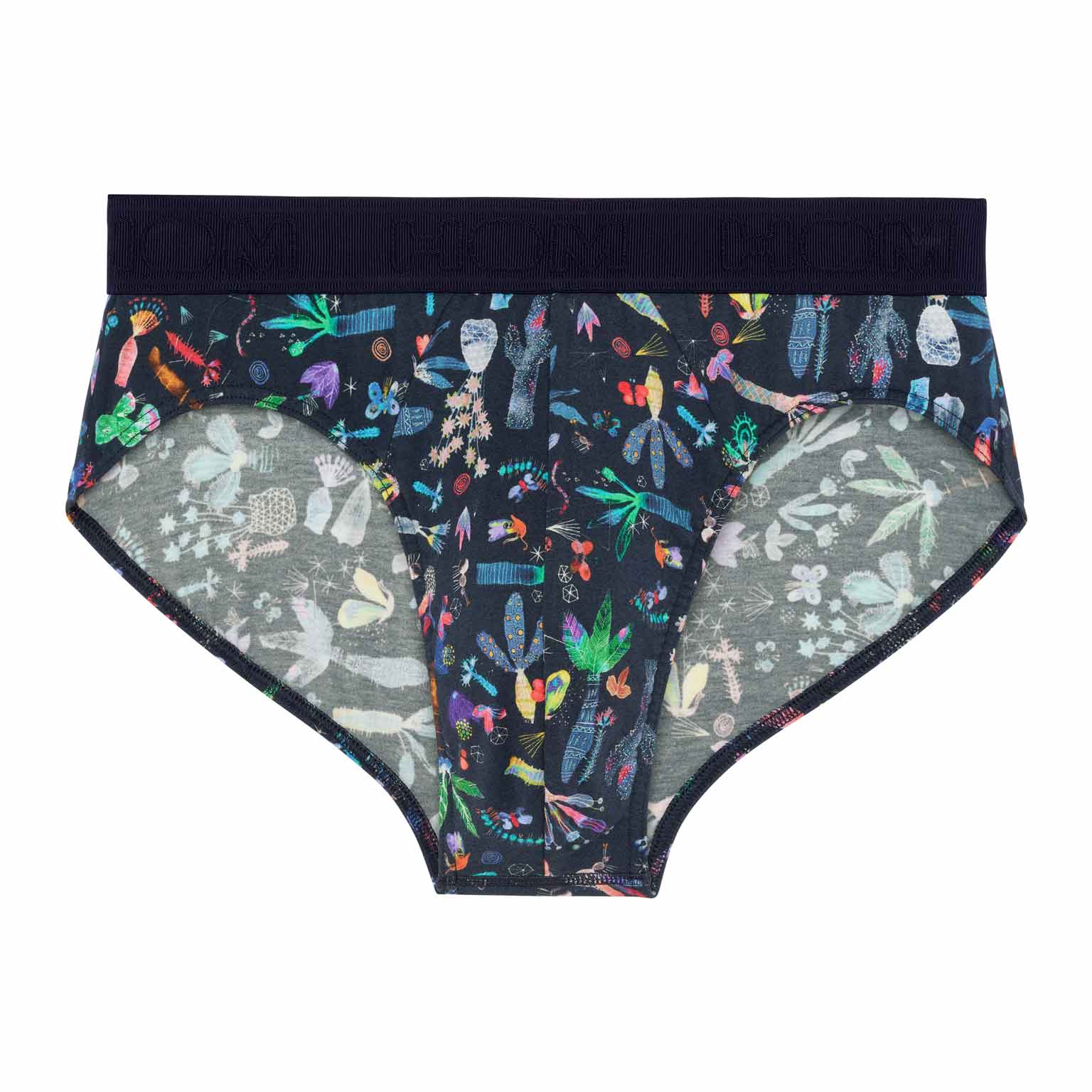 De Cactée - Mini Briefs is gemaakt van hoogwaardig katoenmodal, een natuurlijke stof, die heerlijk zacht aanvoelt. Deze heren slip heeft exotische kleurrijke plantenprint met palmbomen en cactussen op een marineblauwe achtergrond. De boxer heeft een elastische marine blauwe heupband, uitgevoerd in een rib. Met het HOM logo in ton sur ton op de band.