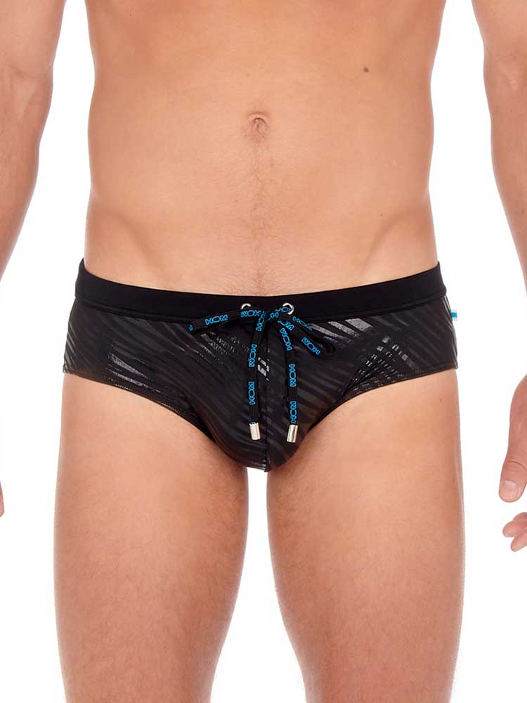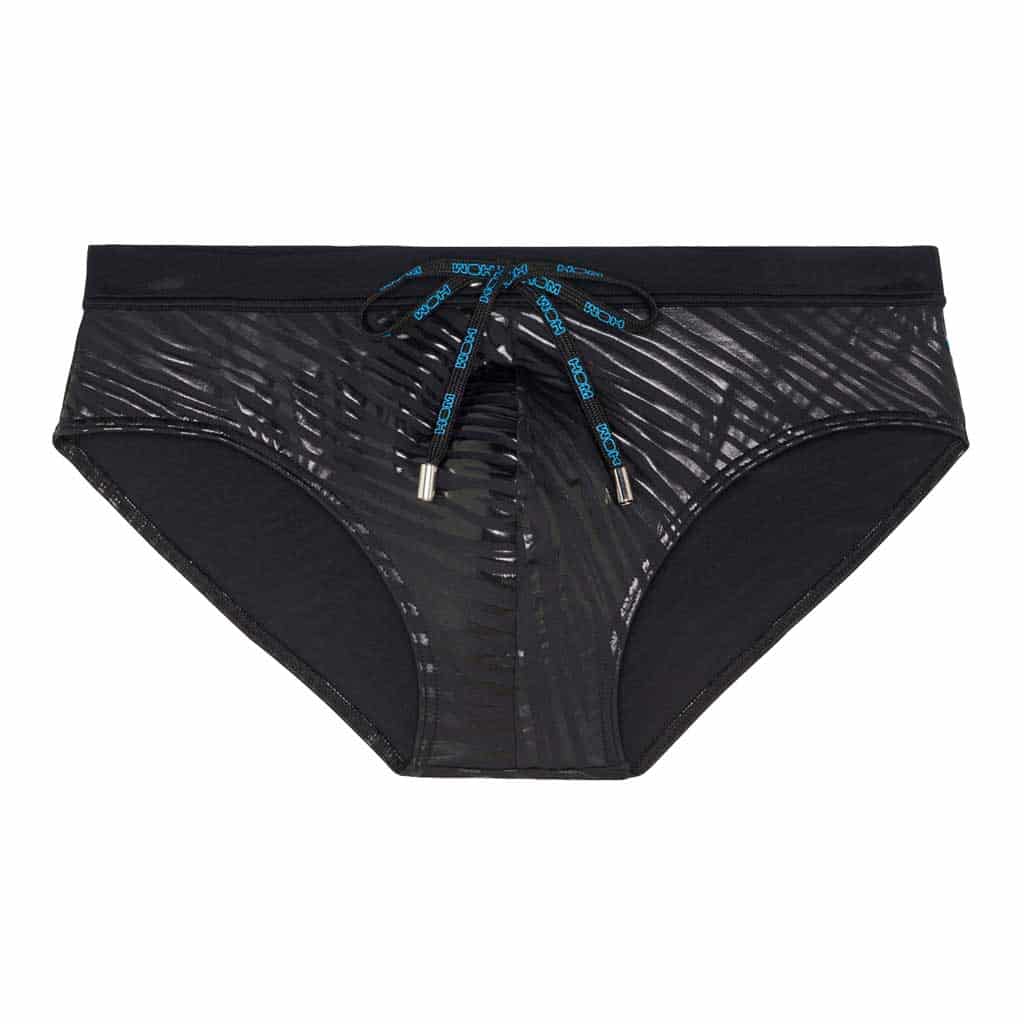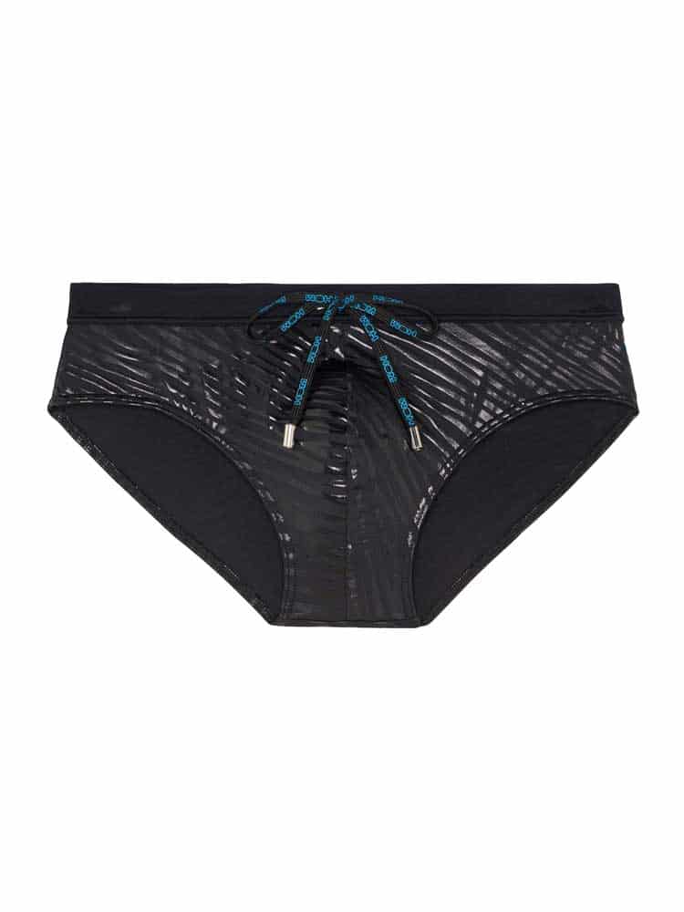 De Clubber - Swim Mini brief is stijlvol en modern. Uitgevoerd in het zwart met een uitdagend glanzend patroon (let op, dit is dus geen print). De zwemslip past wat design betreft dan ook prima in de HOM Temptation collectie.