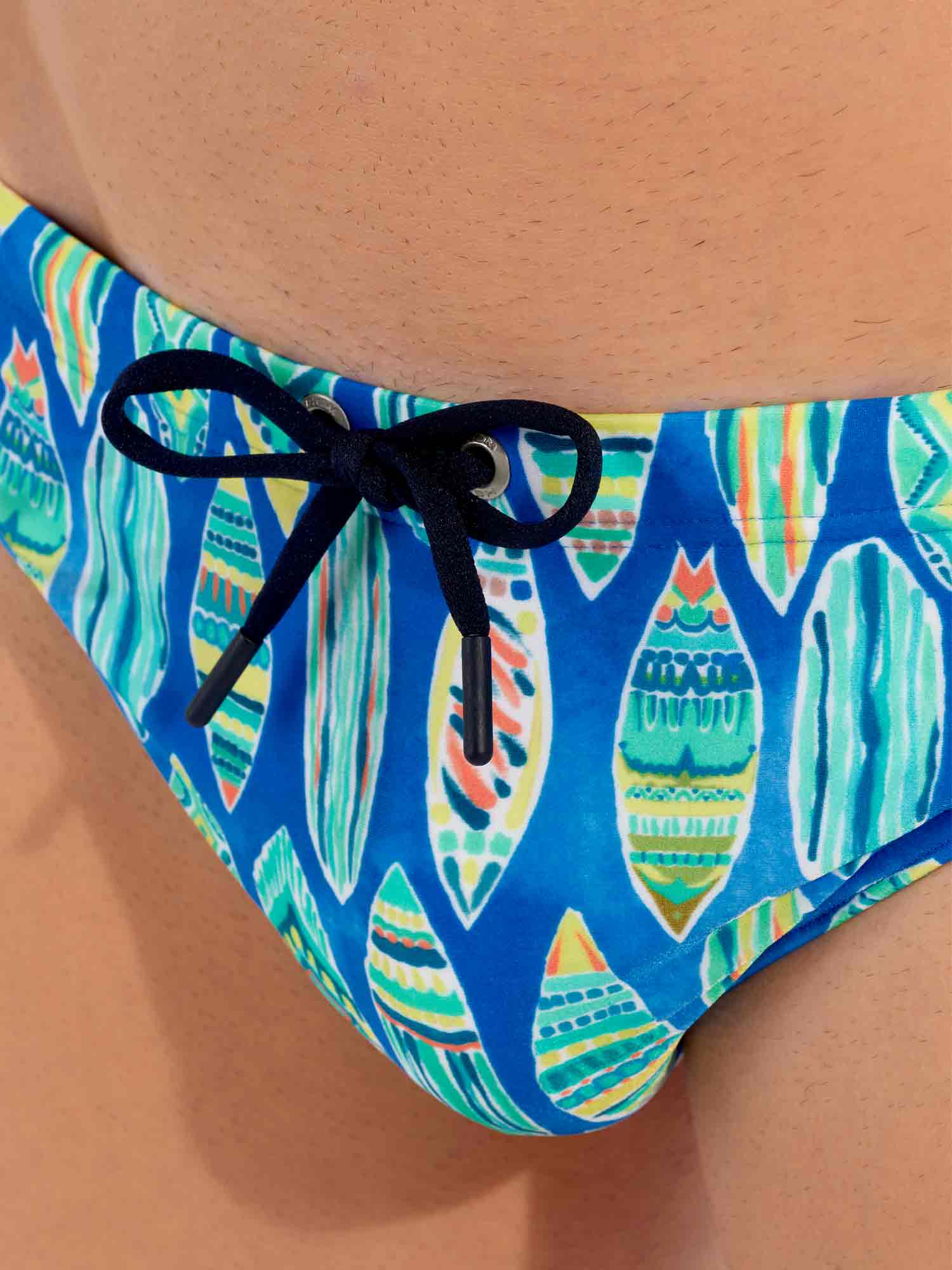 De Marbella - Swim Mini Briefs maken deel uit van de zomercollectie zwemkleding van HOM. Het ontwerp toont turquoise, groene en gele surfplanken op een blauw tie-dye achtergrond en roept exotische vakanties op. De stof is elastisch, sluit mooi aan op de huid en is niet doorschijnend. Omdat dit mini briefs zijn, zitten ze hoger op de heupen. Het trekkoord in de tailleband maakt het mogelijk om de zwembroek perfect af te stellen op jouw maat voor een stevige en comfortabele pasvorm.