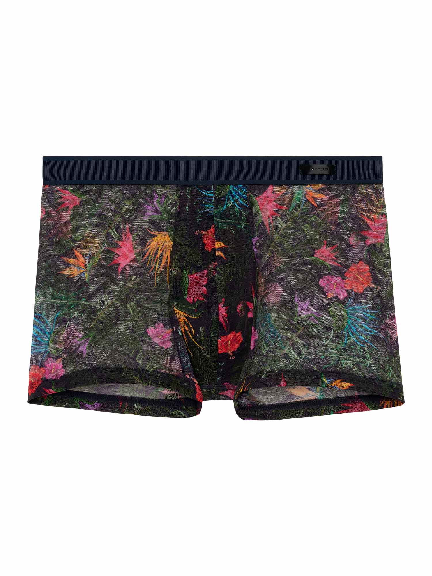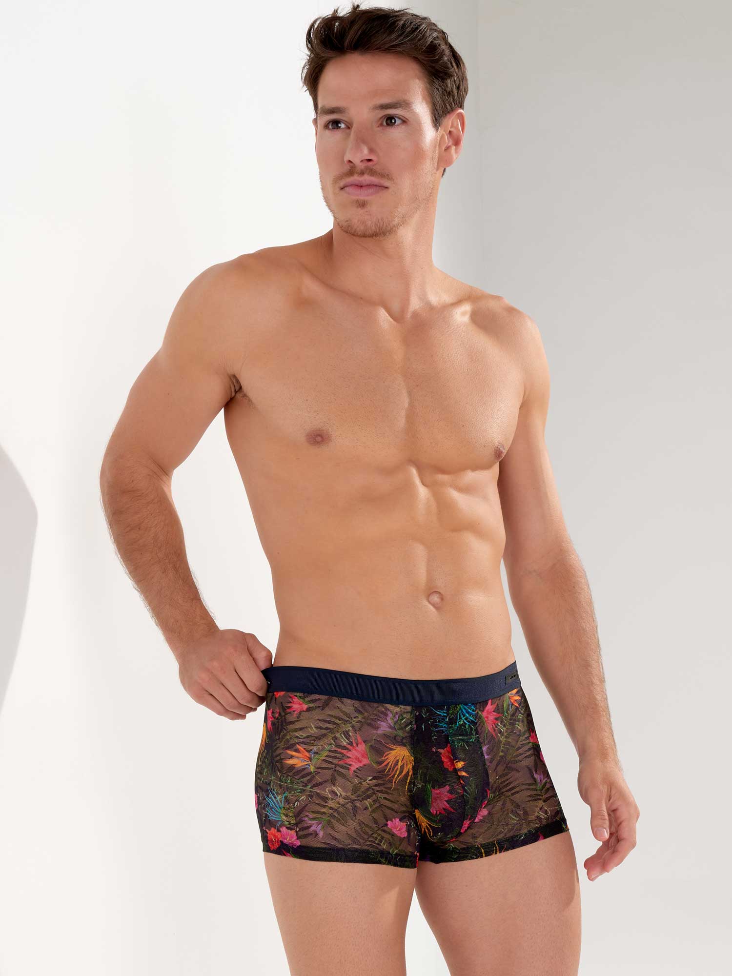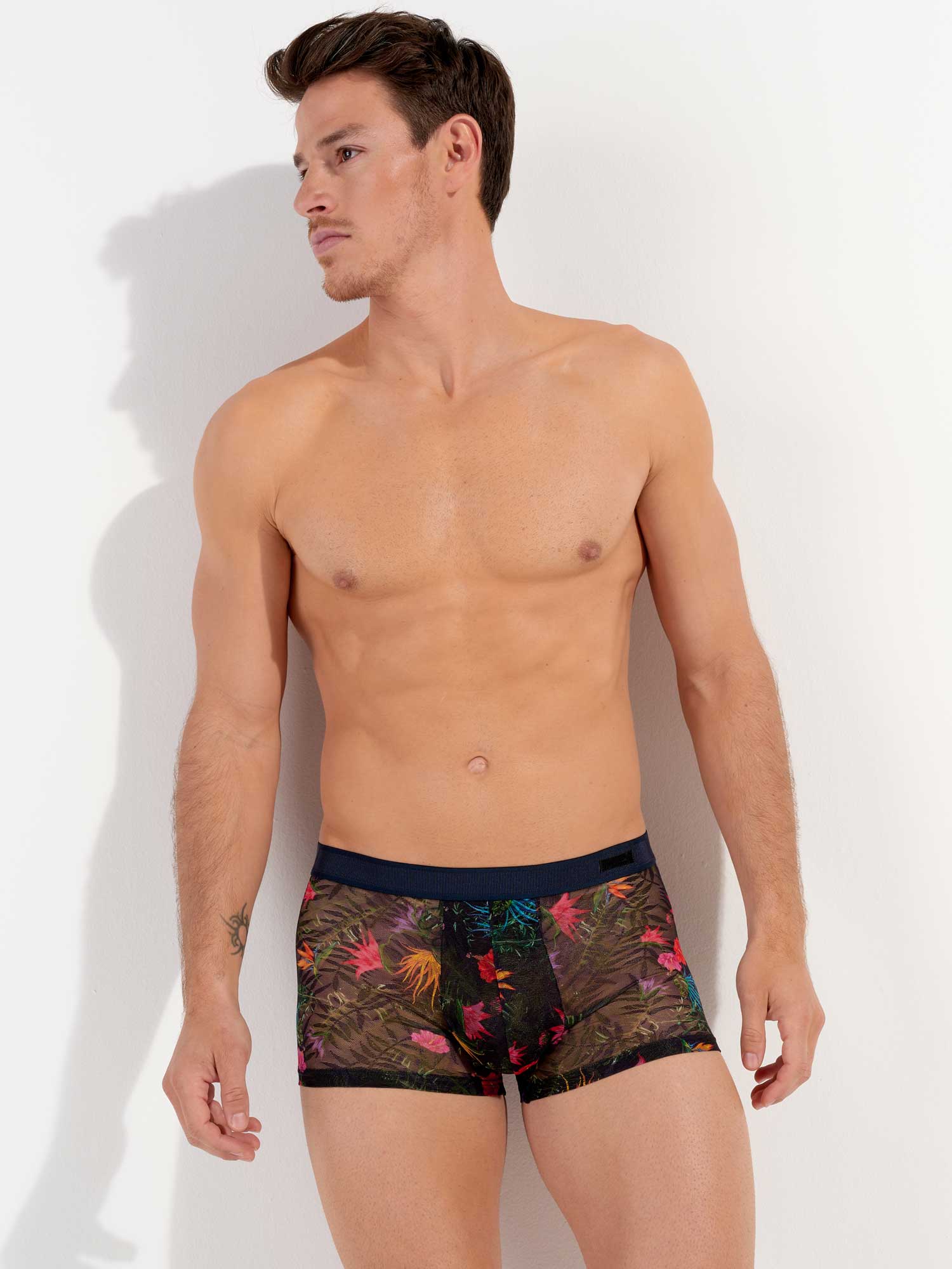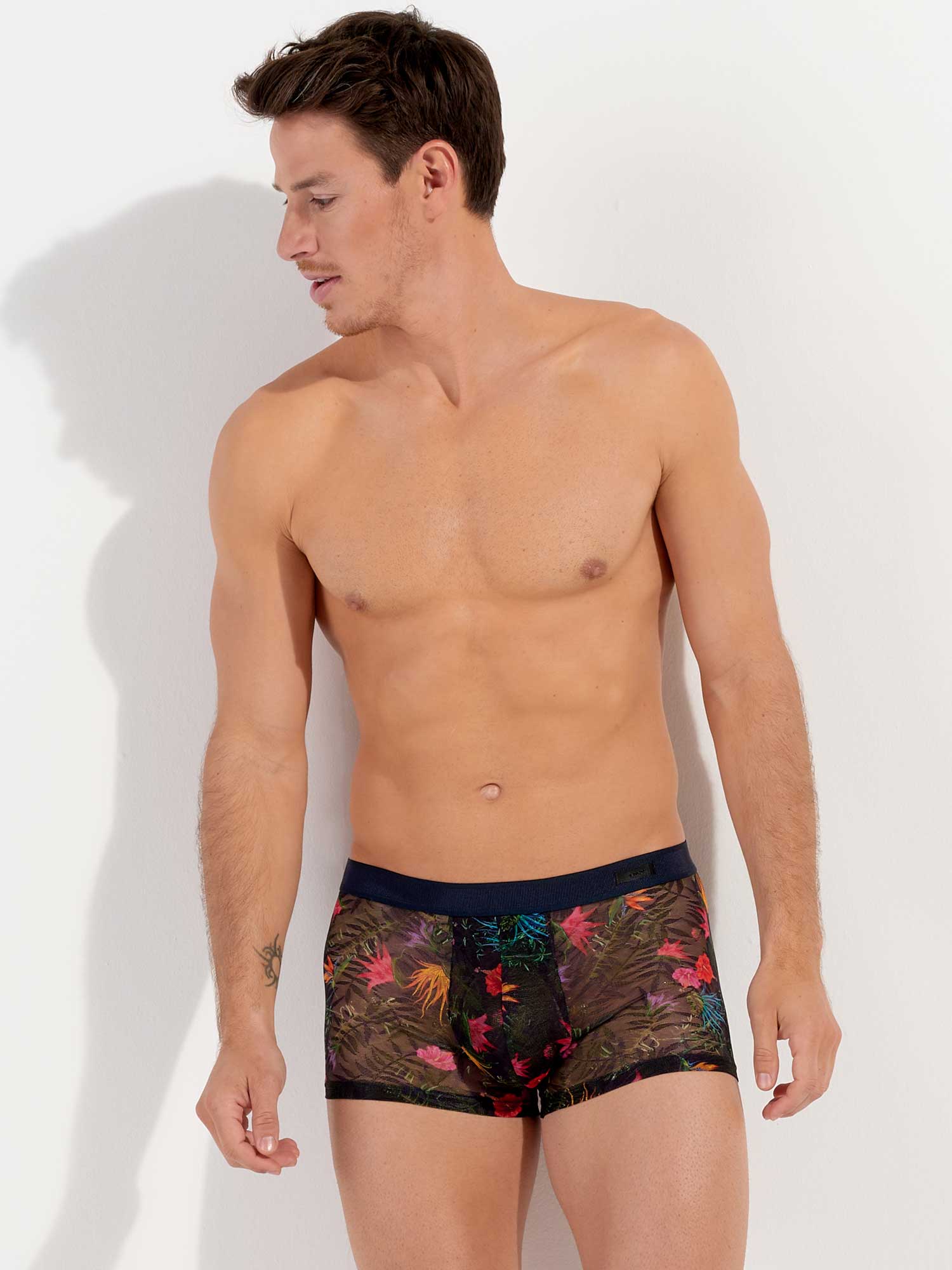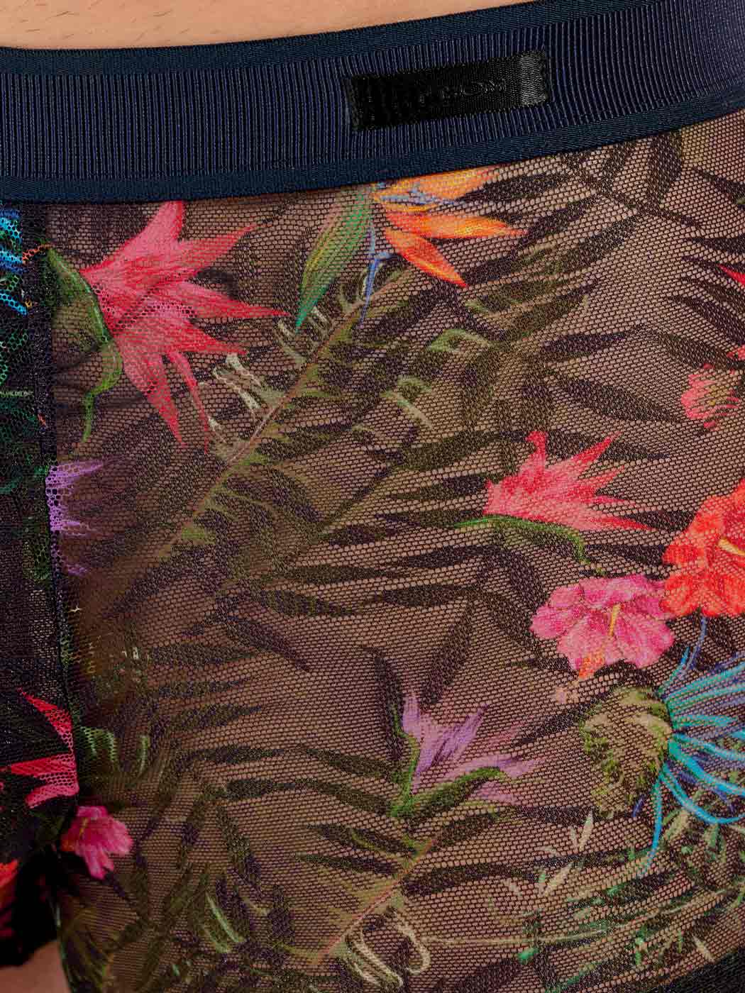 Exotica - Boxer Brief to odważny i tropikalny element linii HOM Temptation. Wykonany jest z eleganckiej siateczki z pięknym, kolorowym wzorem czerwonych, żółtych i różowych tropikalnych roślin na tle zielonych liści. Przezroczysty materiał działa erotycznie na skórze, tworząc zmysłowy efekt. Kieszonka z przodu jest podszyta, dzięki czemu nie jest prześwitująca.