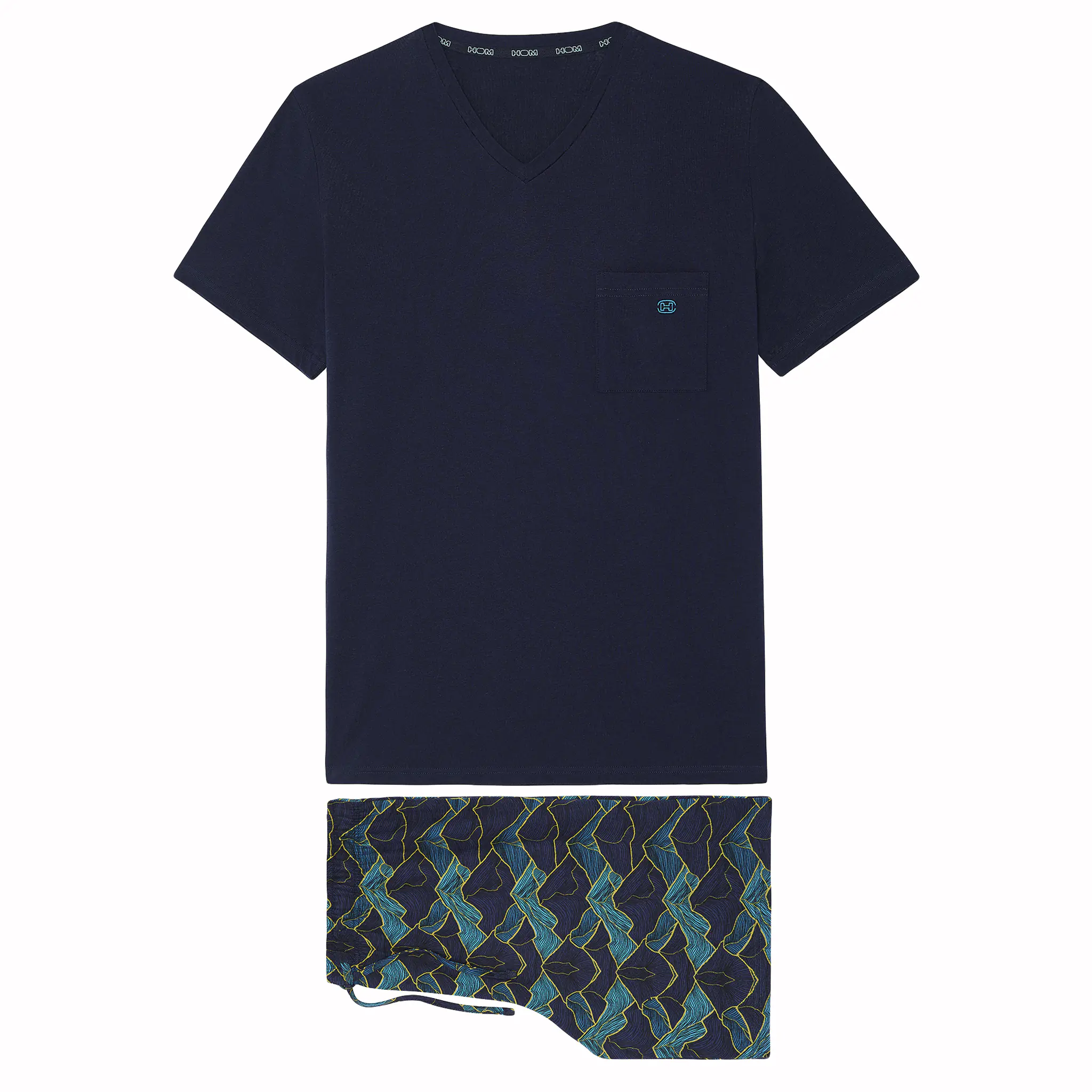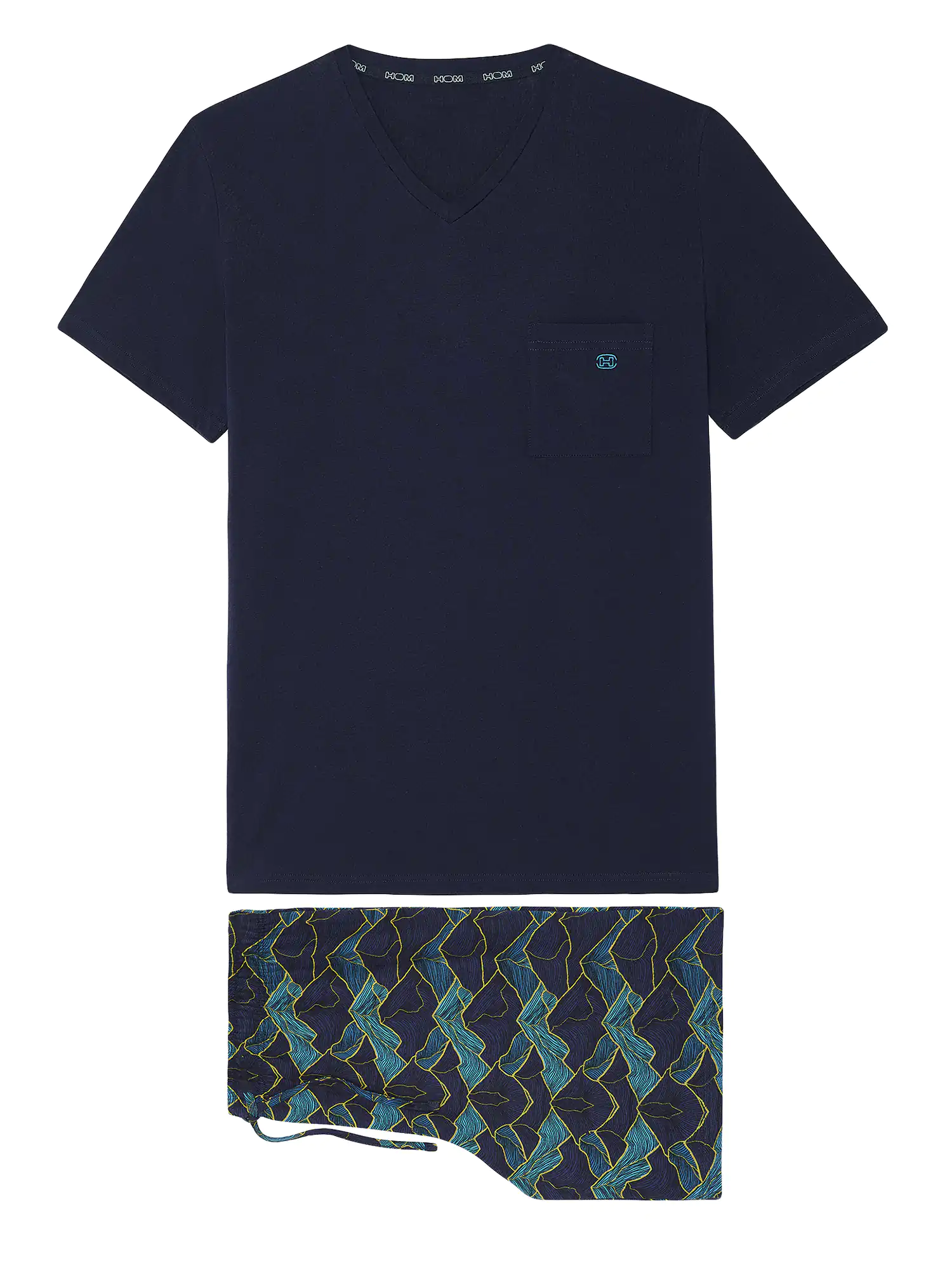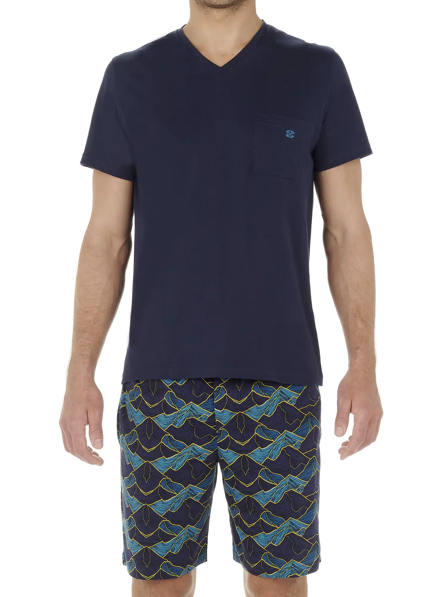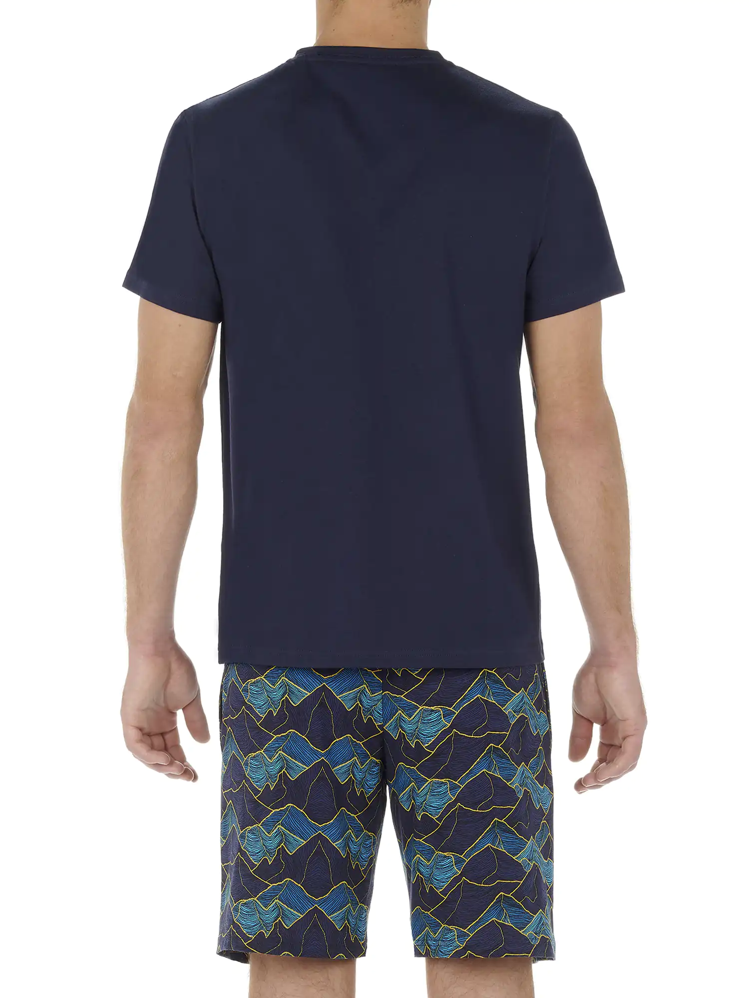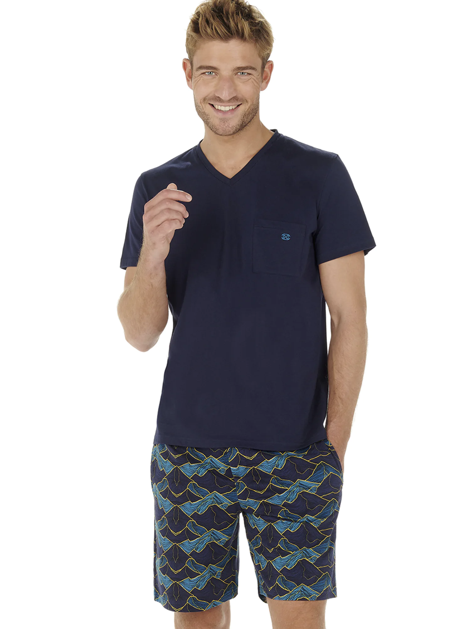 De Lino shortama is gemaakt van 100% jersey katoen. Het T-shirt met korte mouwen, is uitgevoerd met een V-hals. Het shirt is uitgevoerd in effen marine blauw. De korte broek heeft een landschap print met bergen in blauwe tinten op een marine blauwe achtergrond. De tailleband is elastisch en heeft een trekkoord. Doordat de pyjama is gemaakt van katoen is deze gemakkelijk schoon te maken en ademt deze goed. Perfect voor de man die graag natuurlijke stoffen draagt.