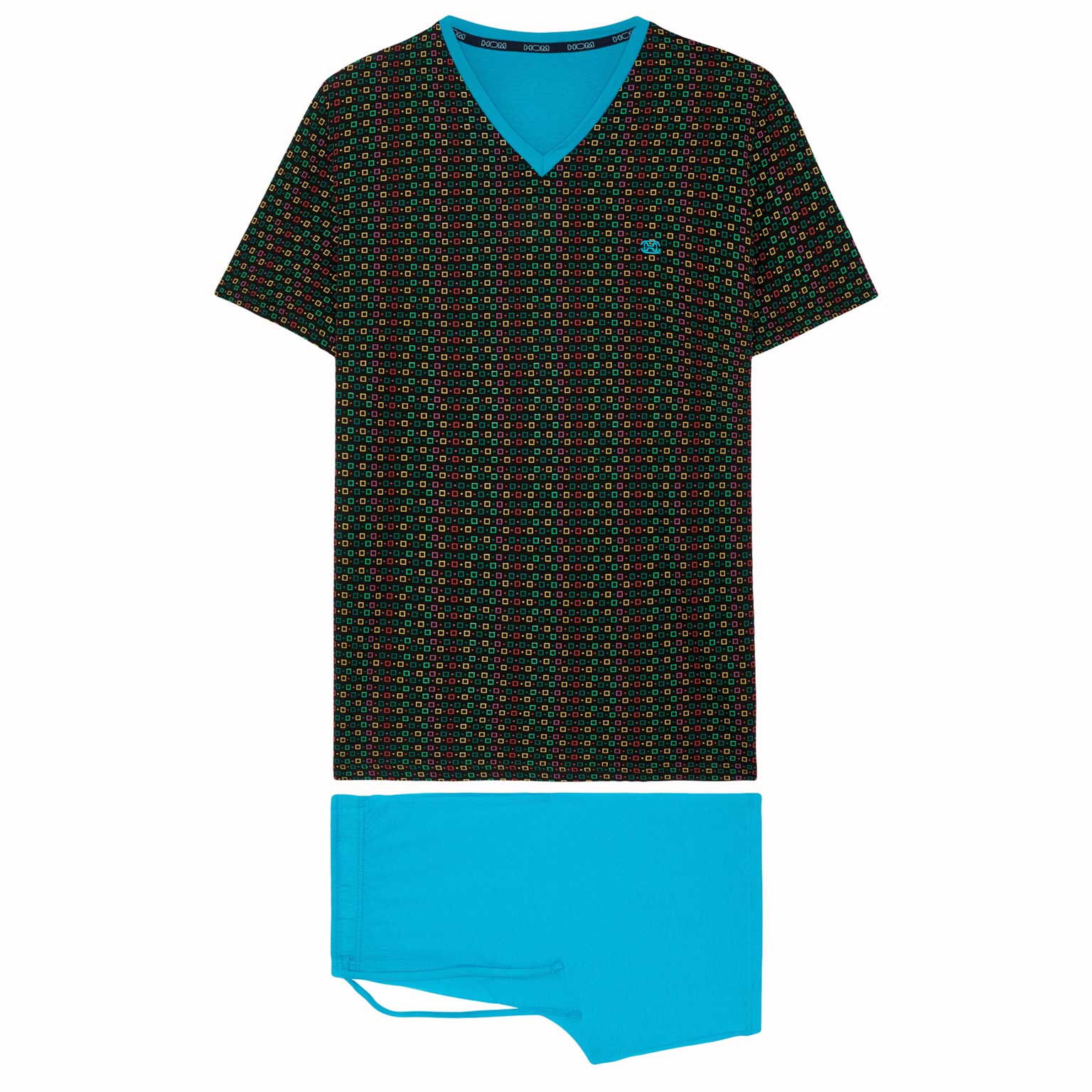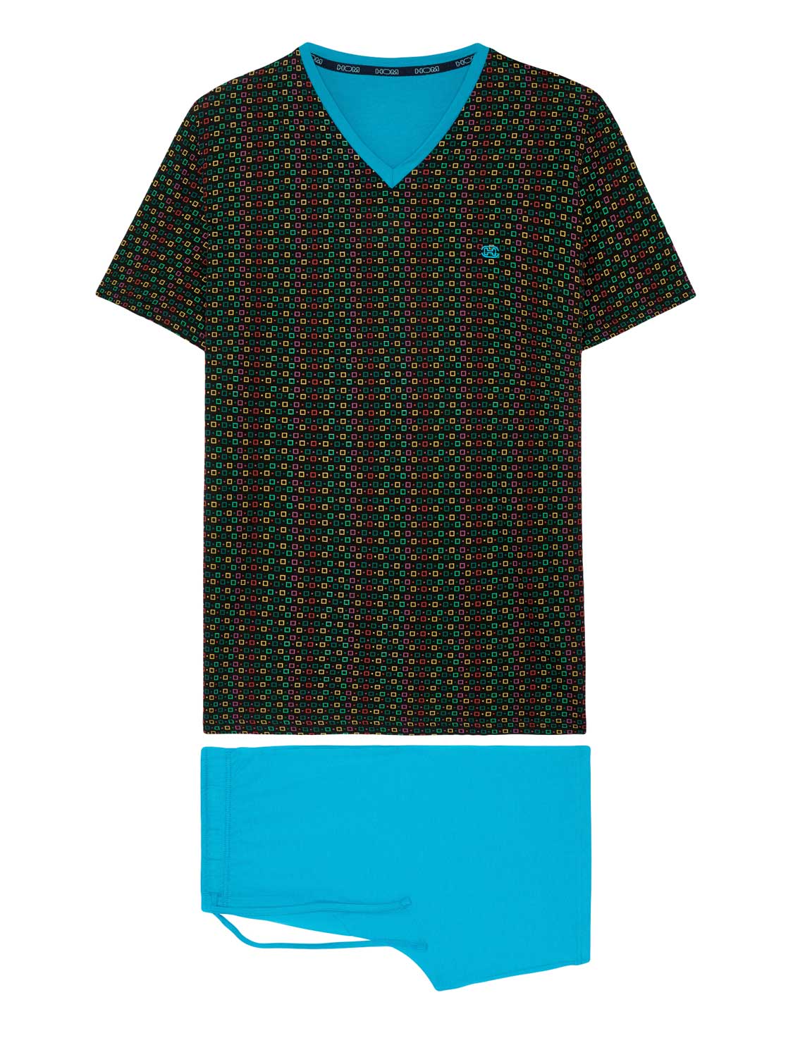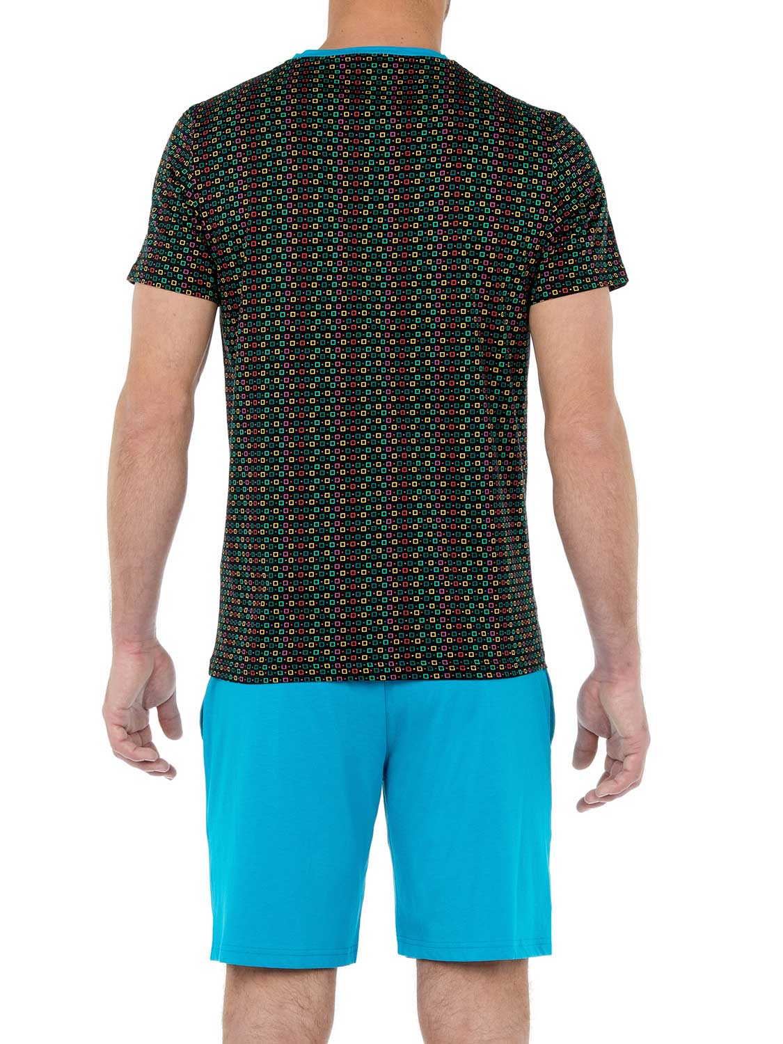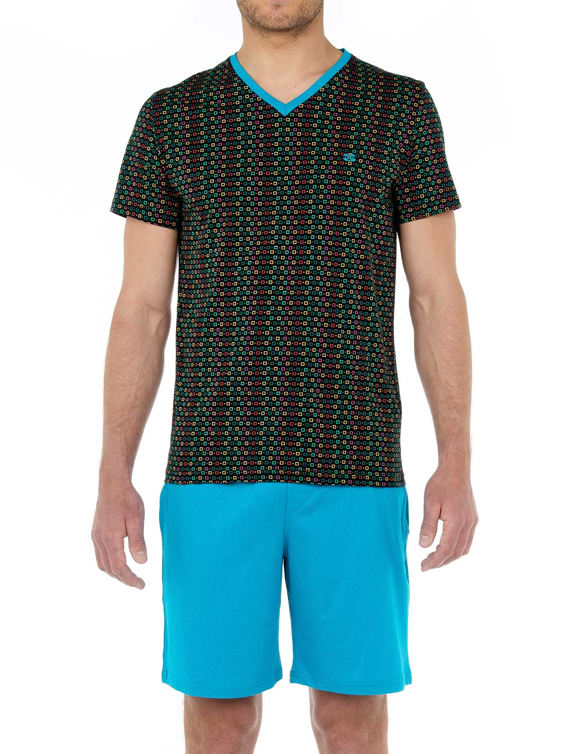 De Louka is een herenpyjama met korte mouwen van HOM, gemaakt van 100% jersey katoen. Dankzij dit natuurlijke materiaal is de stof absorberend, ademend en superzacht. De pyjama bestaat uit een T-shirt met korte mouwen bedrukt met een kleurrijk ruitpatroon en een effen gekleurde korte broek.