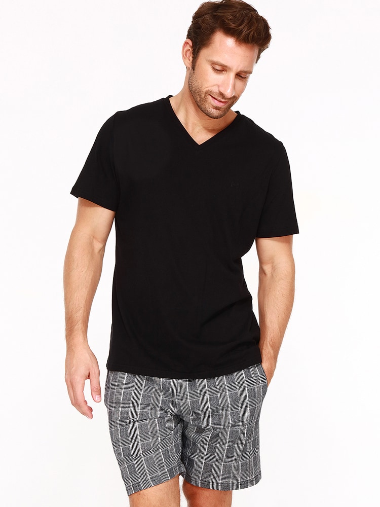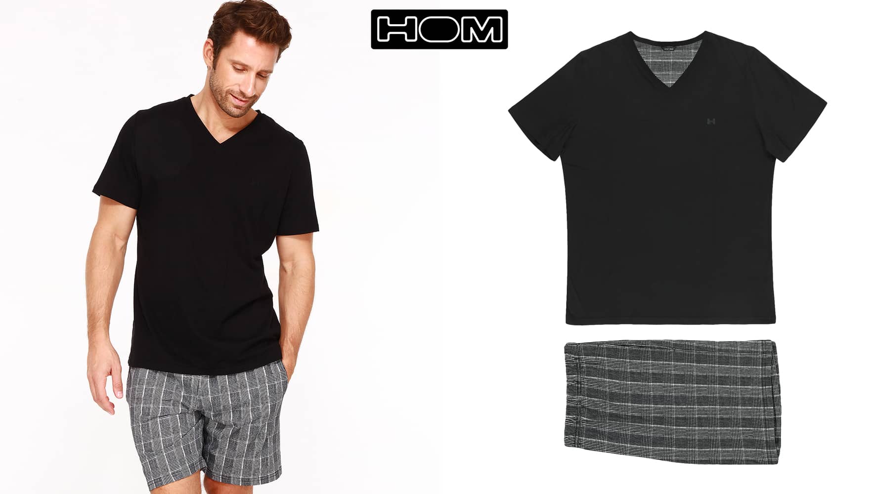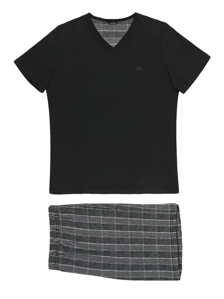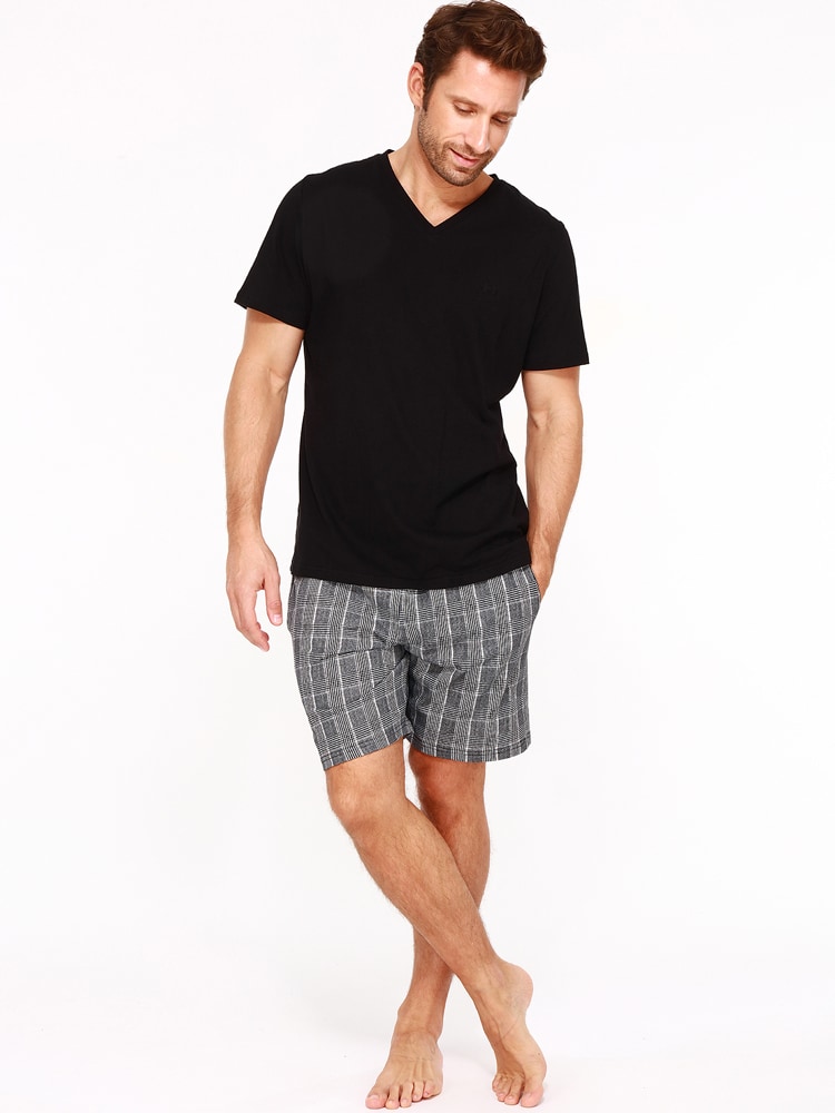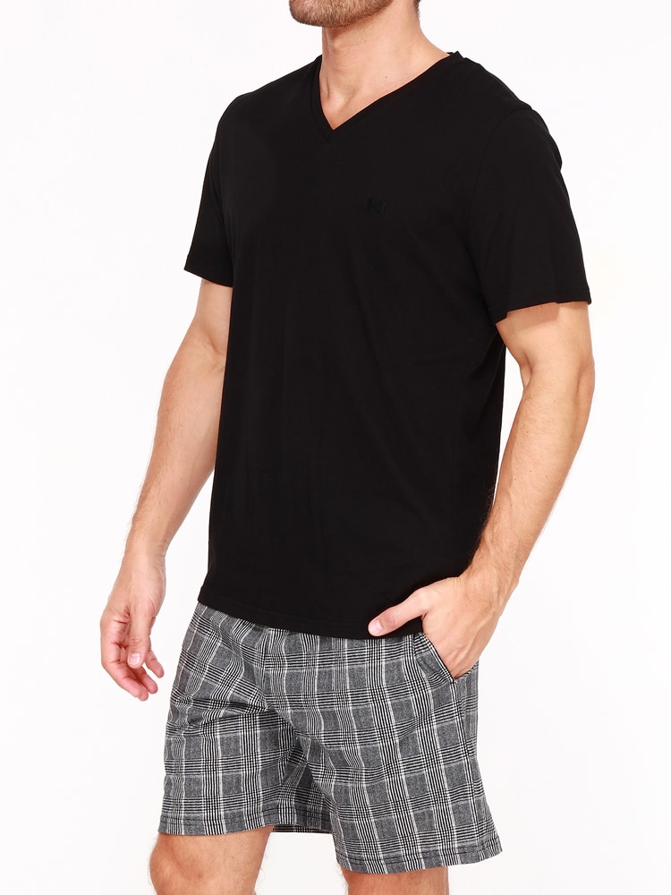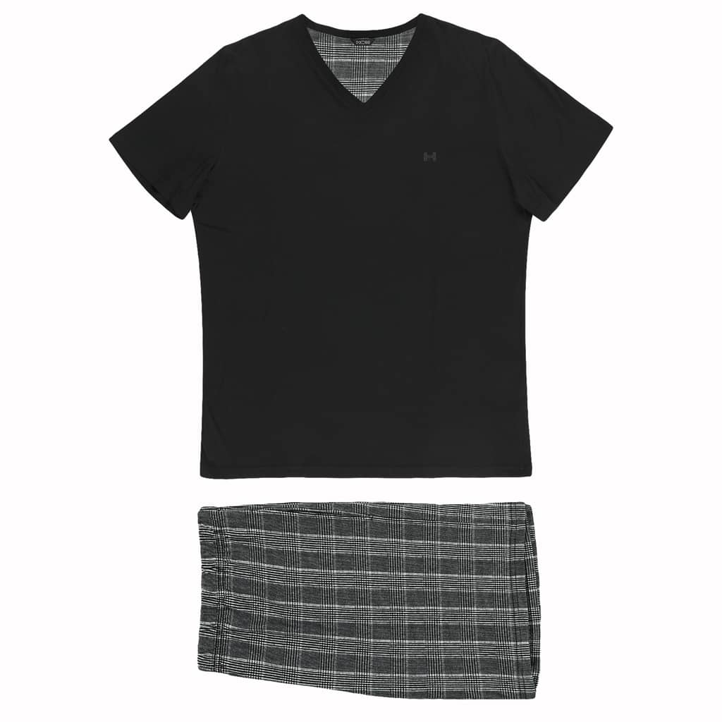 De Pampelonne is een korte heren pyjama gemaakt van 100% jersey katoen. Het zwarte shirt heeft korte mouwen met een v-hals. Het short is uitgevoerd in een zwart wit ruit patroon en heeft zakken in de zoom aan de linker en rechterzijde. De tailleband is elastisch. Doordat de pyjama is gemaakt van katoen is deze gemakkelijk schoon te maken en ademt deze goed. De ideale pyjama voor de man die graag natuurlijke stoffen draagt.