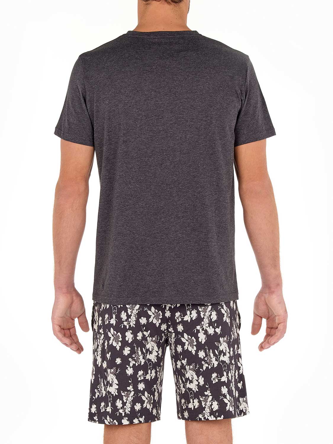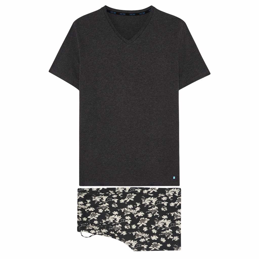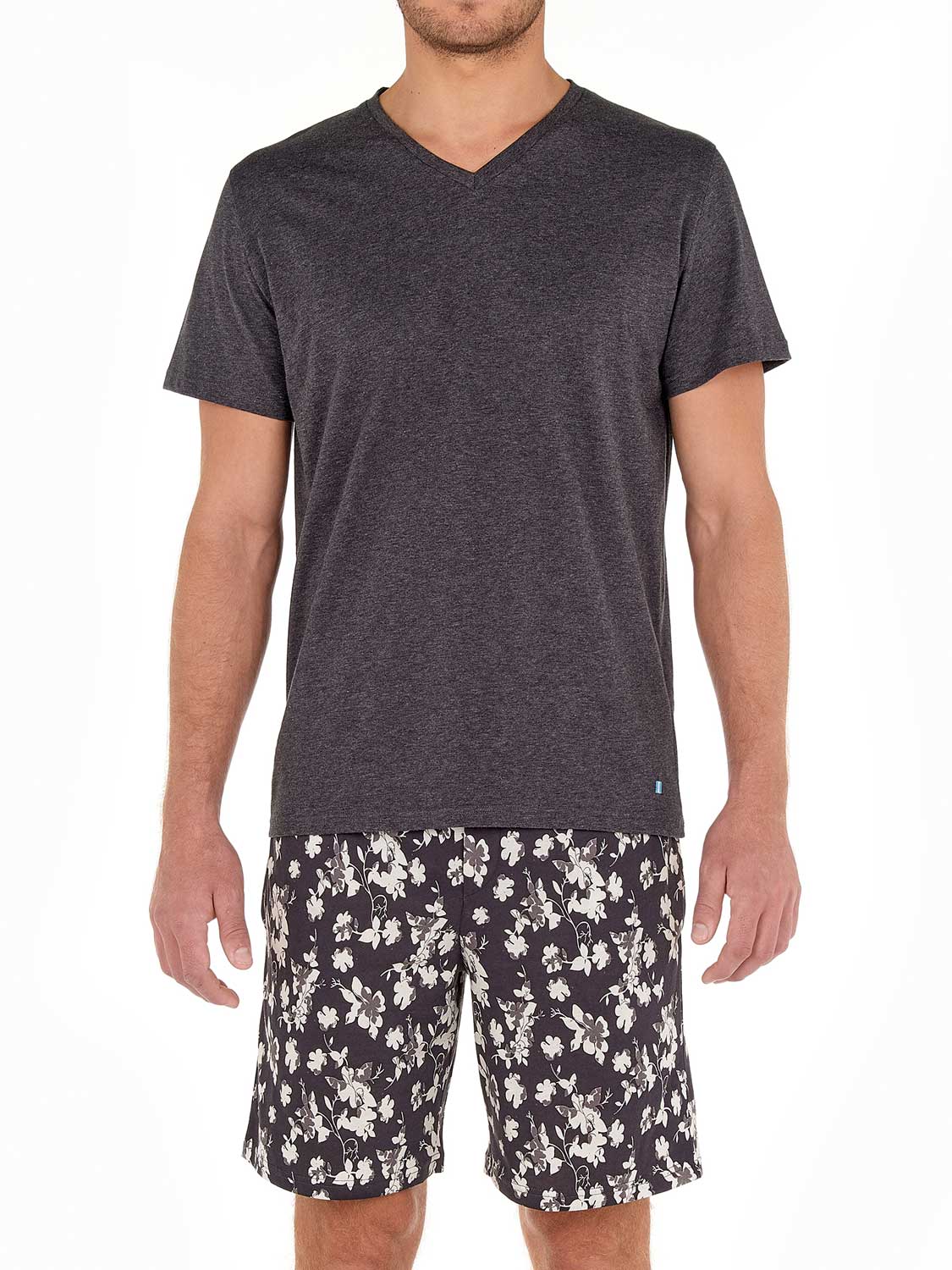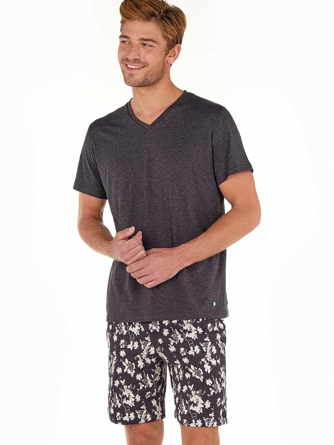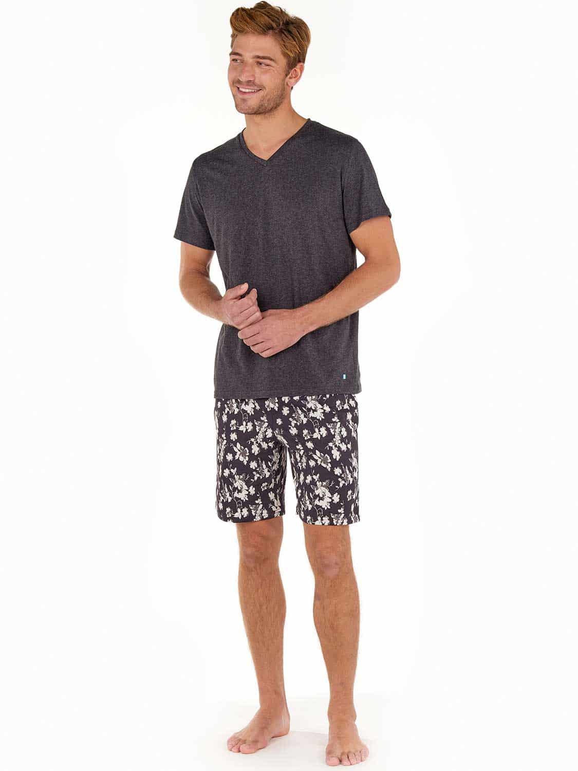 De Tambo - Shortama is een sierlijke pyjama uitgevoerd in antraciet/wit met een fleurige bloemenprint op het short. De korte pyjama is gemaakt van 100% jersey katoen. Het shirt heeft een v-hals en korte mouwen. De korte broek heeft steekzakken in de naad aan zowel de linker en rechterzijde en een elastische heupband met trekkoord voor een solide fit. Doordat de pyjama van katoen is gemaakt is deze makkelijk schoon te maken en perfect voor iedere man die graag natuurlijke stoffen draagt.