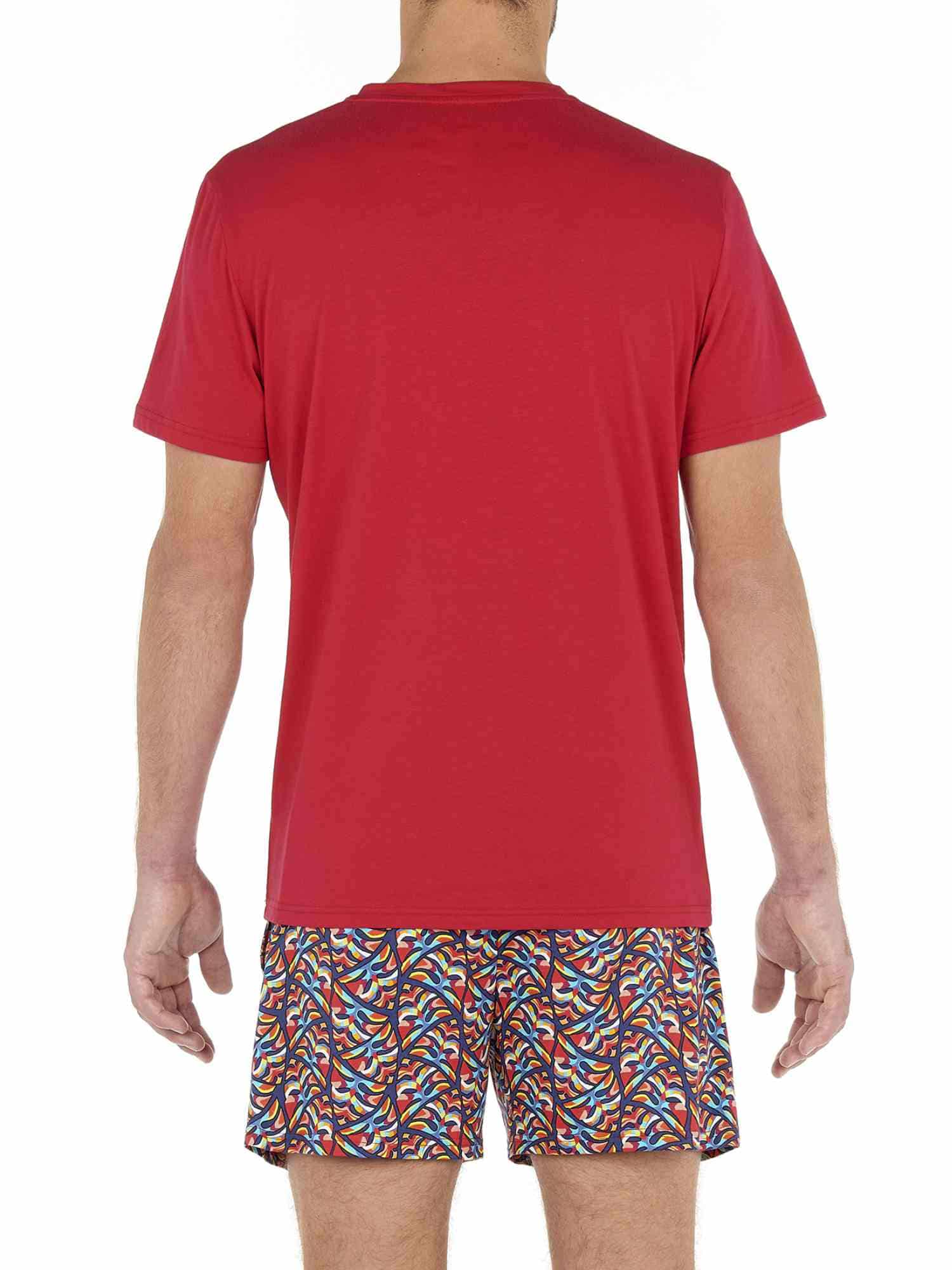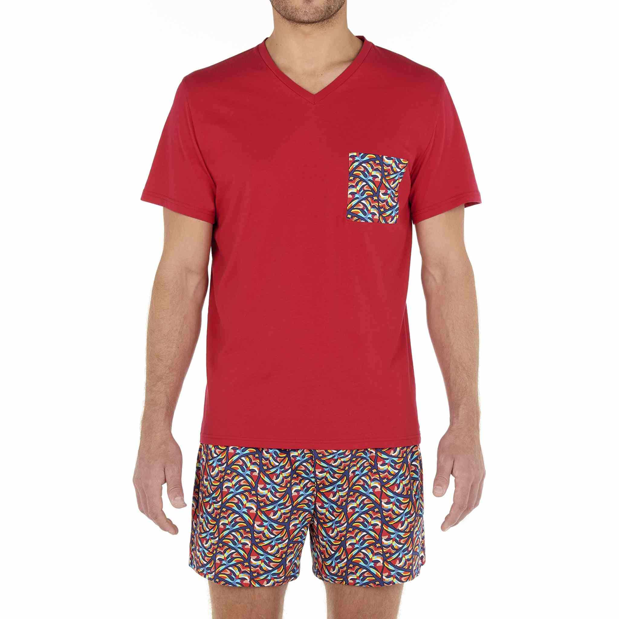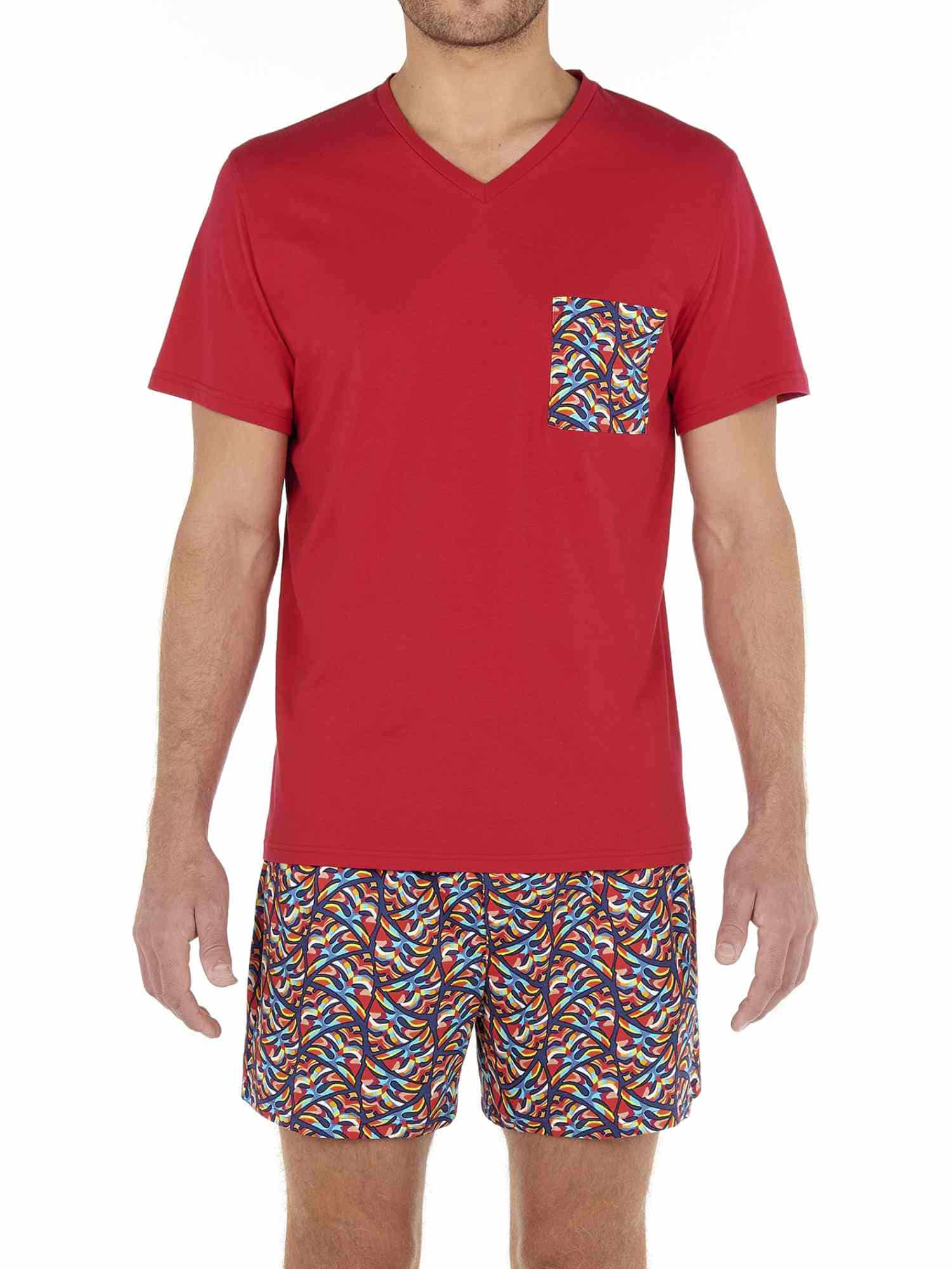 De Turbie Shortama is een opvallende pyjama gemaakt van 100% jersey katoen. Het shirt heeft een V-hals en is uitgevoerd in rood met een borstzakje, bijpassend in de print van het short. De korte broek van de pyjama heeft steekzakken in de naad aan zowel de linker en rechterzijde. De broek heeft een elastische heupband met een trekkoord voor een solide fit. Doordat de pyjama van katoen is gemaakt is deze makkelijk schoon te maken en perfect voor iedere man die graag natuurlijke stoffen draagt.