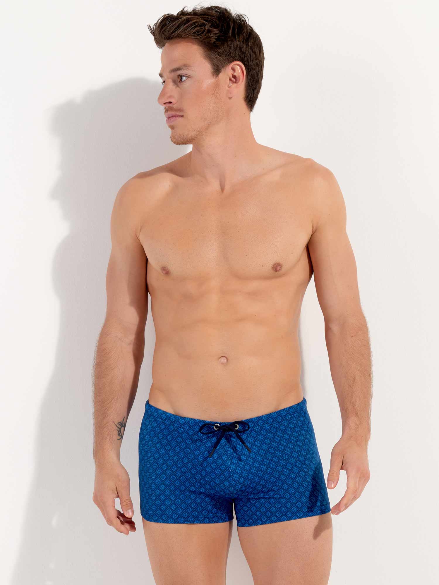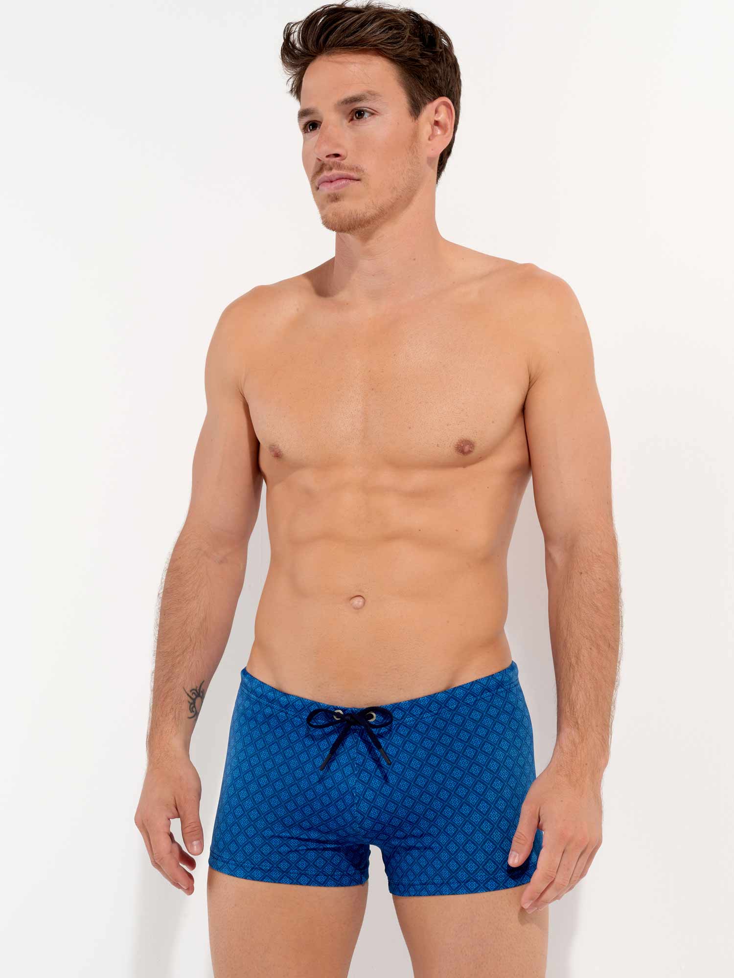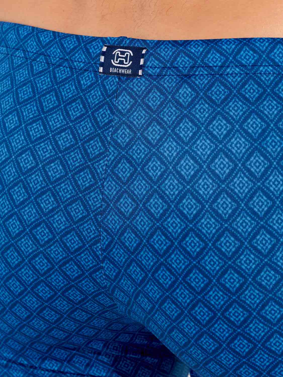 Hendaya - Swim Shorts är en del av HOM:s sommarkollektion. Med ett elegant slipsmönster i ljusblå diamanter på marinblå bakgrund. Tyget är elastiskt, sitter skönt mot huden och är inte genomskinligt. Dragskon i midjan gör att du kan justera dem perfekt efter din storlek. Med detta plagg sprider du glädje på stranden eller vid poolen.