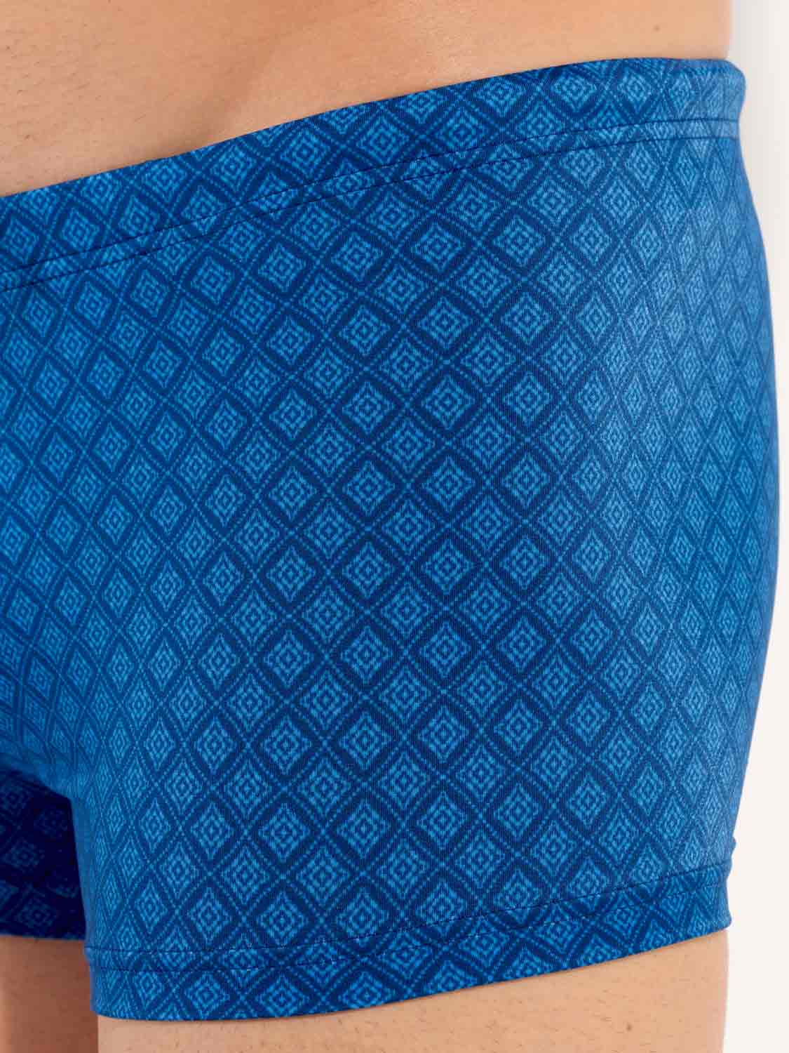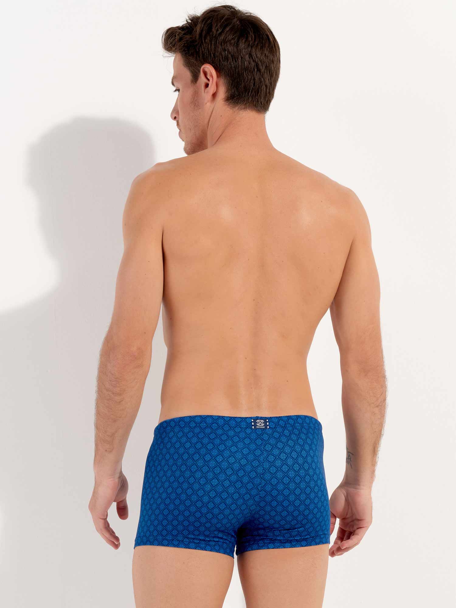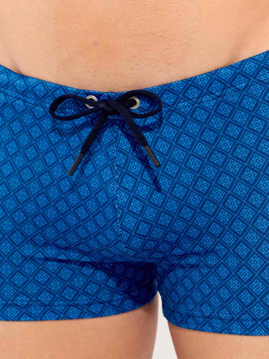 Hendaya - Swim Shorts är en del av HOM:s sommarkollektion. Med ett elegant slipsmönster i ljusblå diamanter på marinblå bakgrund. Tyget är elastiskt, sitter skönt mot huden och är inte genomskinligt. Dragskon i midjan gör att du kan justera dem perfekt efter din storlek. Med detta plagg sprider du glädje på stranden eller vid poolen.