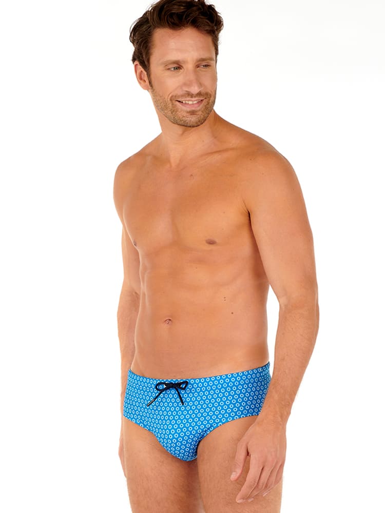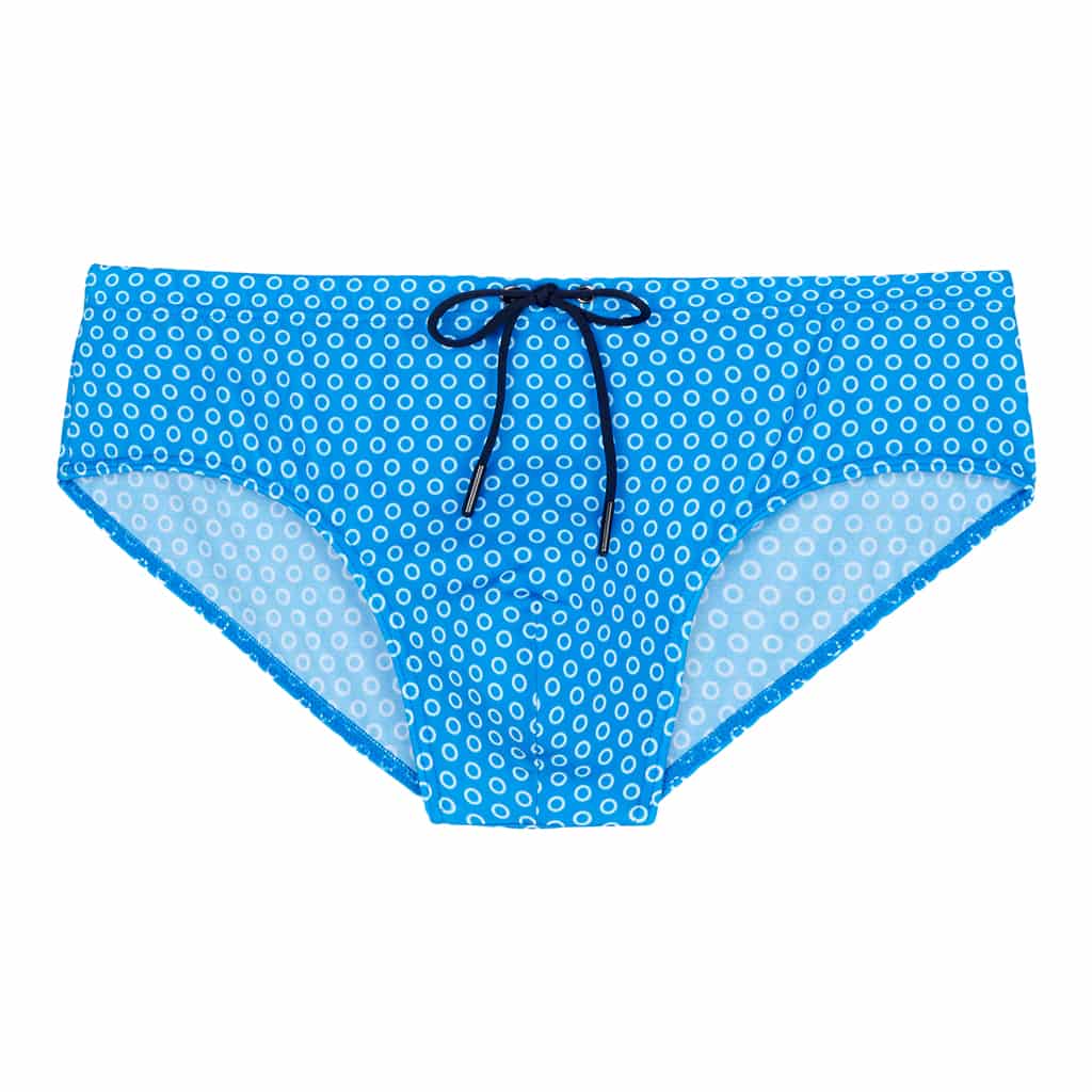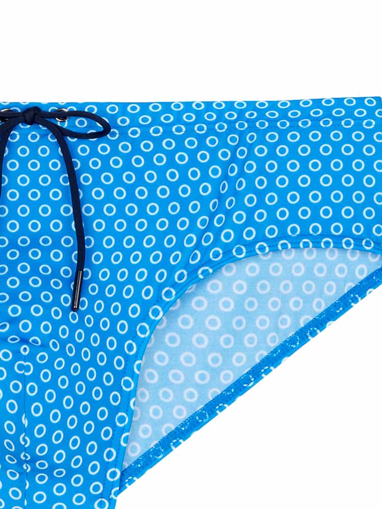 De Lourmarin Swim Mini Brief is uitgevoerd in de kleur blauwe met een cirkel patroon. De zwembroek heeft een comfortabele pasvorm en een trekkoord in de heupband om deze perfect op maat te brengen voor een verstevigde fit.