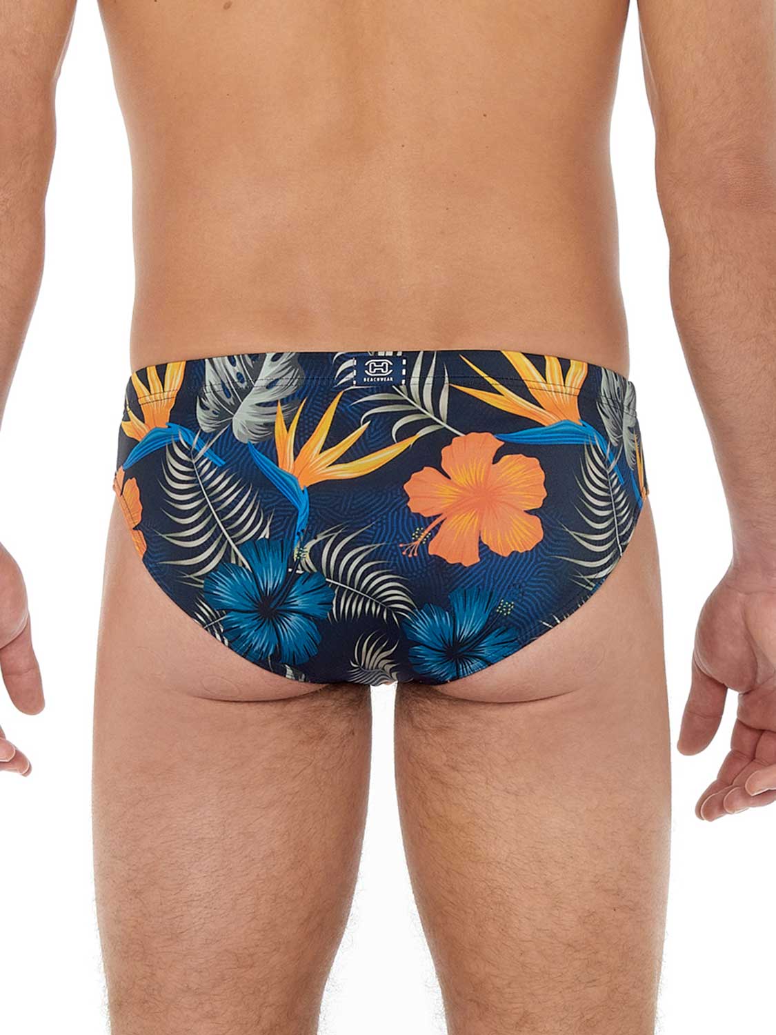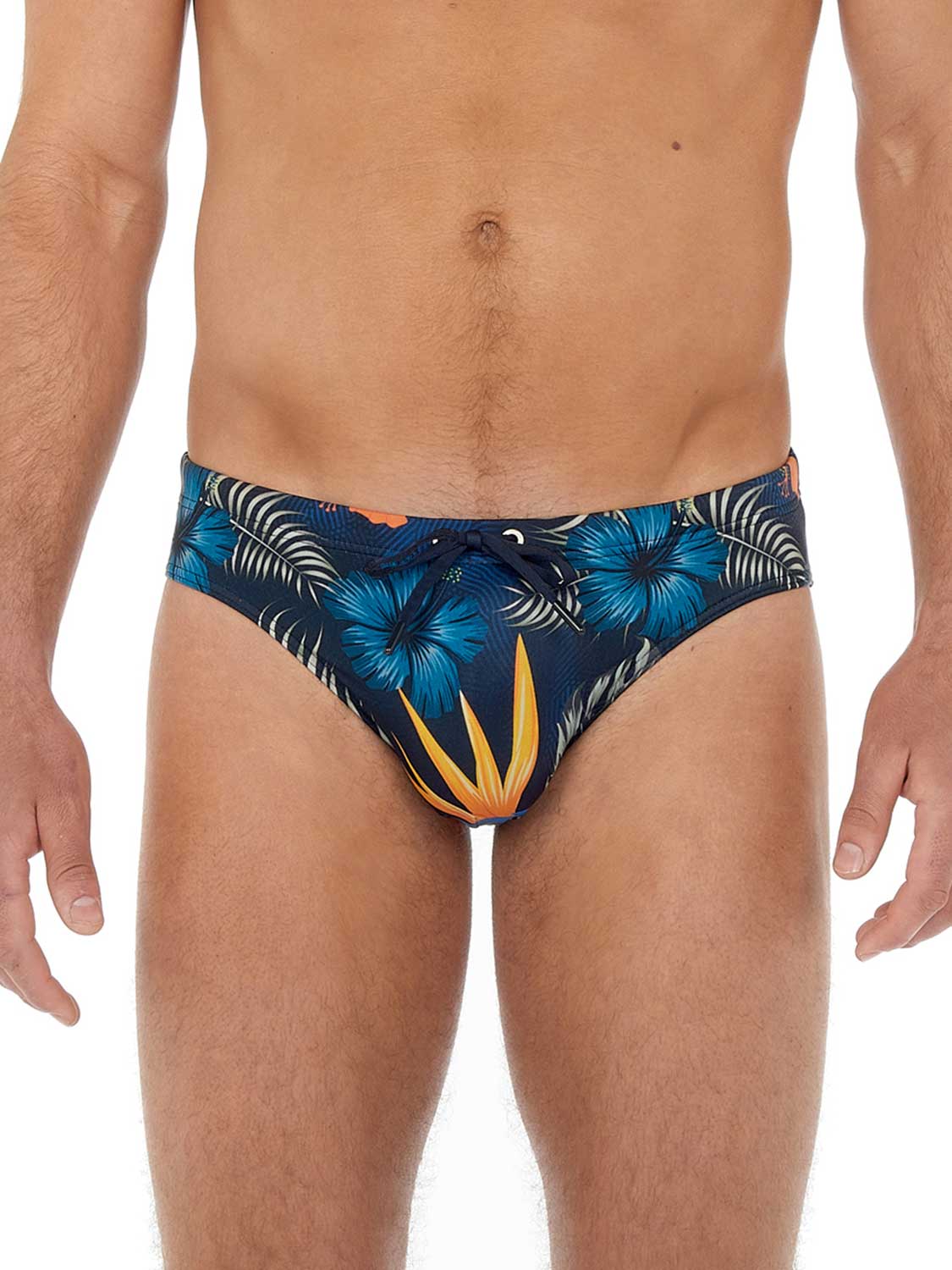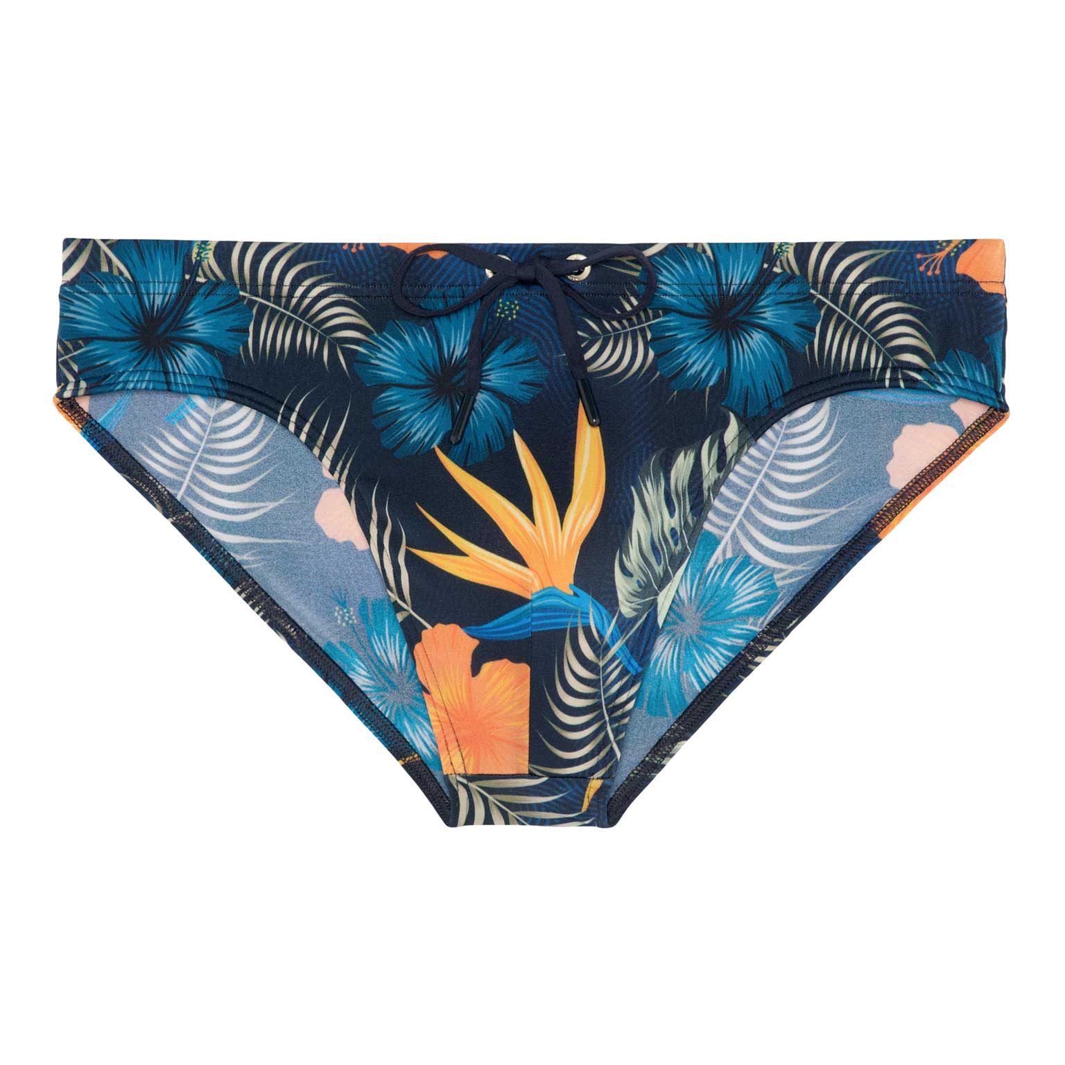 De Tiki - Swim Mini Brief heeft een tropische print op een donkerblauwe achtergrond. De Mini zwemslip draagt hoger op de heupen dan een micro zwemslip en heeft een lagere been uitsnede. De stof van de zwemslip is elastisch, sluit mooi aan op de huid en schijnt niet door. In de heupband vind je een trekkoord waarmee je de zwembroek perfect op maat kunt brengen. Deze zwemslip is een een echte eye-catcher voor op het strand of in het zwembad.