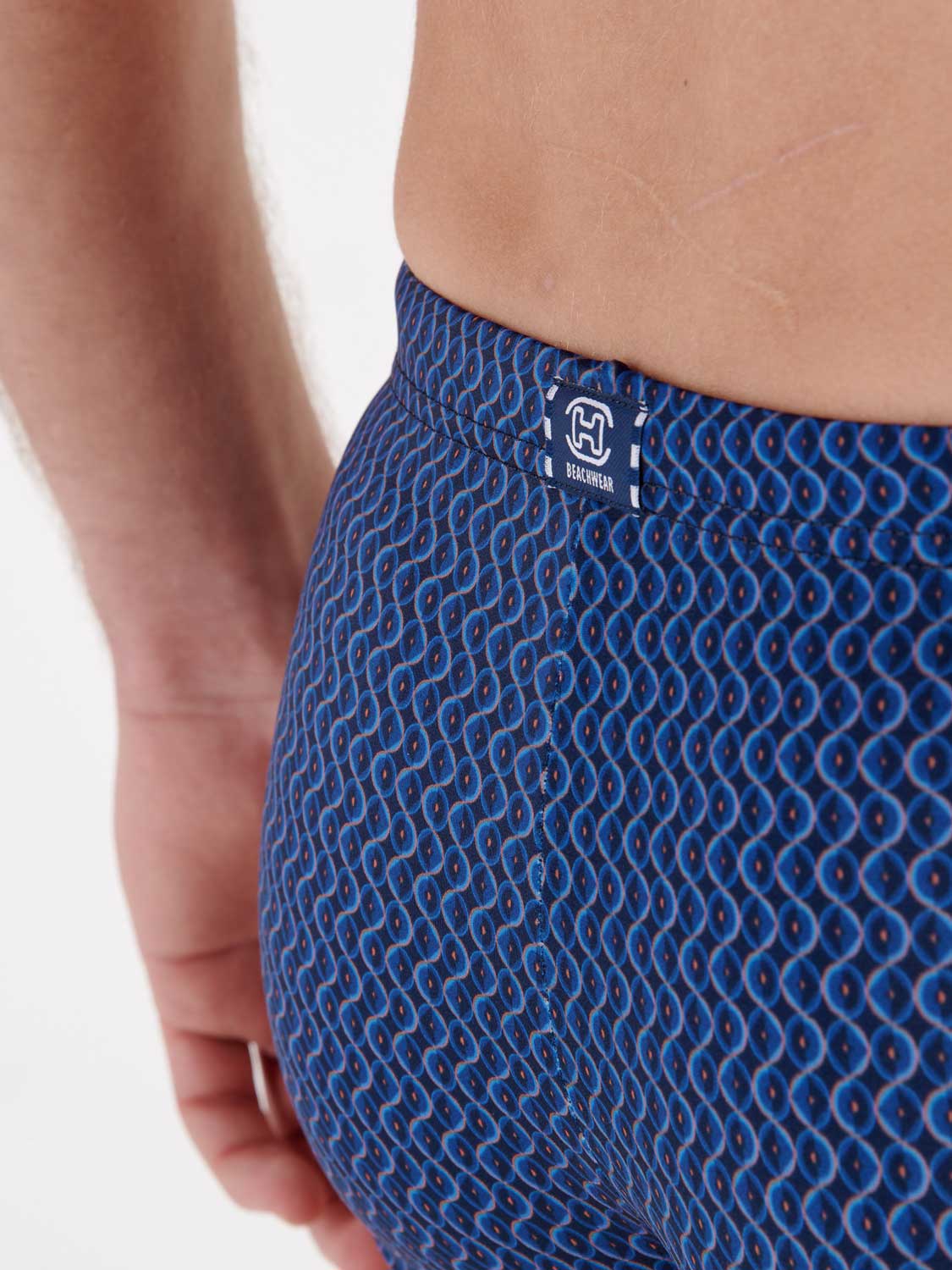 De Morny - Swim Shorts is onderdeel van de HOM zomer zwemcollectie. De zwembroek heeft een subtiele optische print met een golfpatroon op een blauwe achtergrond. De stof is elastisch en sluit daarmee mooi aan op de huid en schijnt niet door. Met het trekkoord in de heupband breng je de zwemshort perfect op maat. Een prachtig mode item voor op het strand of in het zwembad.